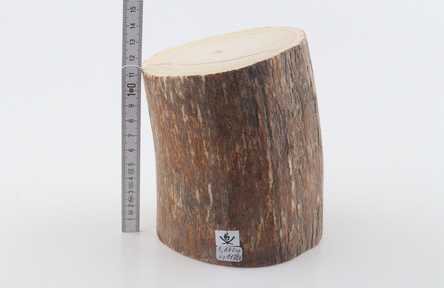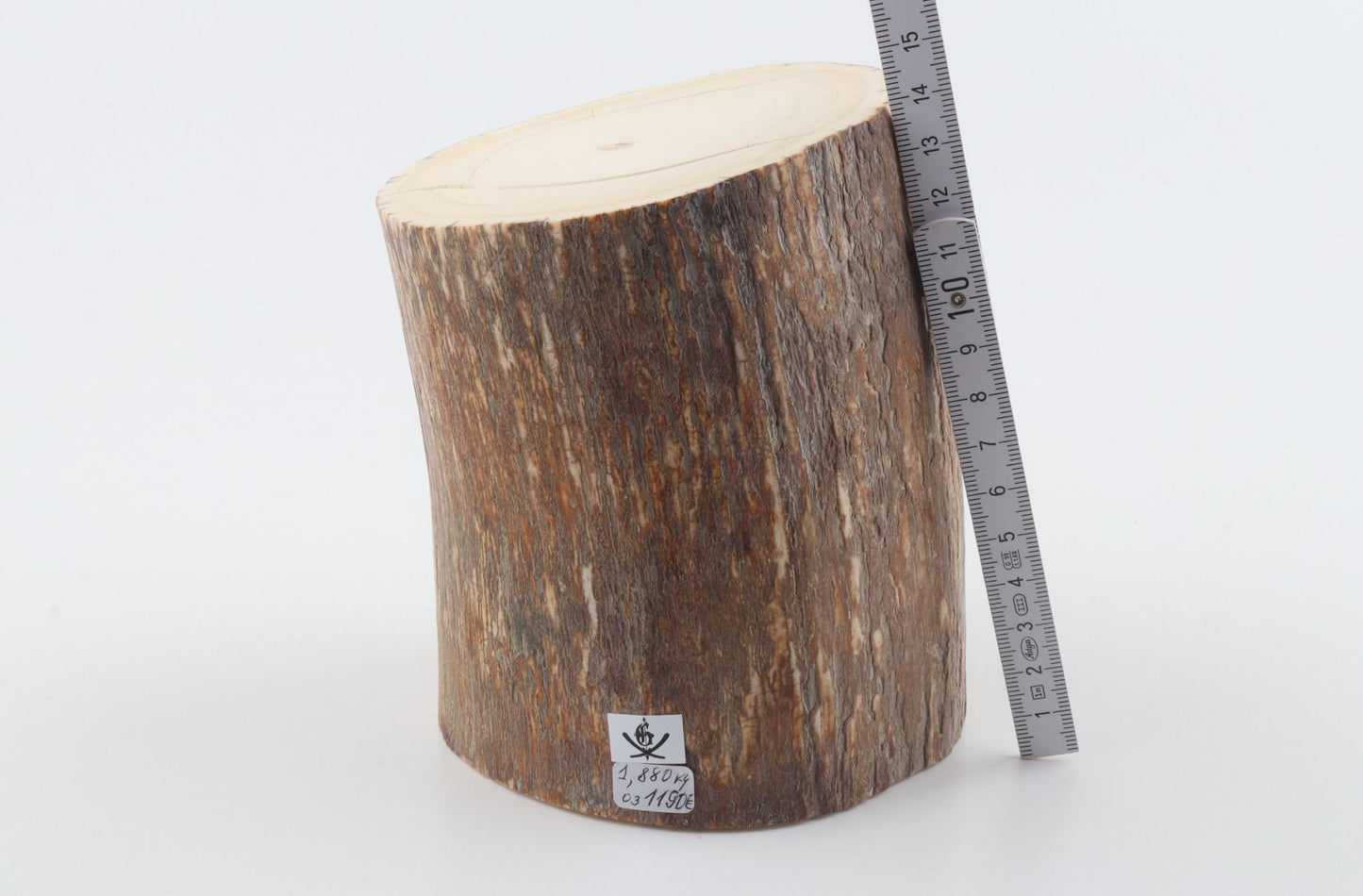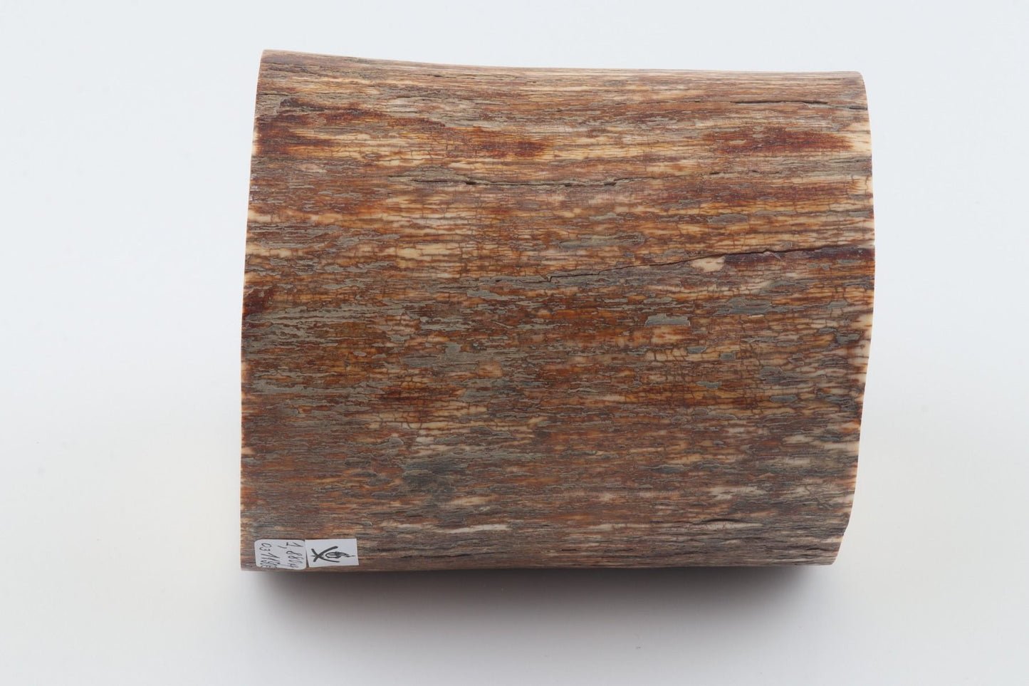 This is a good-quality piece of Siberian woolly mammoth ivory (Mammuthus primigenius). The ivory is rock-solid and completely dry. There are some cracks. One cross-cut section is slightly larger than the other. Plenty of reserves on both ends. Please carefully look at the pictures for precise dimensions. The colour of the ivory is white. The colour of the outer layer of bark is brown-orange.
