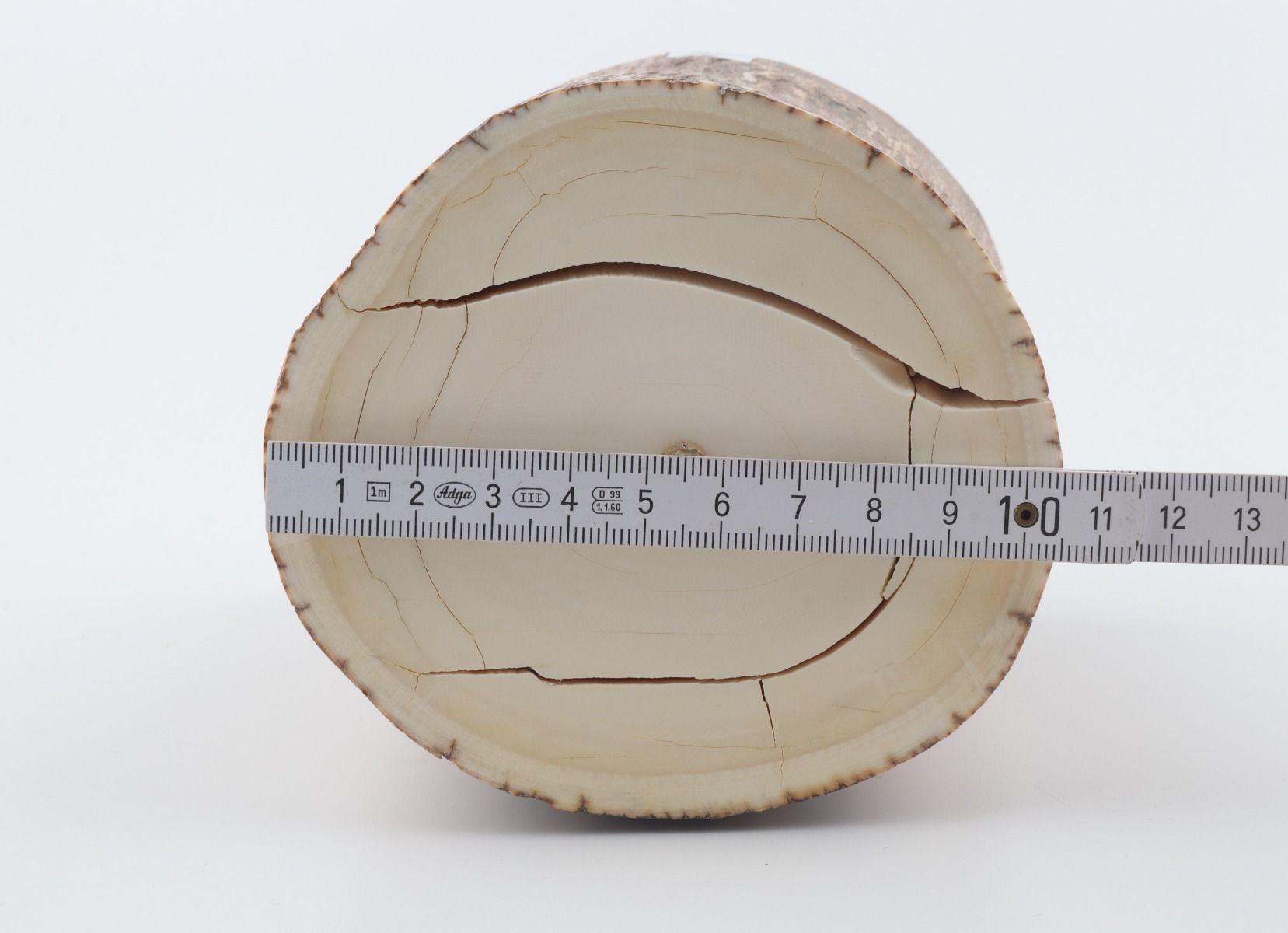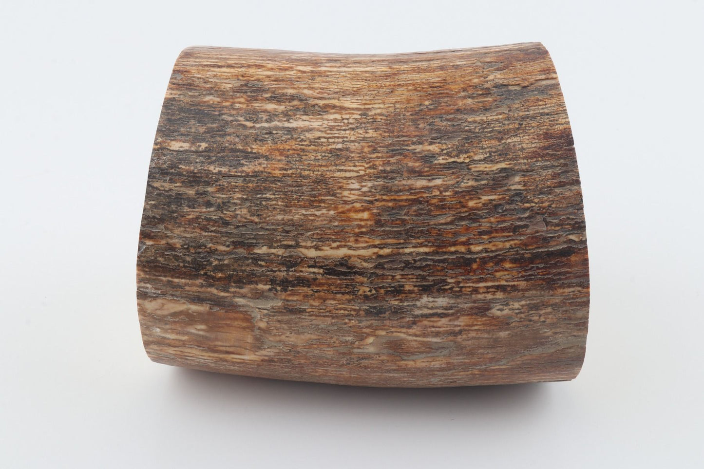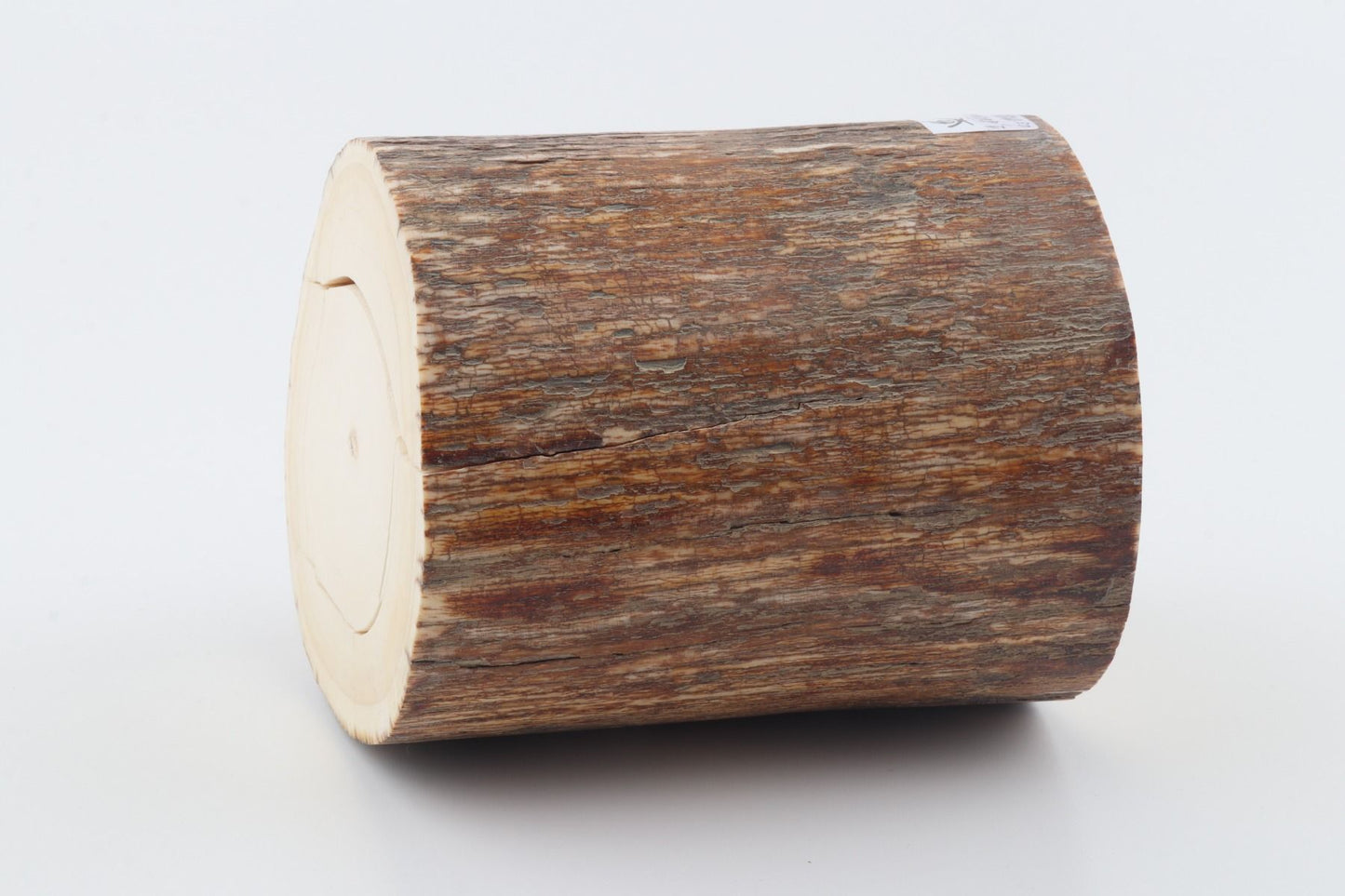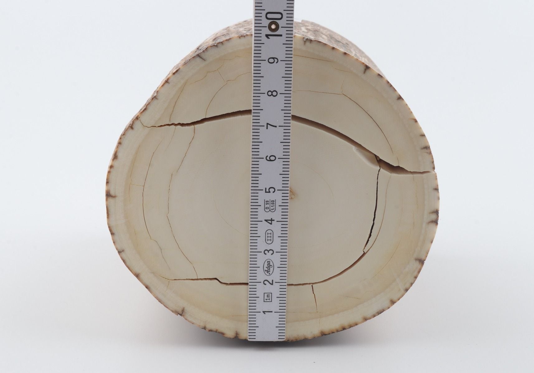 This is a good-quality piece of Siberian woolly mammoth ivory (Mammuthus primigenius). The ivory is rock-solid and completely dry. There are some cracks. One cross-cut section is slightly larger than the other. Plenty of reserves on both ends. Please carefully look at the pictures for precise dimensions. The colour of the ivory is white. The colour of the outer layer of bark is brown-orange.