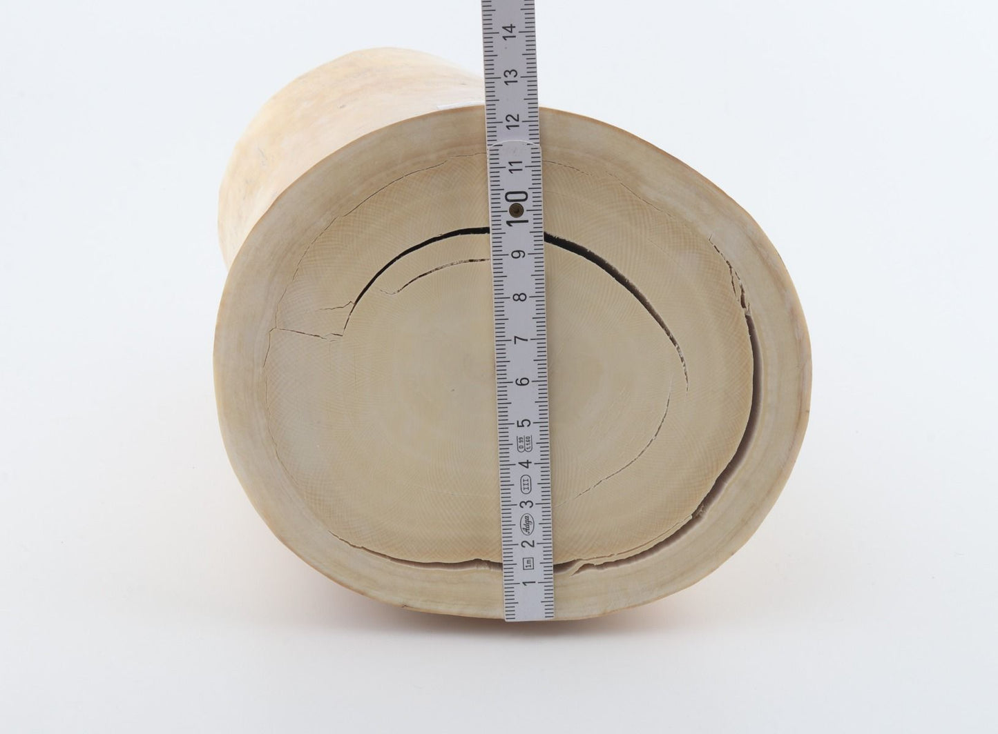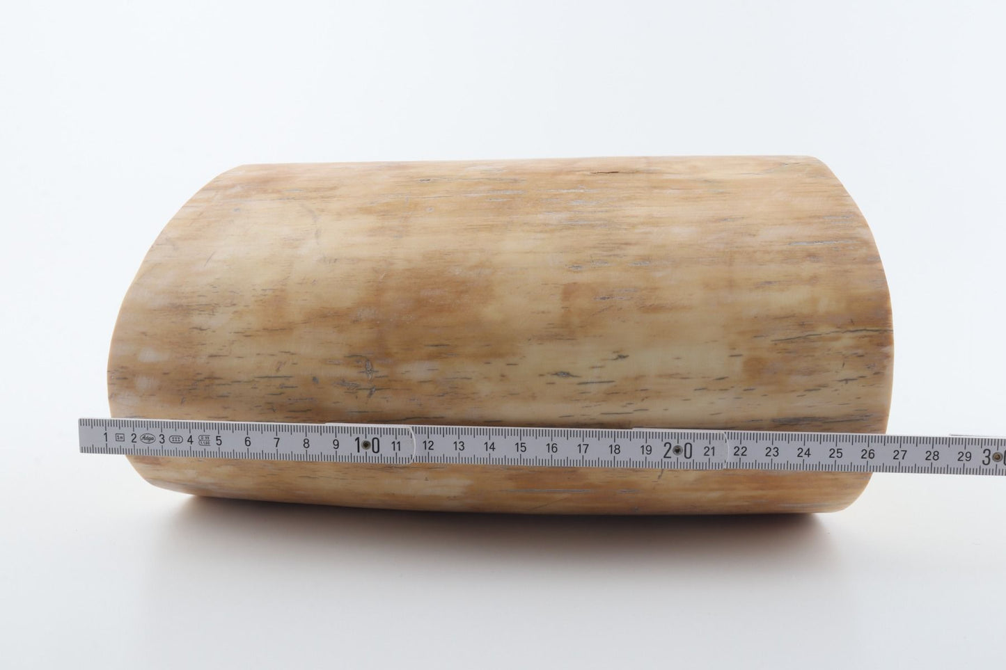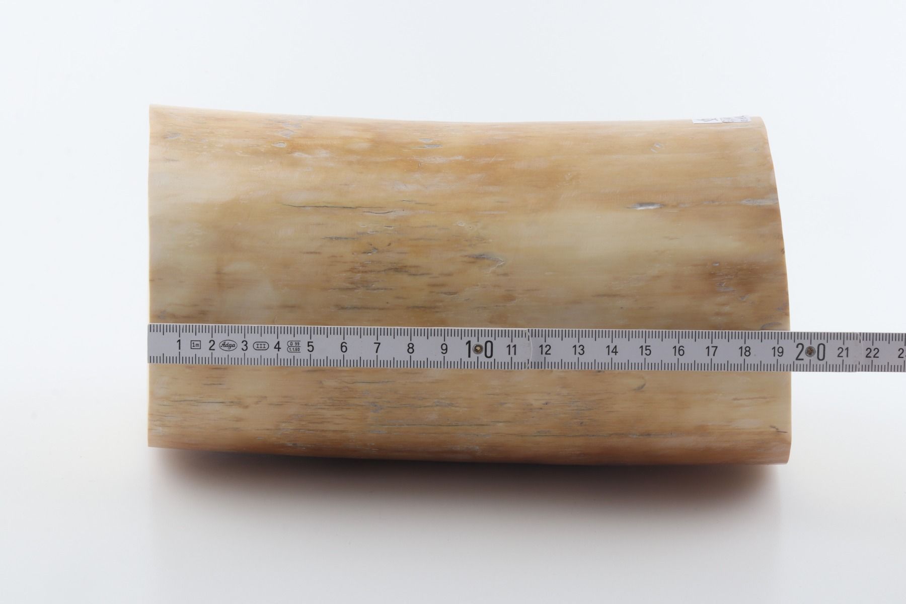 This is a good-quality piece of Siberian woolly mammoth ivory (Mammuthus primigenius). The ivory is rock-solid and completely dry. There are some cracks. Consistent diameter with plenty of top-quality reserves on both ends. Please carefully look at the pictures for precise dimensions. The colour of the ivory is white. The colour of the outer layer of bark is beige.