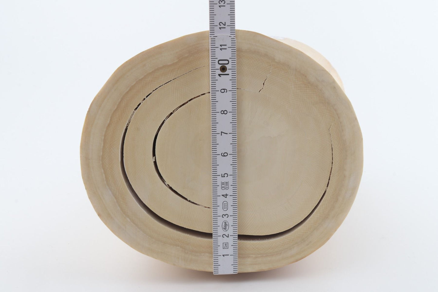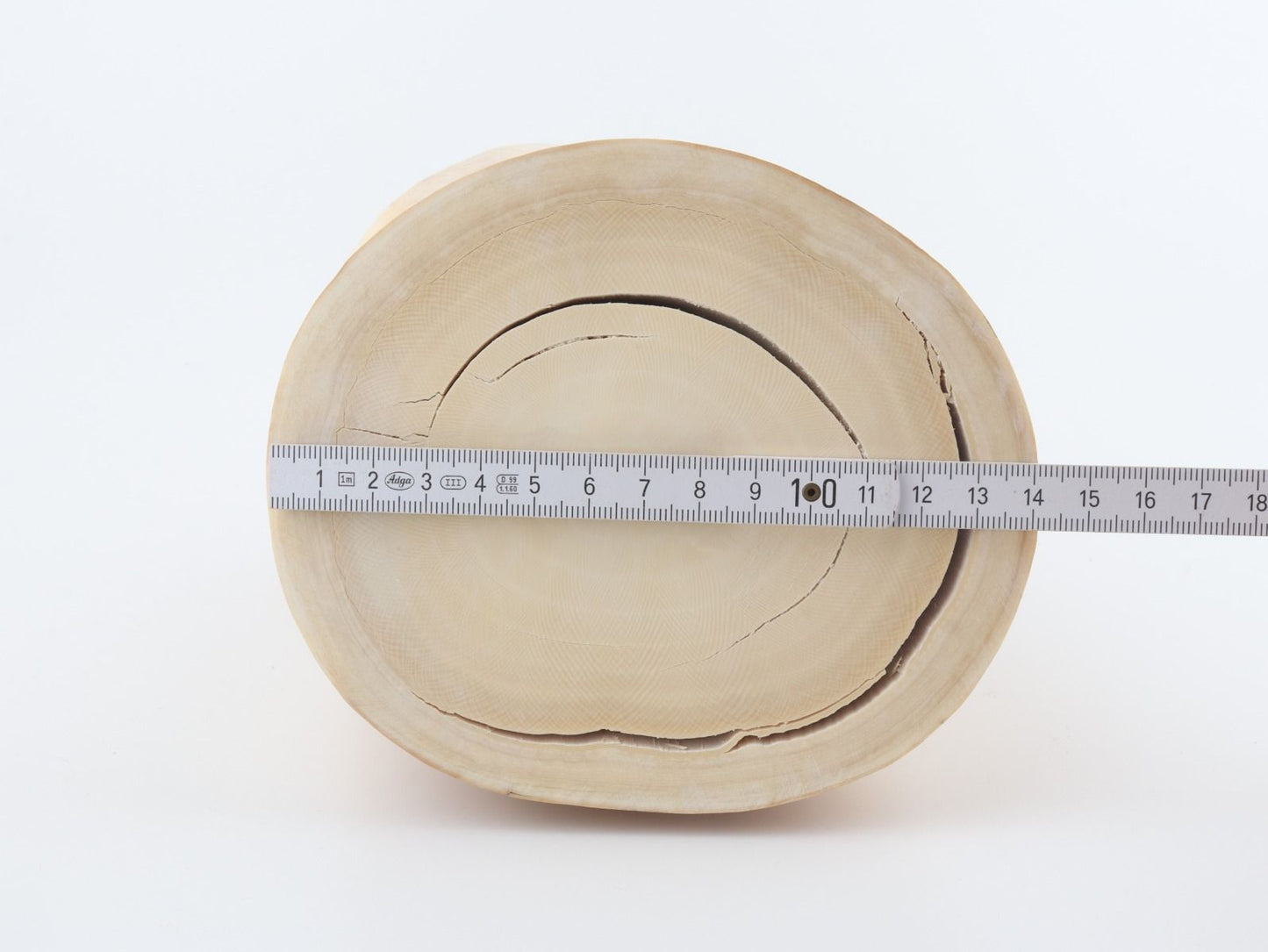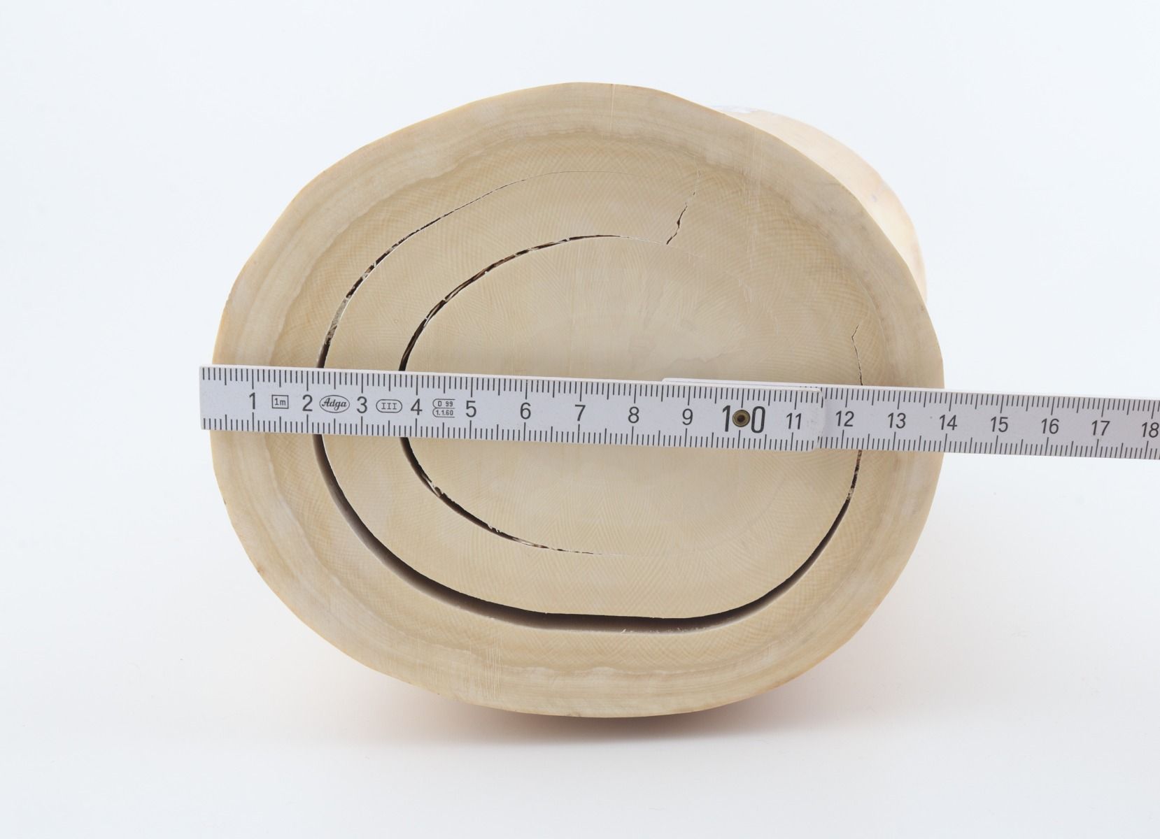 This is a good-quality piece of Siberian woolly mammoth ivory (Mammuthus primigenius). The ivory is rock-solid and completely dry. There are some cracks. Consistent diameter with plenty of top-quality reserves on both ends. Please carefully look at the pictures for precise dimensions. The colour of the ivory is white. The colour of the outer layer of bark is beige.