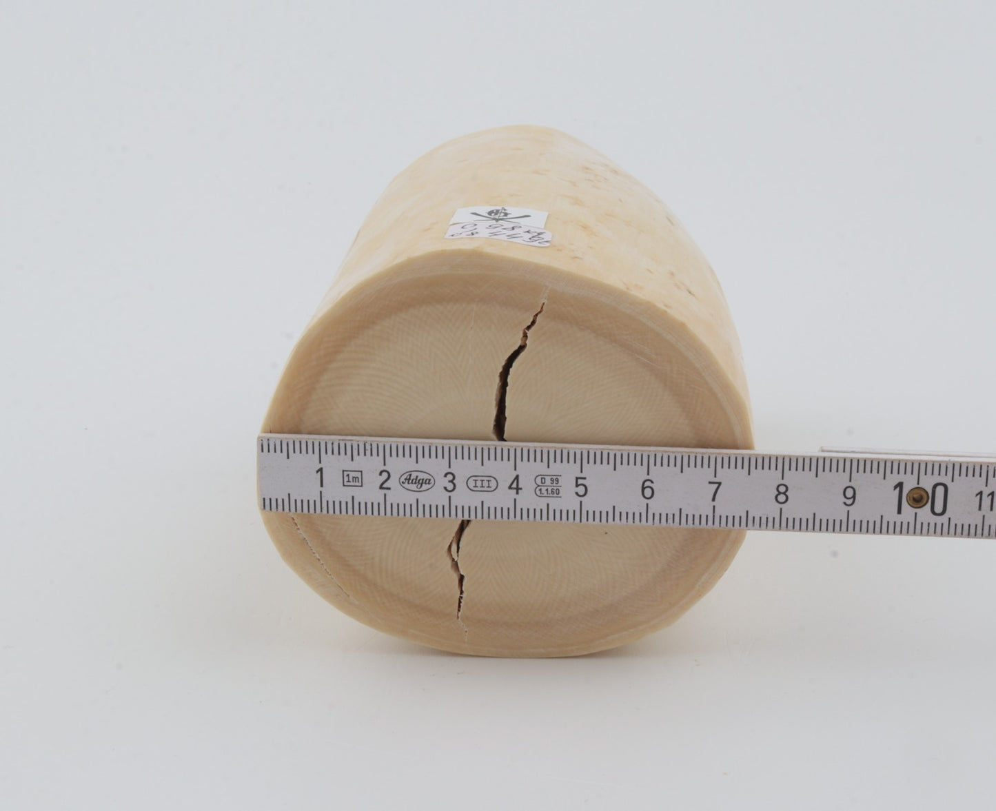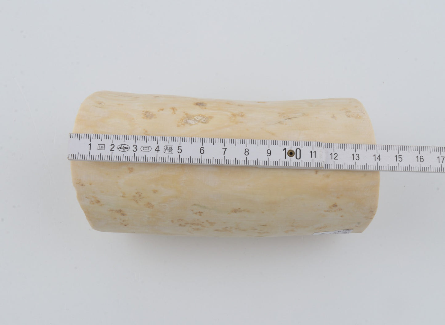 This is a good-quality piece of Siberian woolly mammoth ivory (Mammuthus primigenius). The ivory is rock-solid and completely dry. There are some cracks. One cross-cut section is slightly larger than the other. Plenty of top-quality reserves. Please carefully look at the pictures for precise dimensions. The colour of the ivory is white. The colour of the outer layer of bark is white.