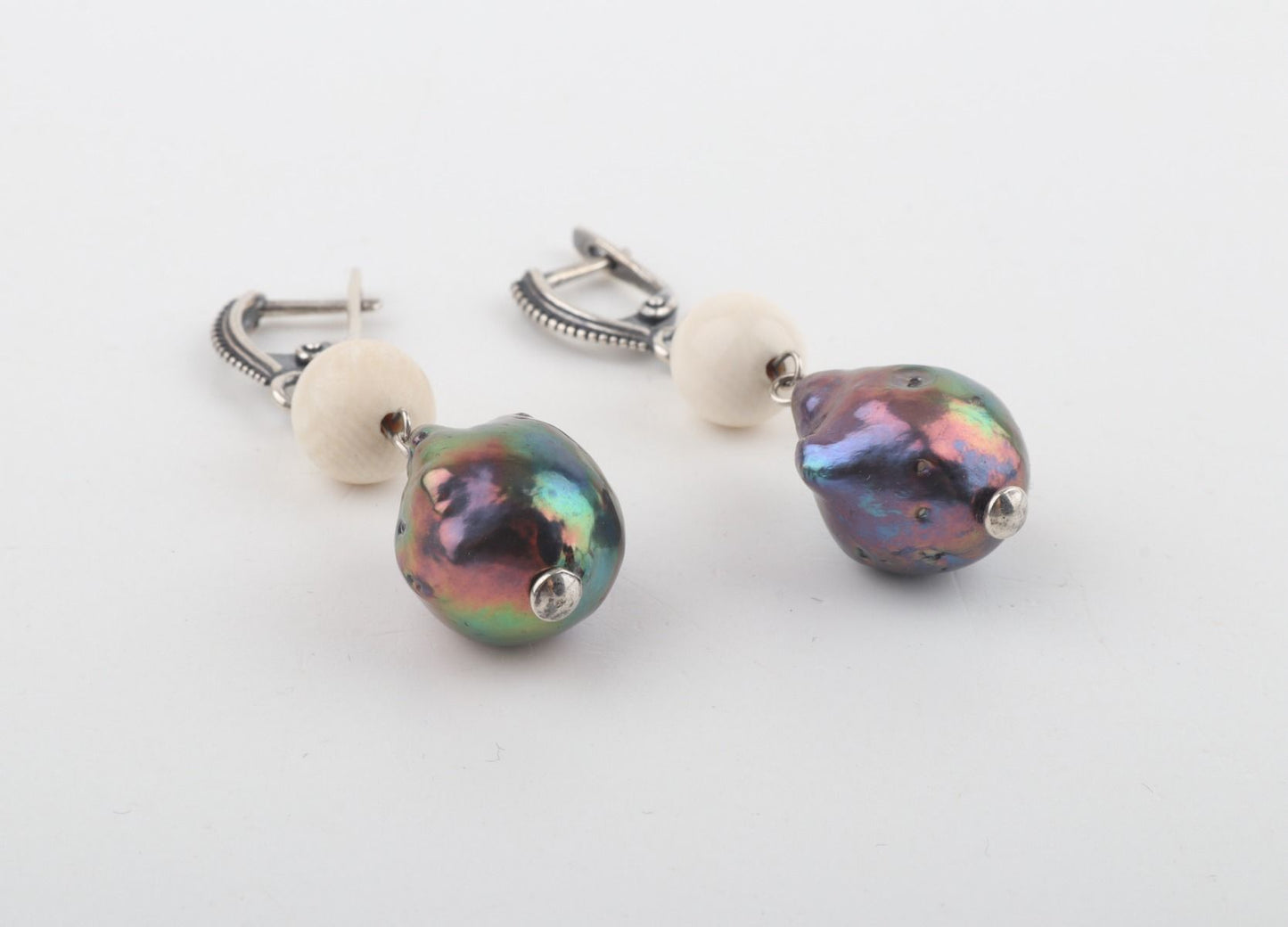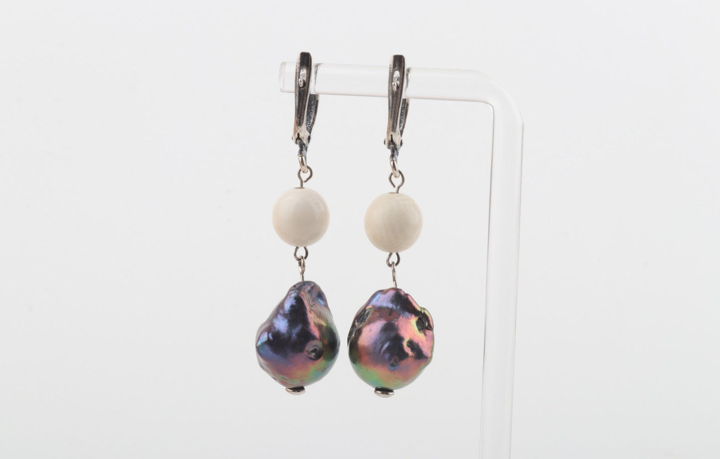 Experience the elegance of the Silver Baroque Earrings, a striking fusion of sophistication and natural beauty. These earrings feature lustrous black baroque freshwater pearls, showcasing unique shapes and captivating iridescence, and paired with genuine mammoth ivory beads (Mammuthus primigenius), material aged over 10,000 years. The design exudes a sense of timeless allure and fascination.