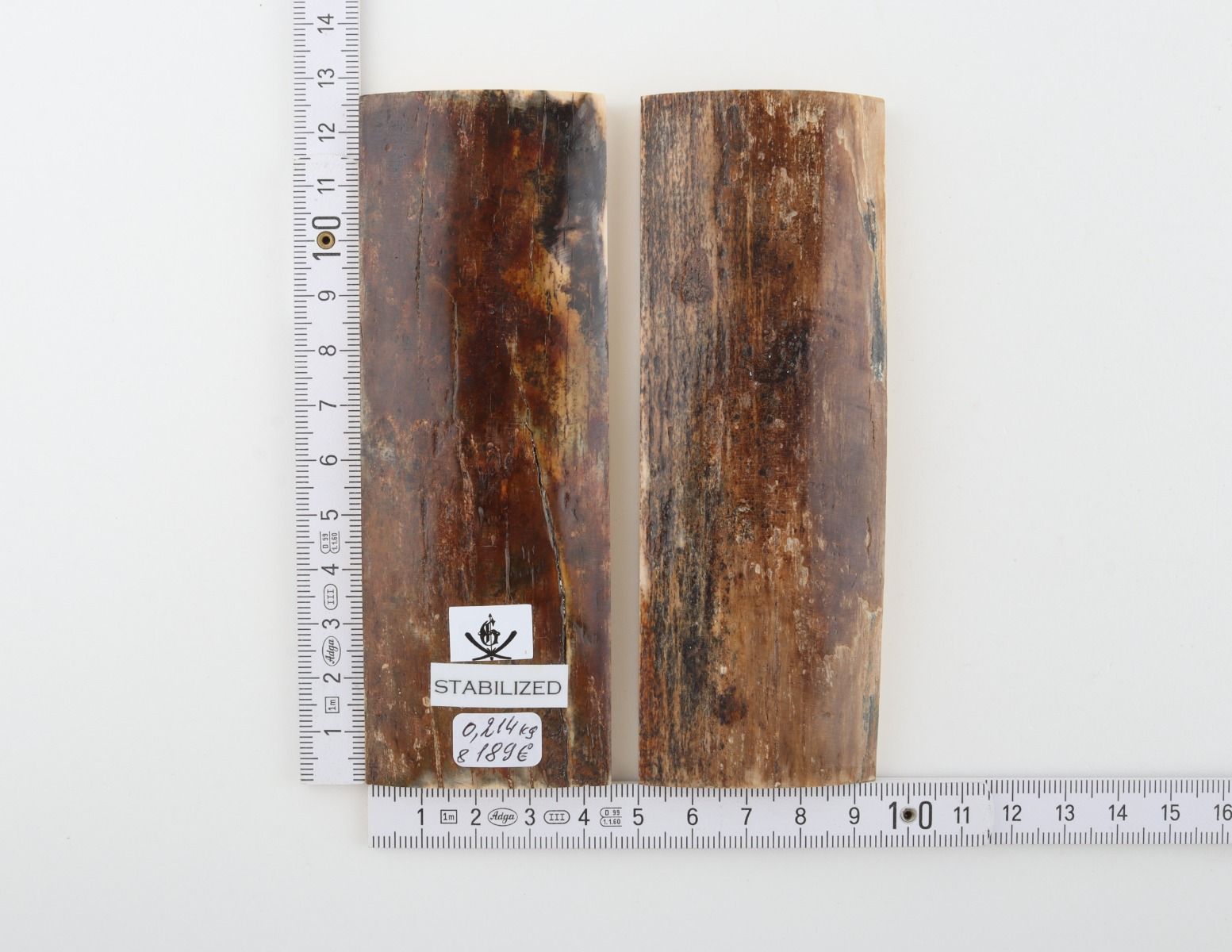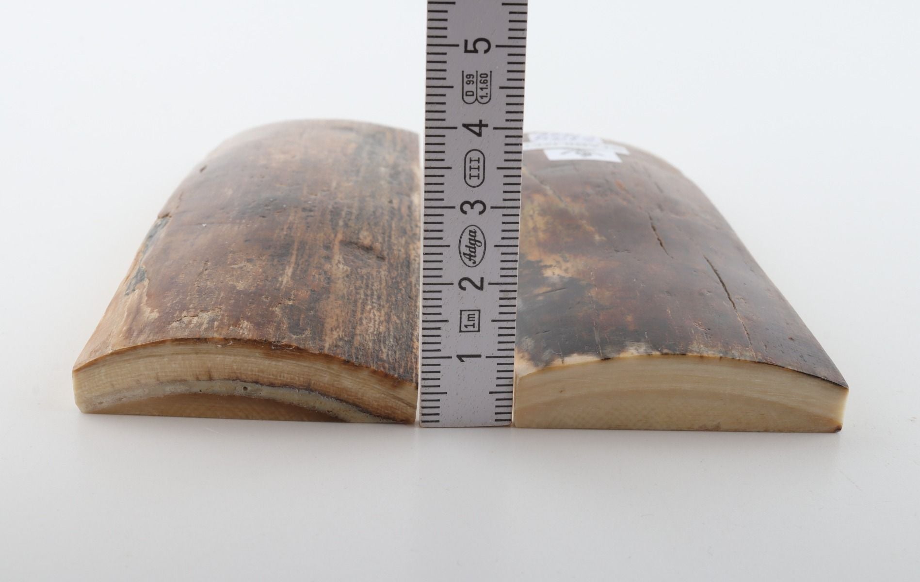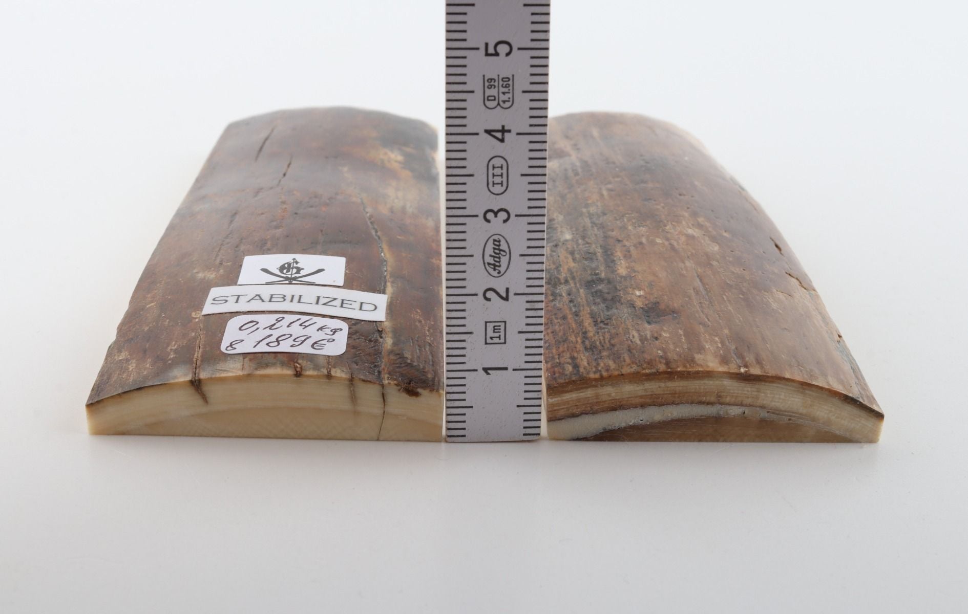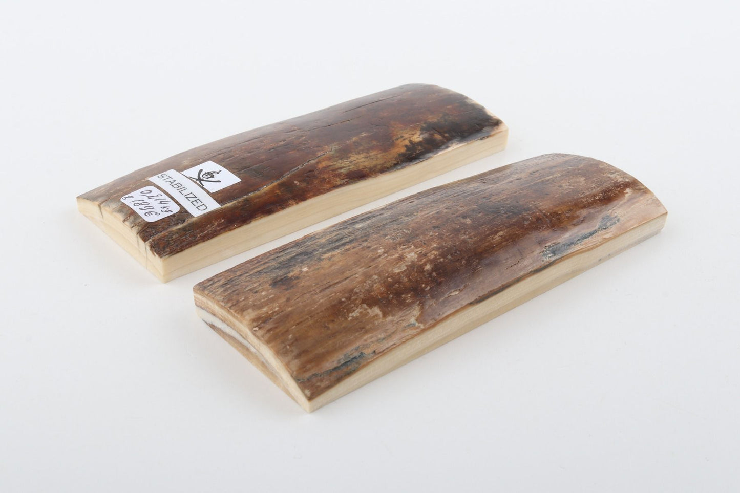 This is a pre-cut pair of stabilized woolly mammoth bark scales (Mammuthus primigenius). These scales can be cut, drilled, sanded, polished etc. to achieve the desired results. Consistent width and thickness with reserves on both ends. The undersides are flat. The colour of the bark is brown-beige.