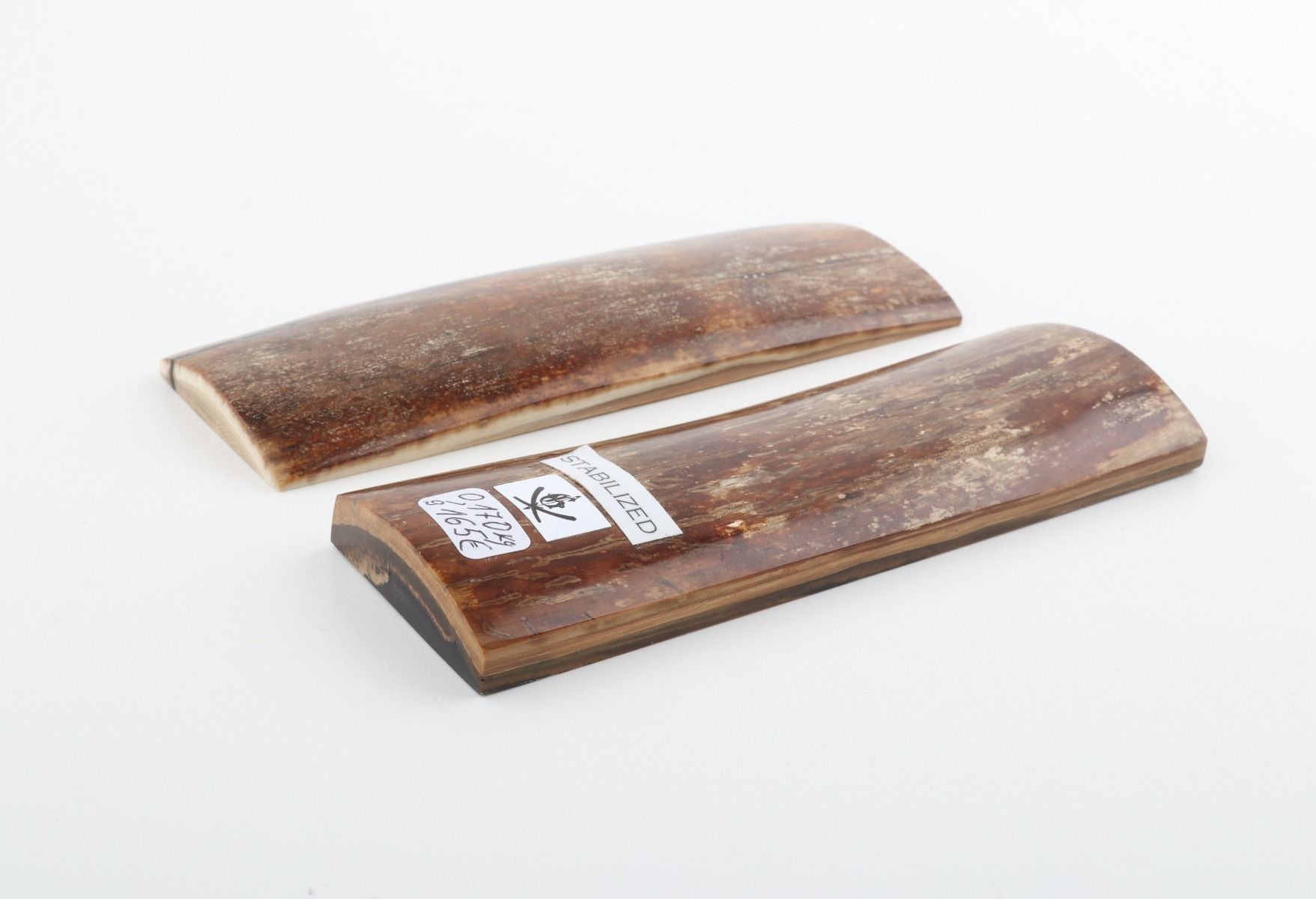 This is a pre-cut pair of stabilized woolly mammoth bark scales (Mammuthus primigenius). These scales can be cut, drilled, sanded, polished etc. to achieve the desired results. Consistent width and thickness with reserves on both ends. The undersides are flat. The colour of the bark is brown.