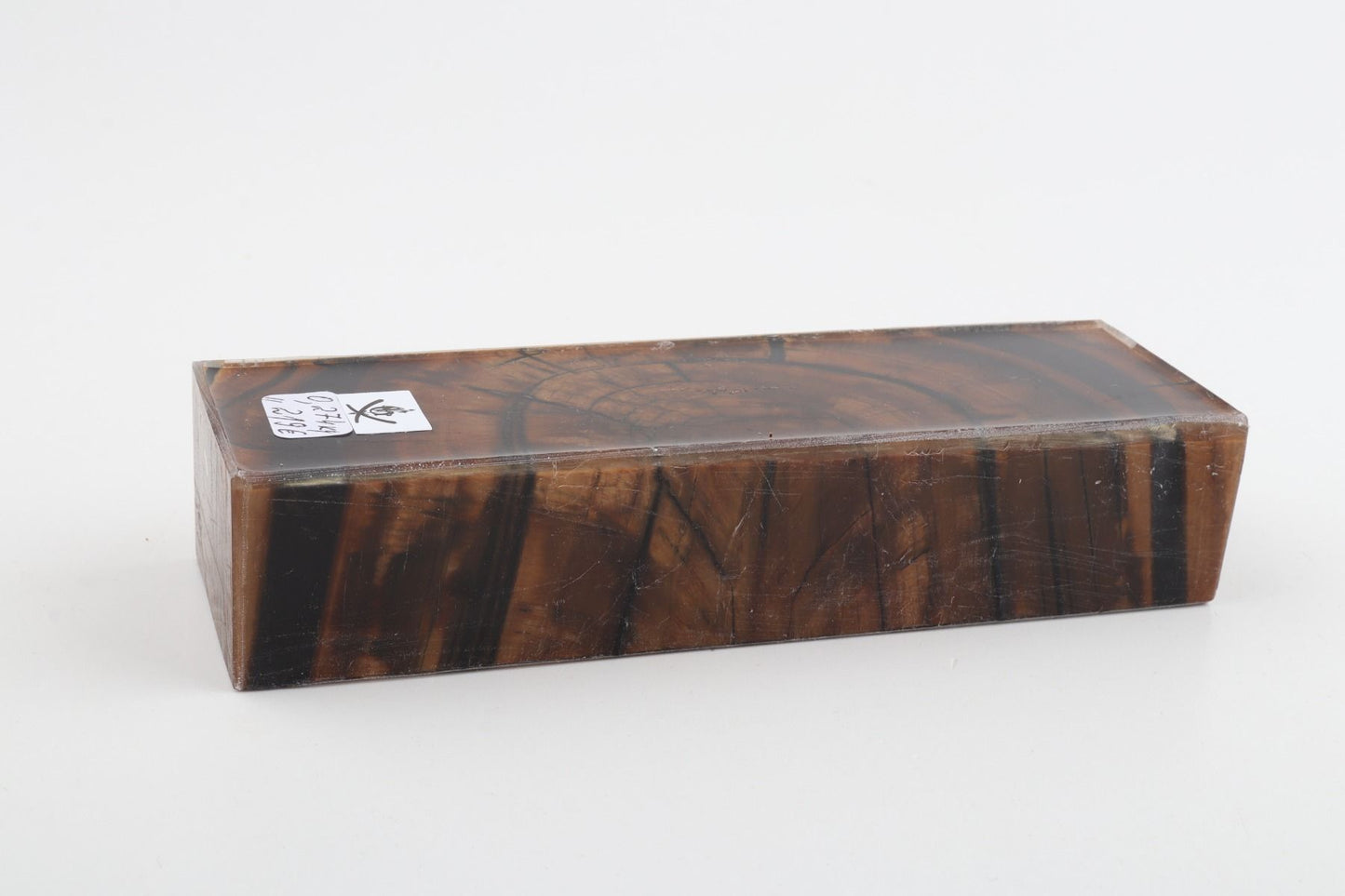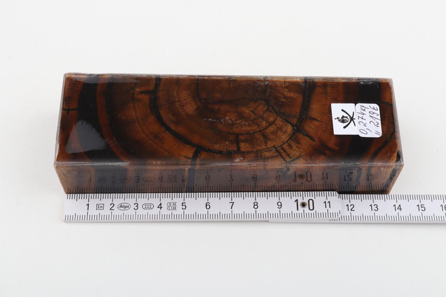 This is a cross-cut stabilised woolly mammoth ivory block (Mammuthus primigenius). This block can be precision-cut, drilled, sanded, polished etc. to achieve the desired results. Consistent width and thickness with reserves on both ends. The colour of the ivory is brown.