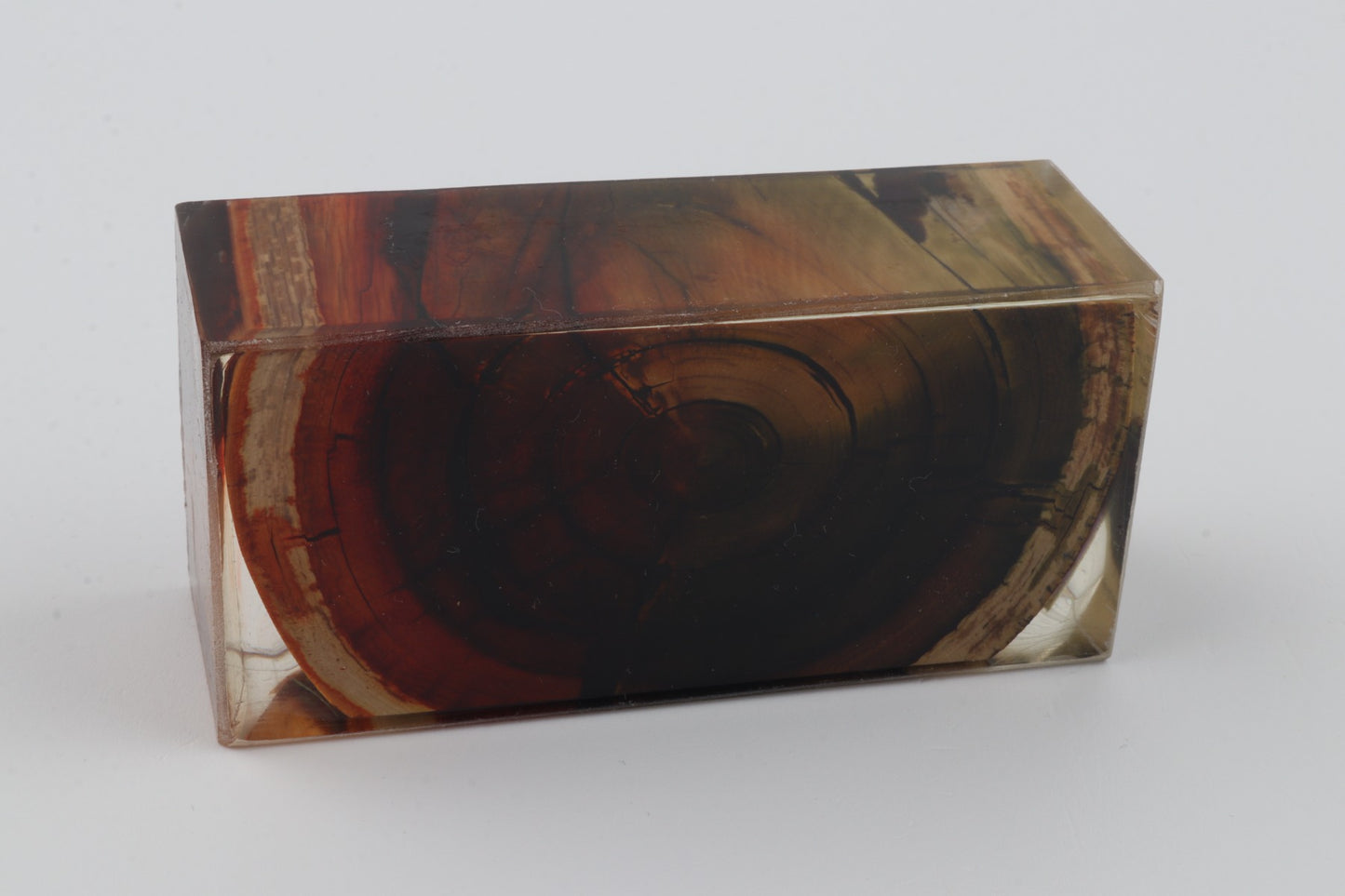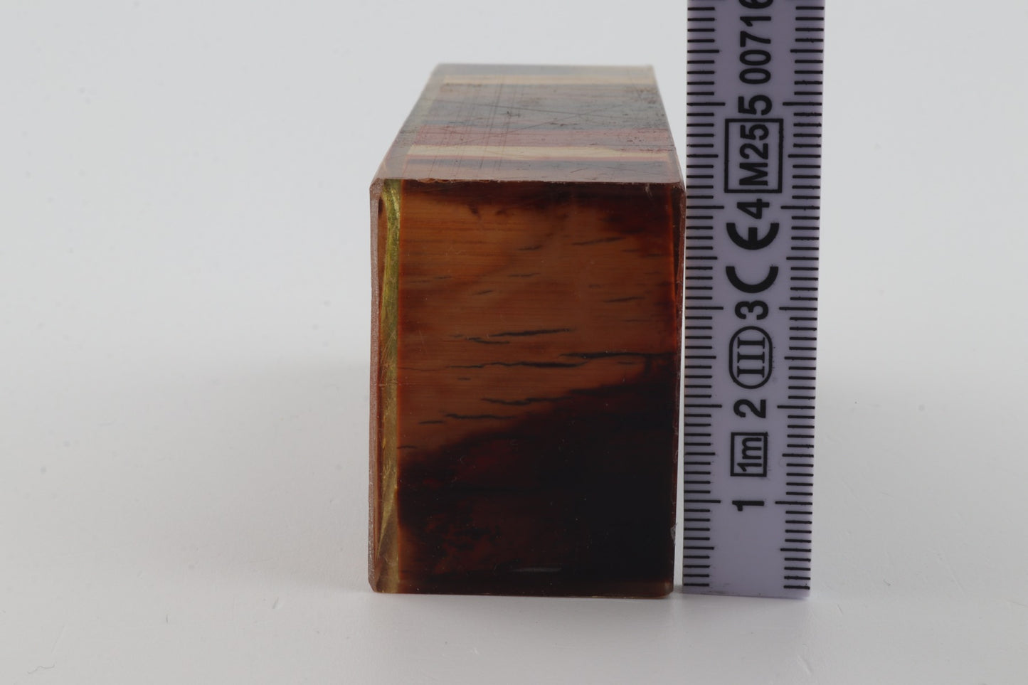 This is a cross-cut stabilised woolly mammoth ivory block (Mammuthus primigenius). This block can be precision-cut, drilled, sanded, polished etc. to achieve the desired results. Consistent width and thickness with reserves on both ends. The colour of the ivory is green-red.