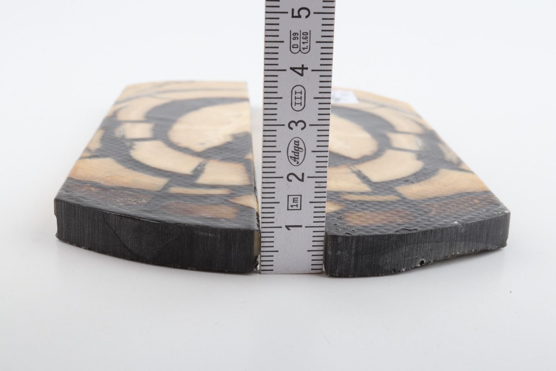 This is a pre-cut pair of stabilised mammoth ivory scales (Mammuthus primigenius). These scales can be precision-cut, drilled, polished, sanded etc. to achieve the desired results. Consistent width and thickness with reserves on both ends. The colour of the ivory is beige.