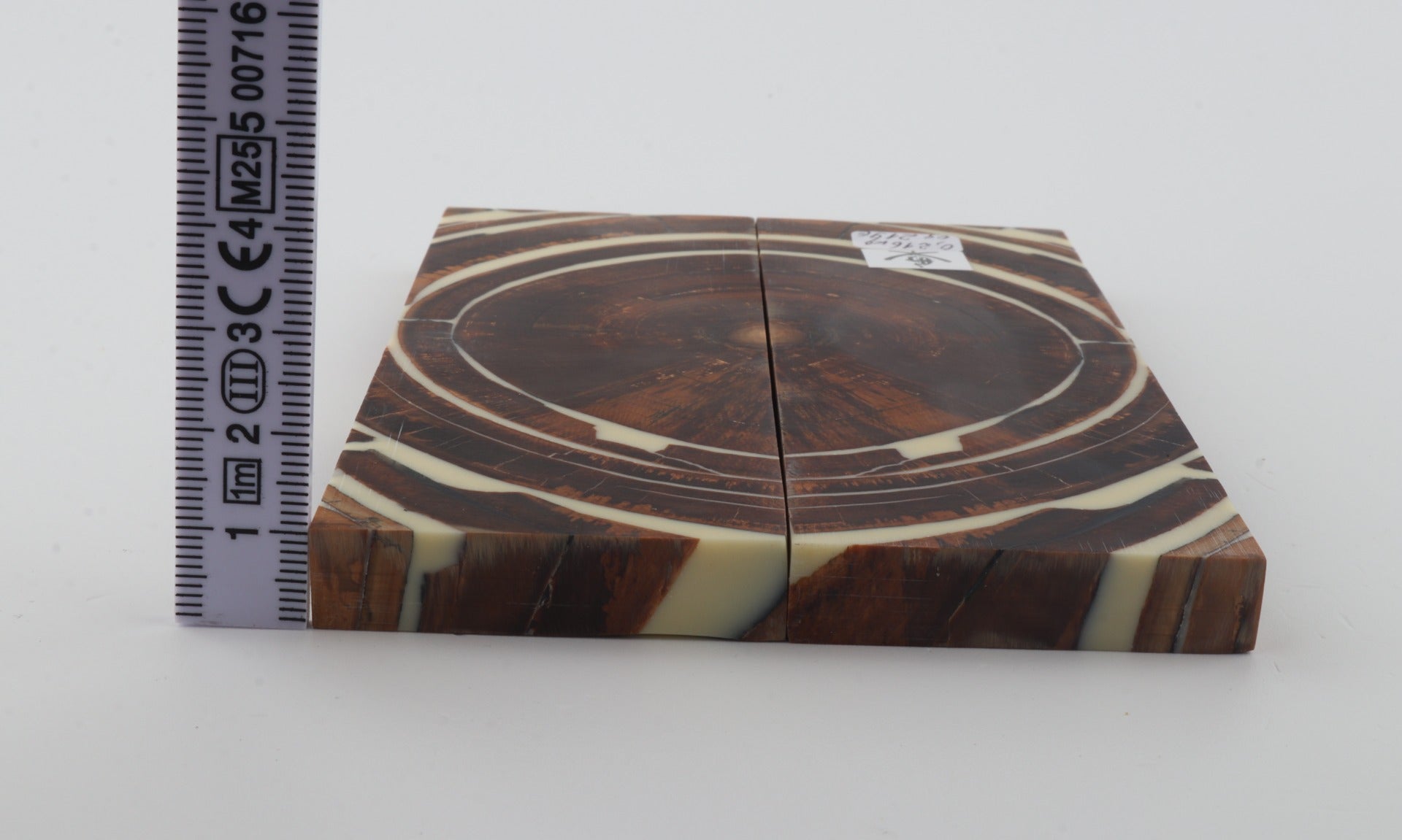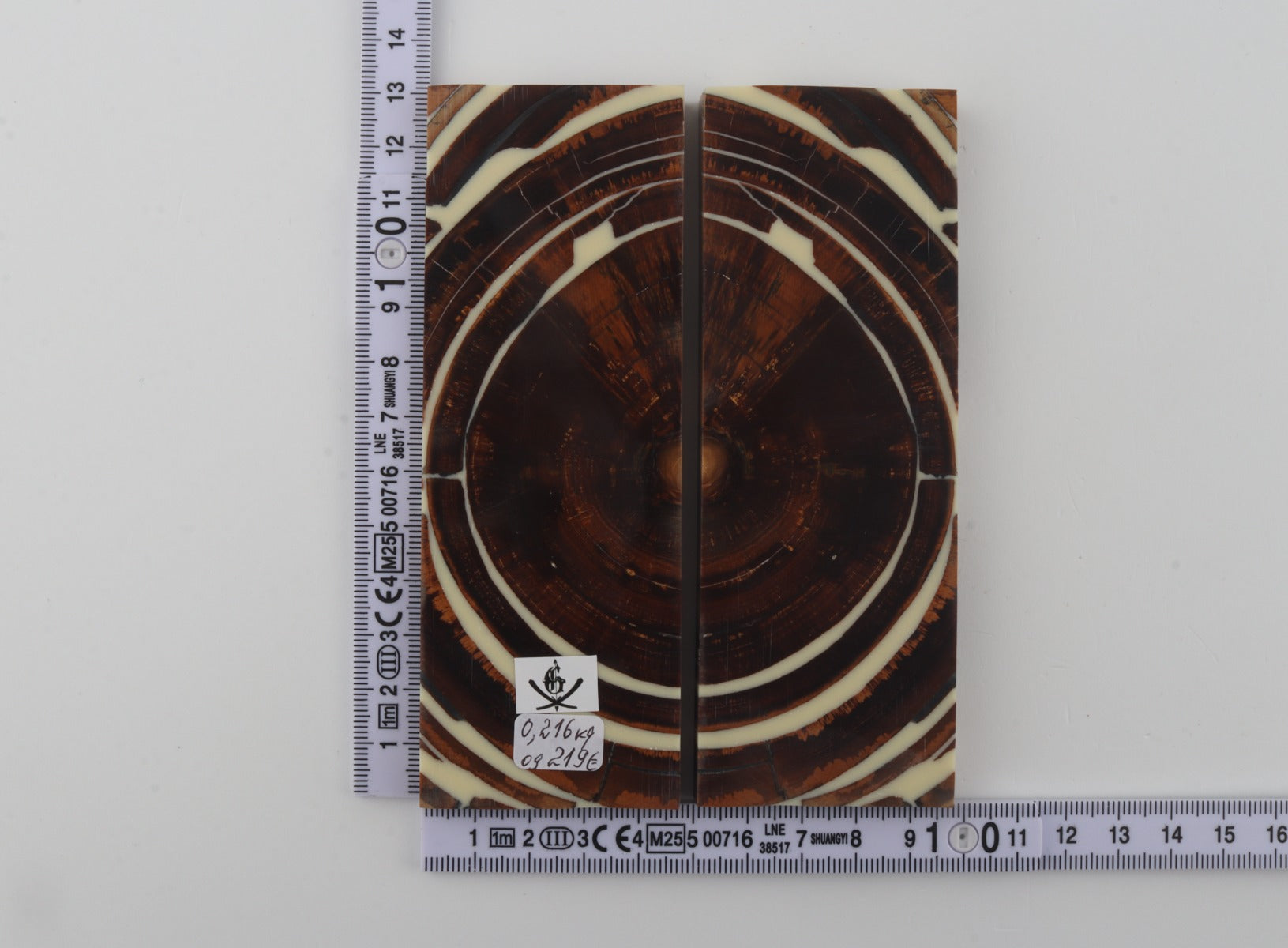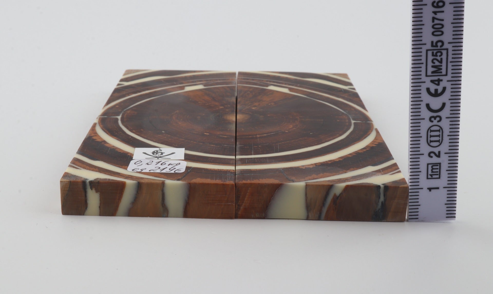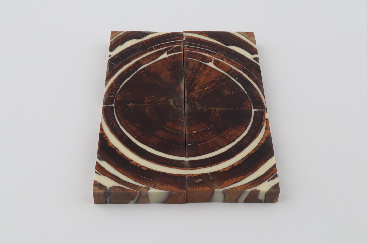 This is a pre-cut pair of stabilized mammoth ivory scales (Mammuthus primigenius). These scales can be precision-cut, drilled, polished, sanded etc. to achieve the desired results. Consistent width and thickness with reserves on both ends. The colour of the ivory is brown.