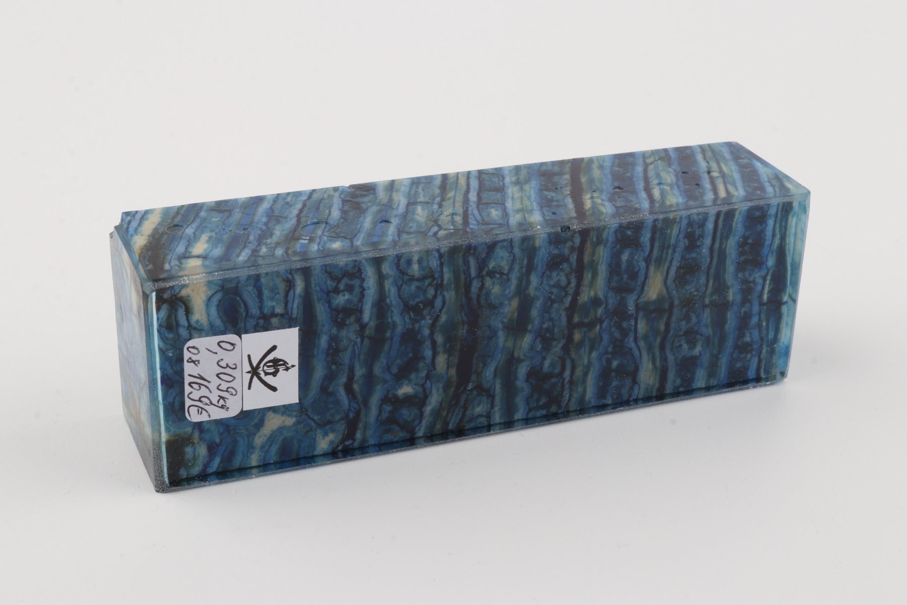 This is a cross-cut, stabilized woolly mammoth molar block (Mammuthus primigenius). This molar block can be precision-cut, drilled, sanded, polished etc. to achieve the desired results. Consistent width and thickness. The colour of the molar is blue.
