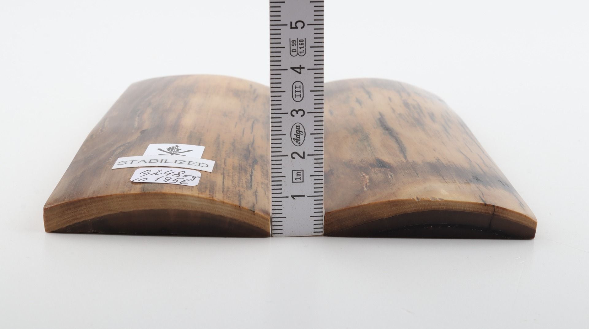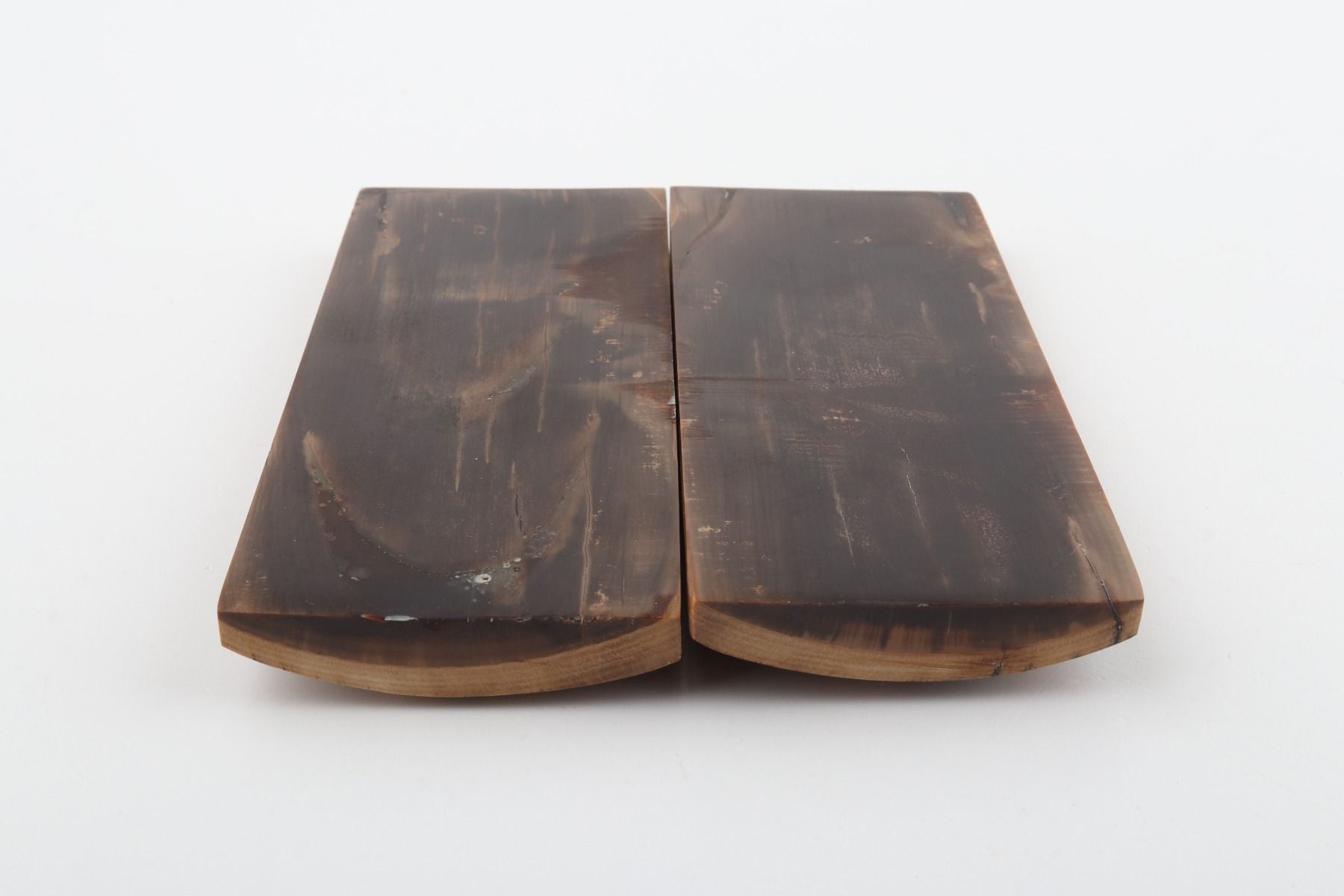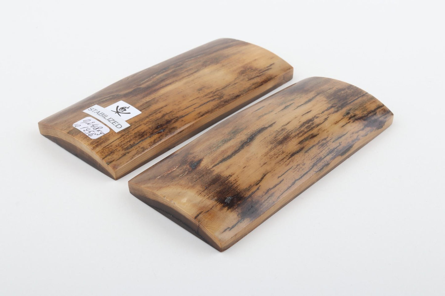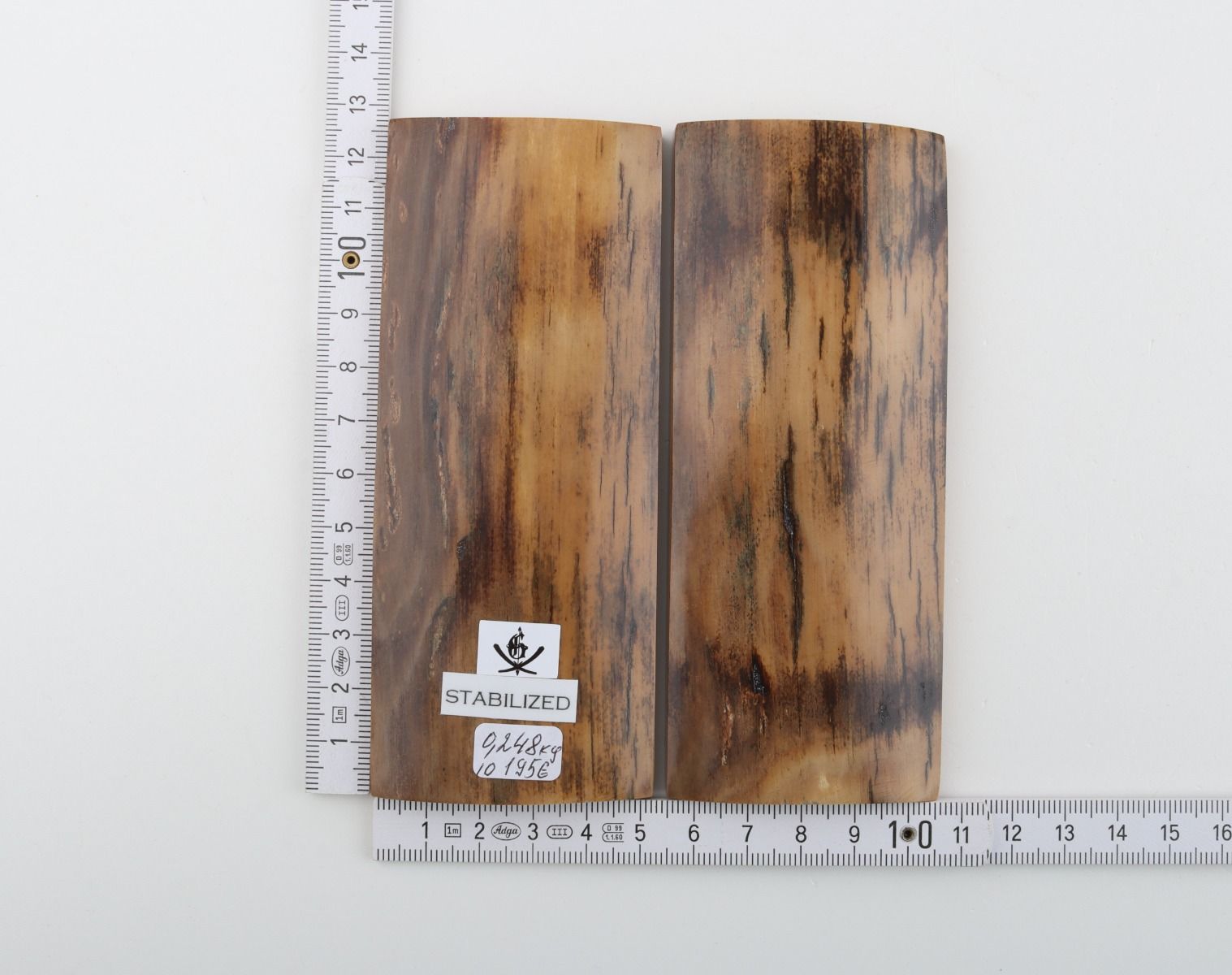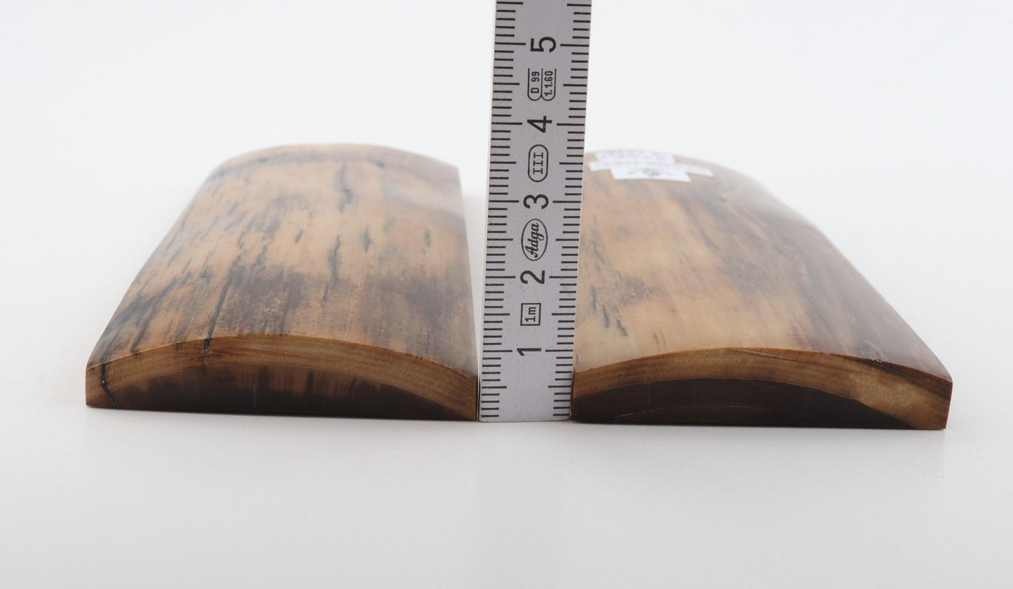 This is a pre-cut pair of stabilized woolly mammoth bark scales (Mammuthus primigenius). These scales can be cut, drilled, sanded, polished etc. to achieve the desired results. Consistent width and thickness with reserves on both ends. The undersides are flat. The colour of the bark is brown-beige.
