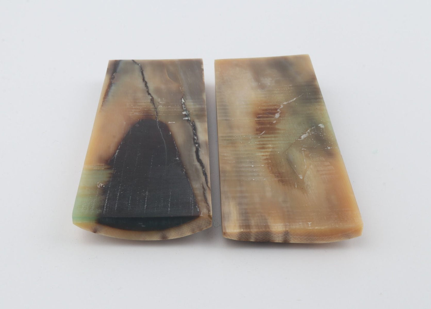 This is a pre-cut pair of stabilized woolly mammoth bark scales (Mammuthus primigenius). These scales can be cut, drilled, sanded, polished etc. to achieve the desired results. Consistent width and thickness with reserves on both ends. The undersides are flat. The colour of the bark is brown-grey.