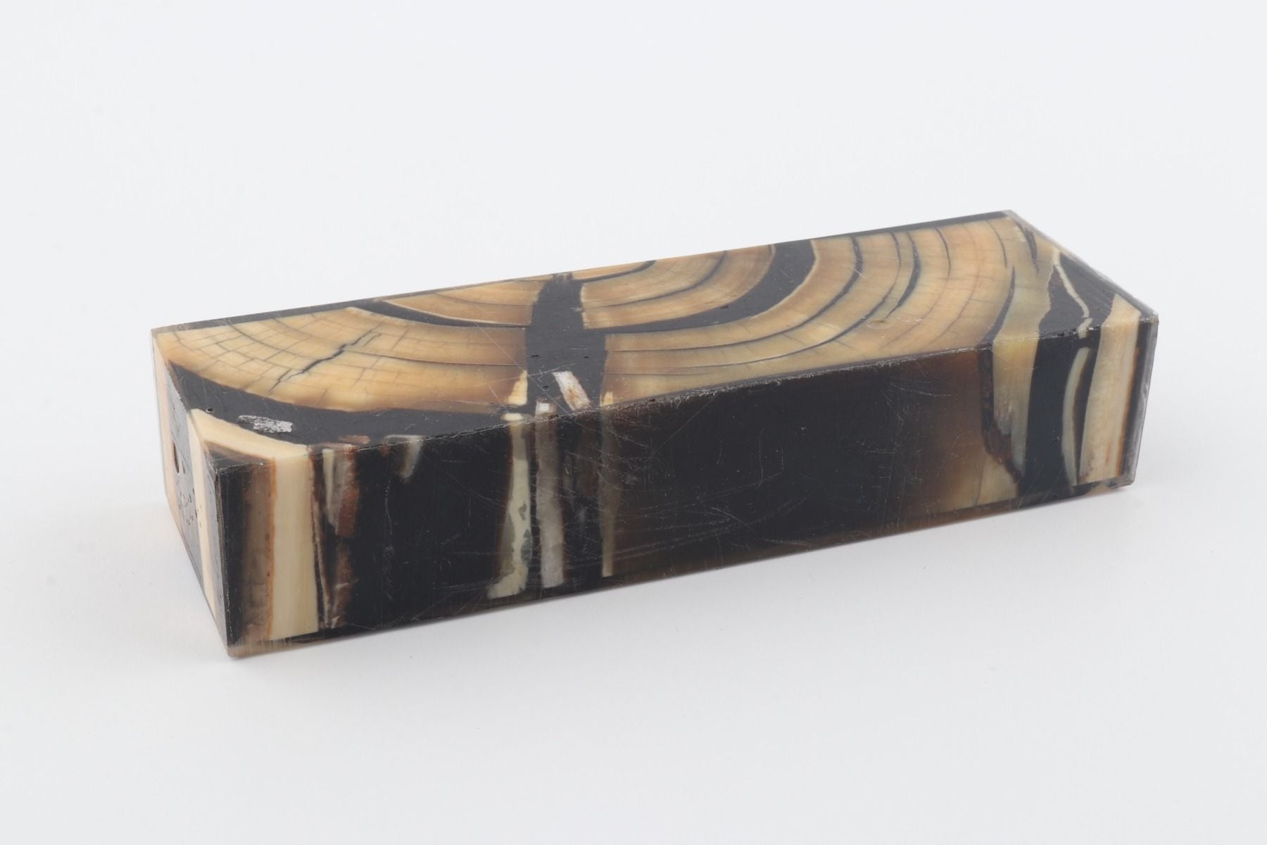 This is a cross-cut stabilized woolly mammoth ivory block (Mammuthus primigenius). This block can be precision-cut, drilled, sanded, polished etc. to achieve the desired results. Consistent width and thickness with reserves on both ends. The colour of the ivory is beige.