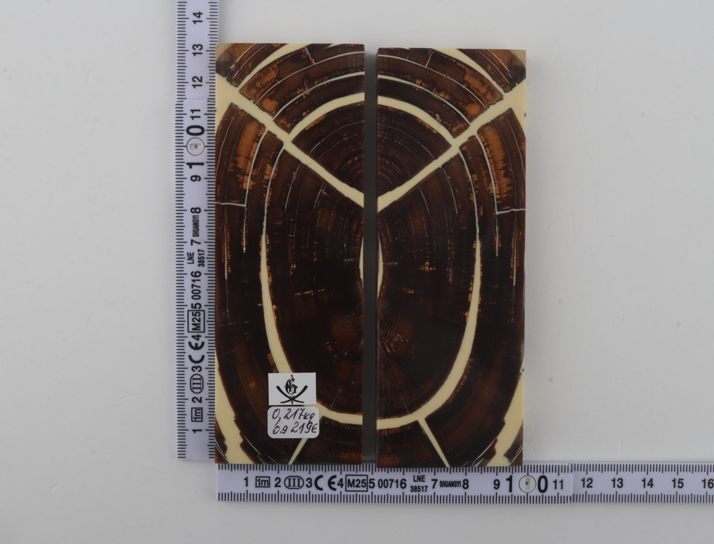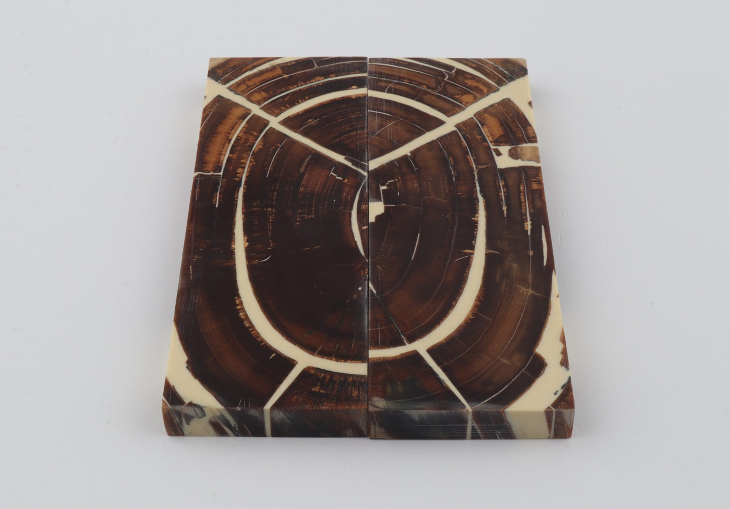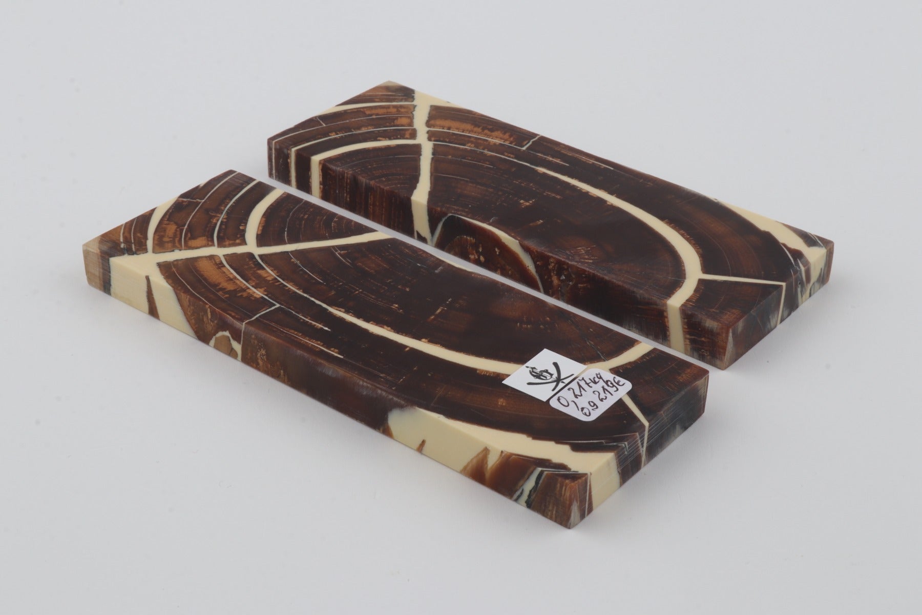 This is a pre-cut pair of stabilized mammoth ivory scales (Mammuthus primigenius). These scales can be precision-cut, drilled, polished, sanded etc. to achieve the desired results. Consistent width and thickness with reserves on both ends. The colour of the ivory is brown.
