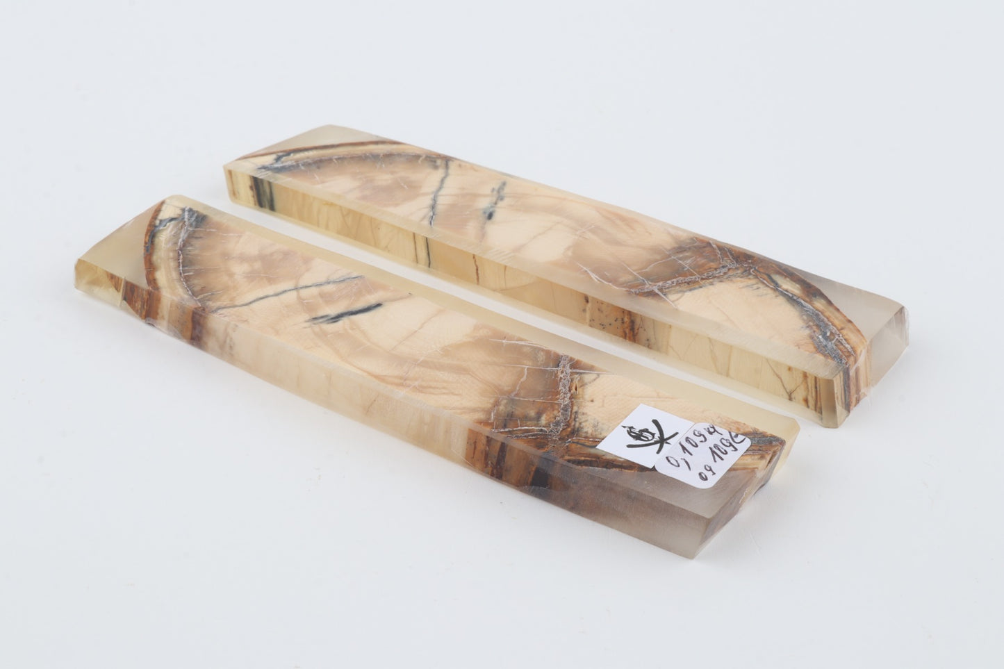This is a pre-cut pair of stabilized mammoth ivory scales (Mammuthus primigenius). These scales can be precision-cut, drilled, polished, sanded etc. to achieve the desired results. Consistent width and thickness with reserves on both ends. Please carefully look at the pictures for precise dimensions. The colour of the ivory is beige-brown.
