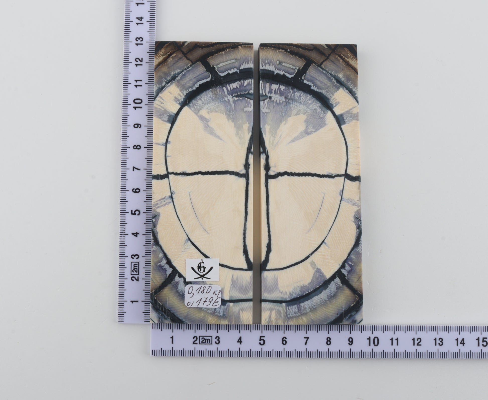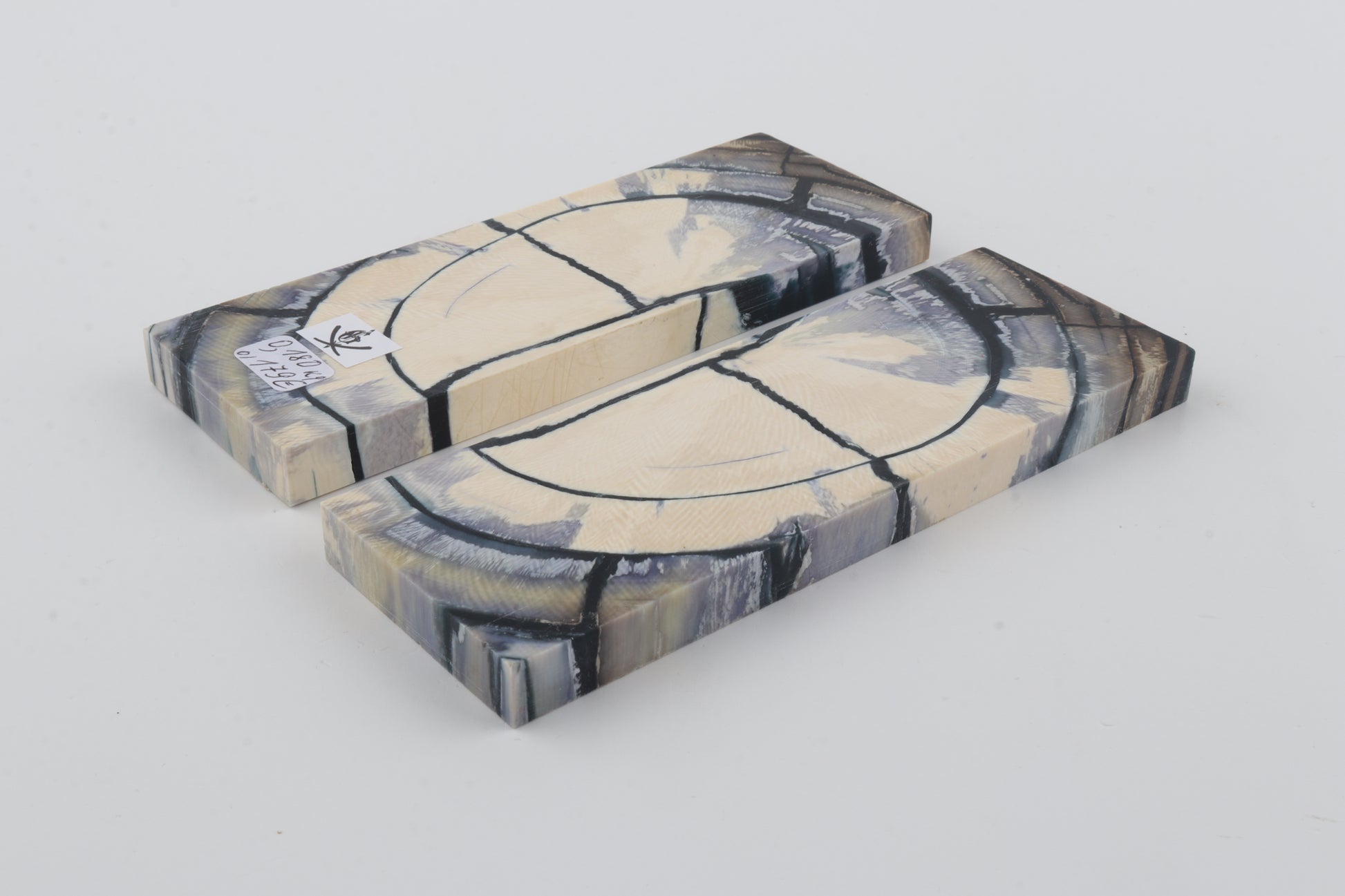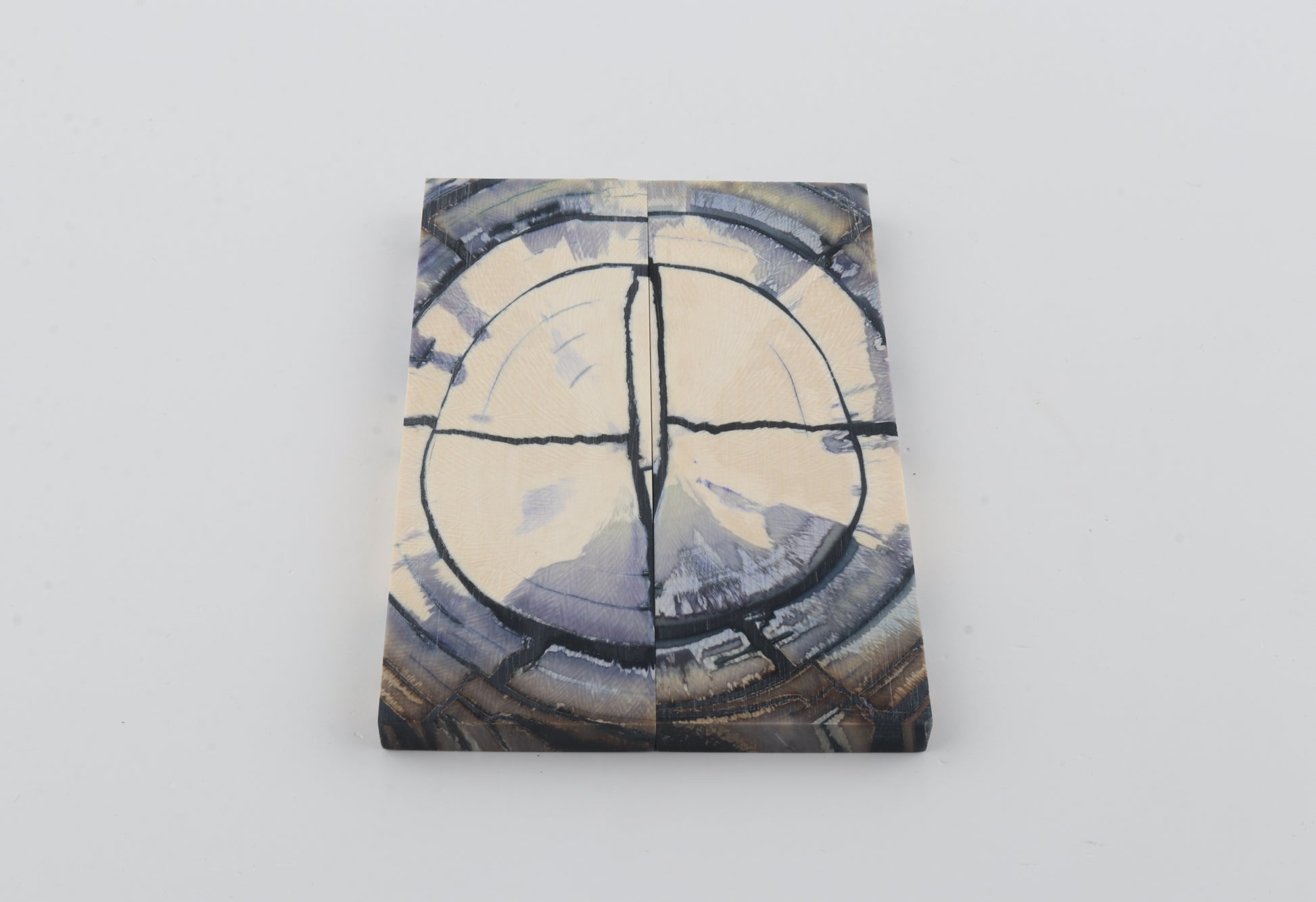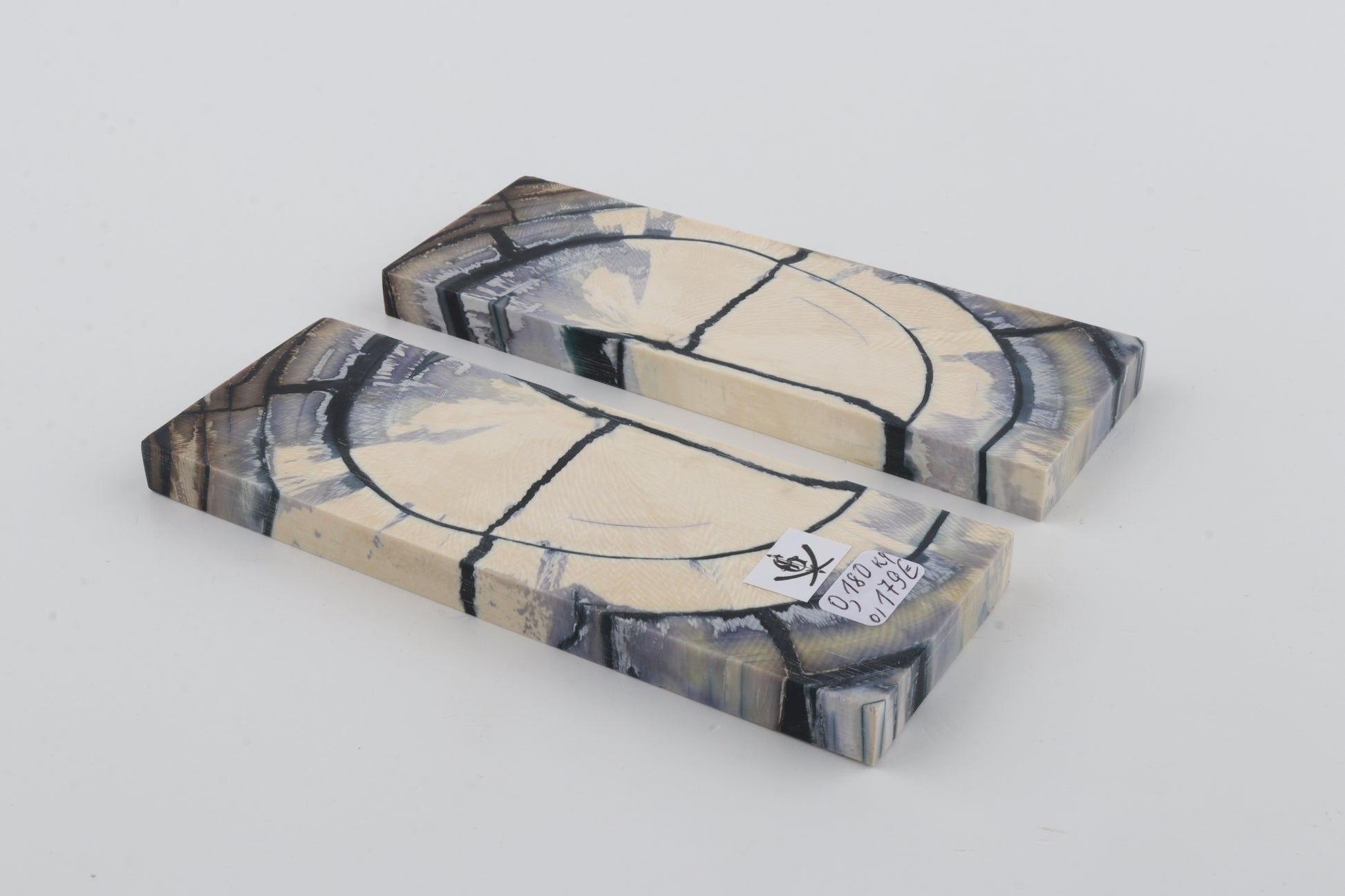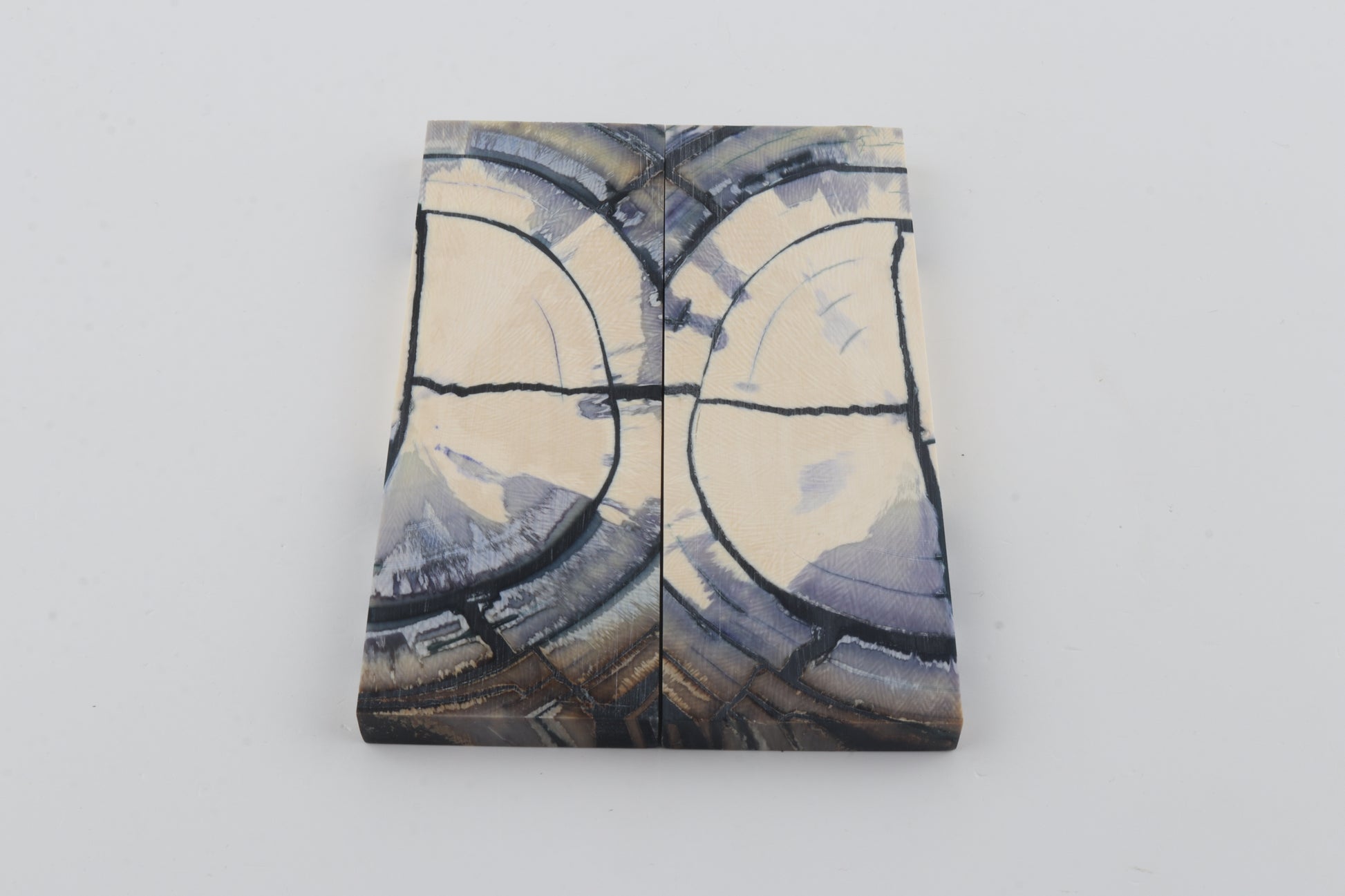 This is a pre-cut pair of stabilized mammoth ivory scales (Mammuthus primigenius). These scales can be precision-cut, drilled, polished, sanded etc. to achieve the desired results. Consistent width and thickness with reserves on both ends. The colour of the ivory is a mix of ivory-creme, blue and grey.