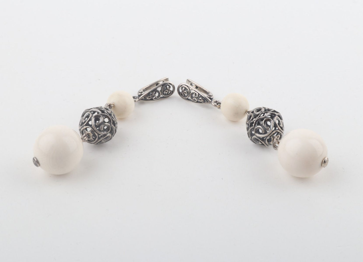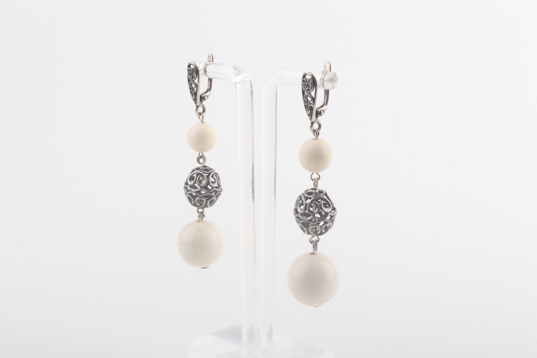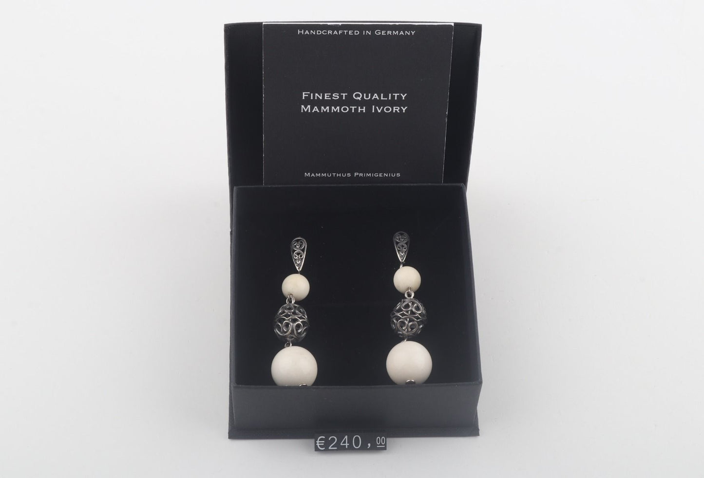 In these earrings, each blackened sterling silver leverback base is complemented by two mammoth ivory pearls (Mammuthus primigenius) and one sterling silver pearl. Very chic and unusual statement for both day and night.