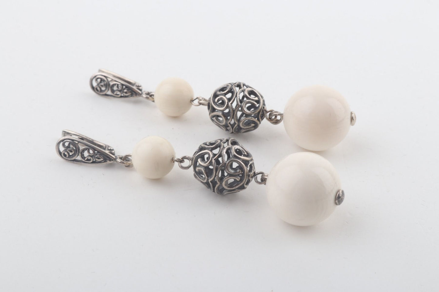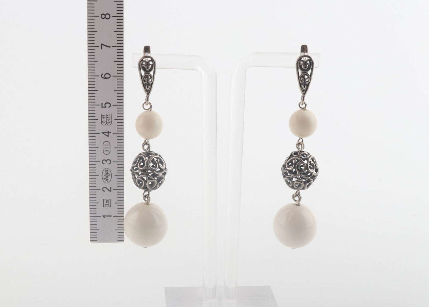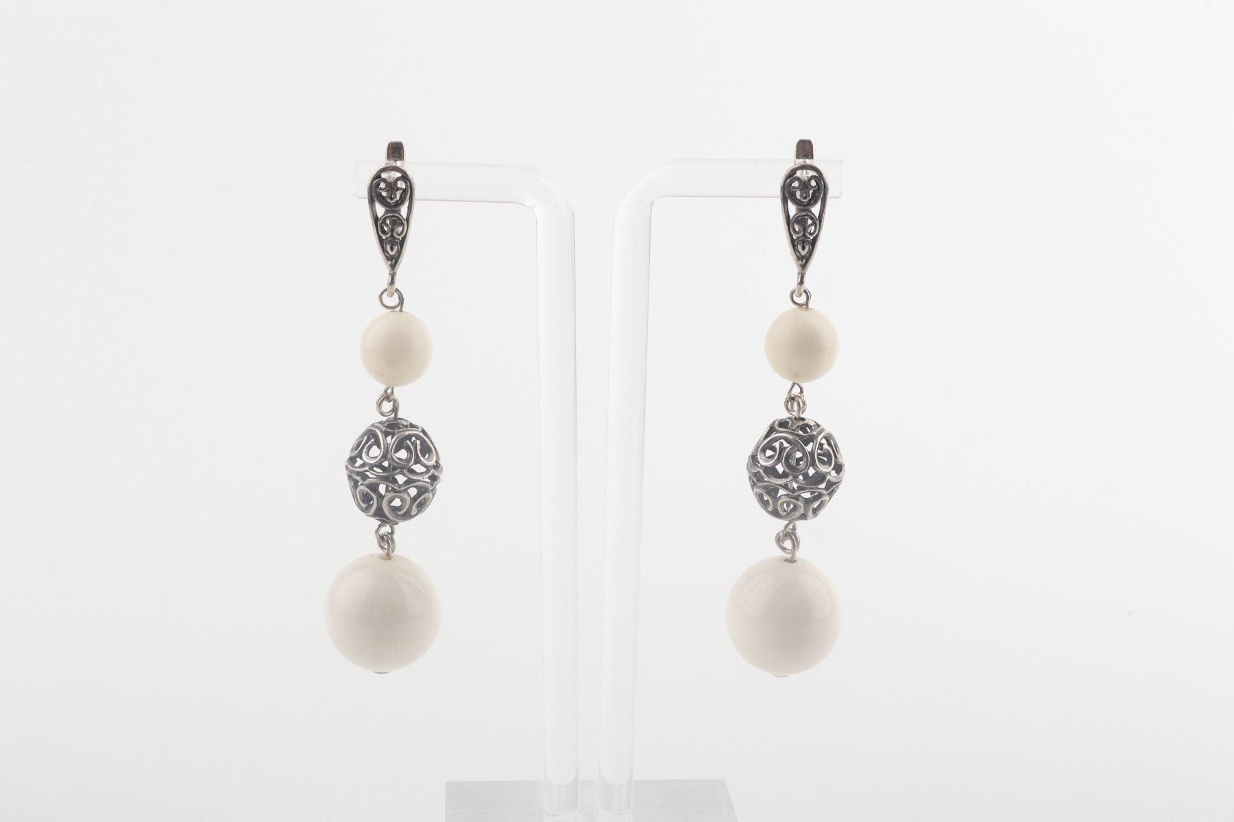 In these earrings, each blackened sterling silver leverback base is complemented by two mammoth ivory pearls (Mammuthus primigenius) and one sterling silver pearl. Very chic and unusual statement for both day and night.