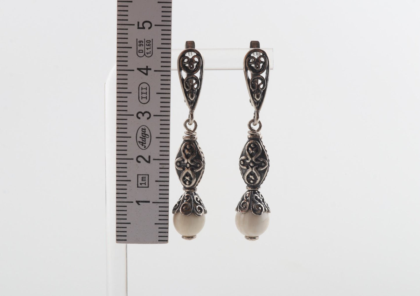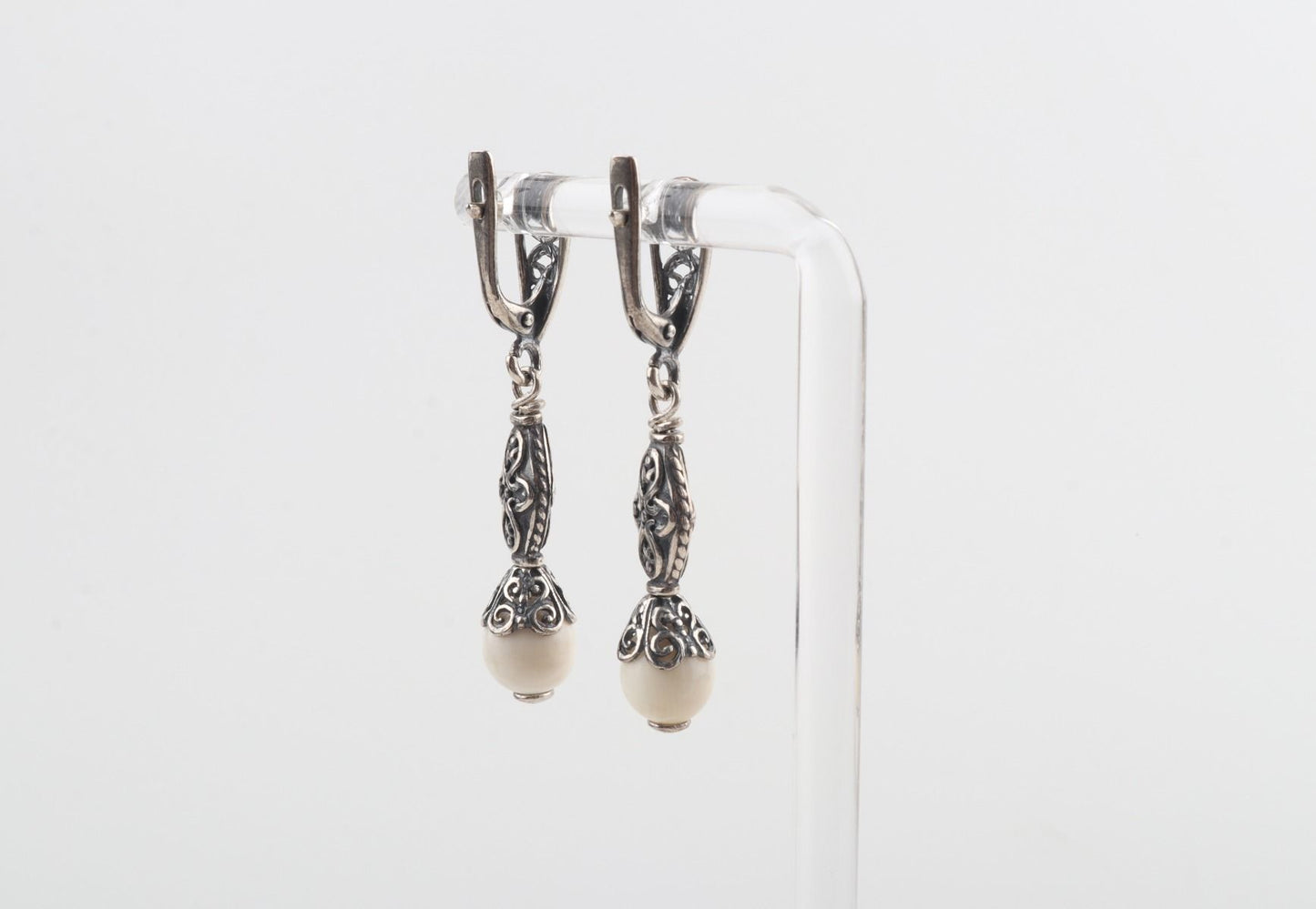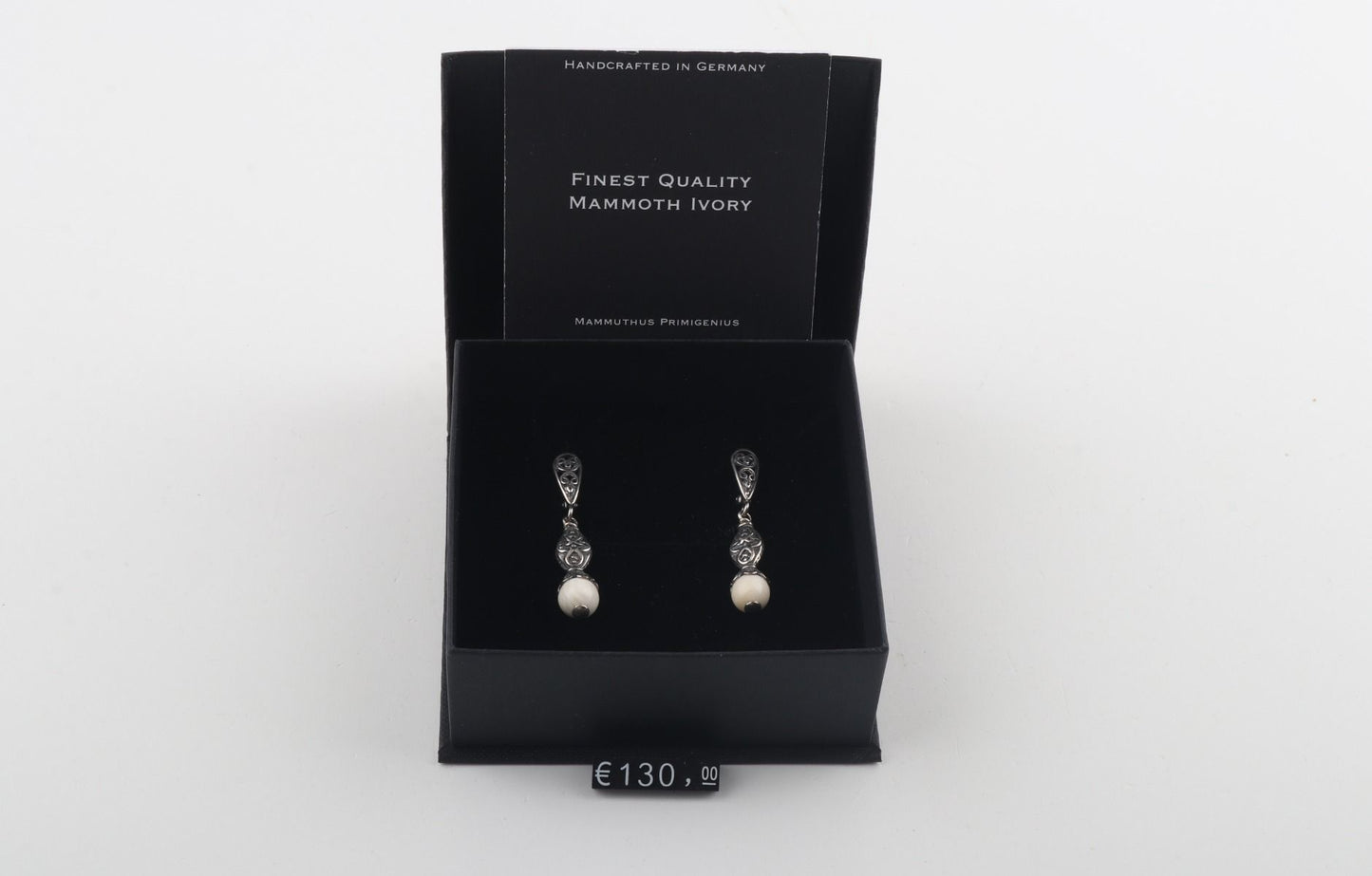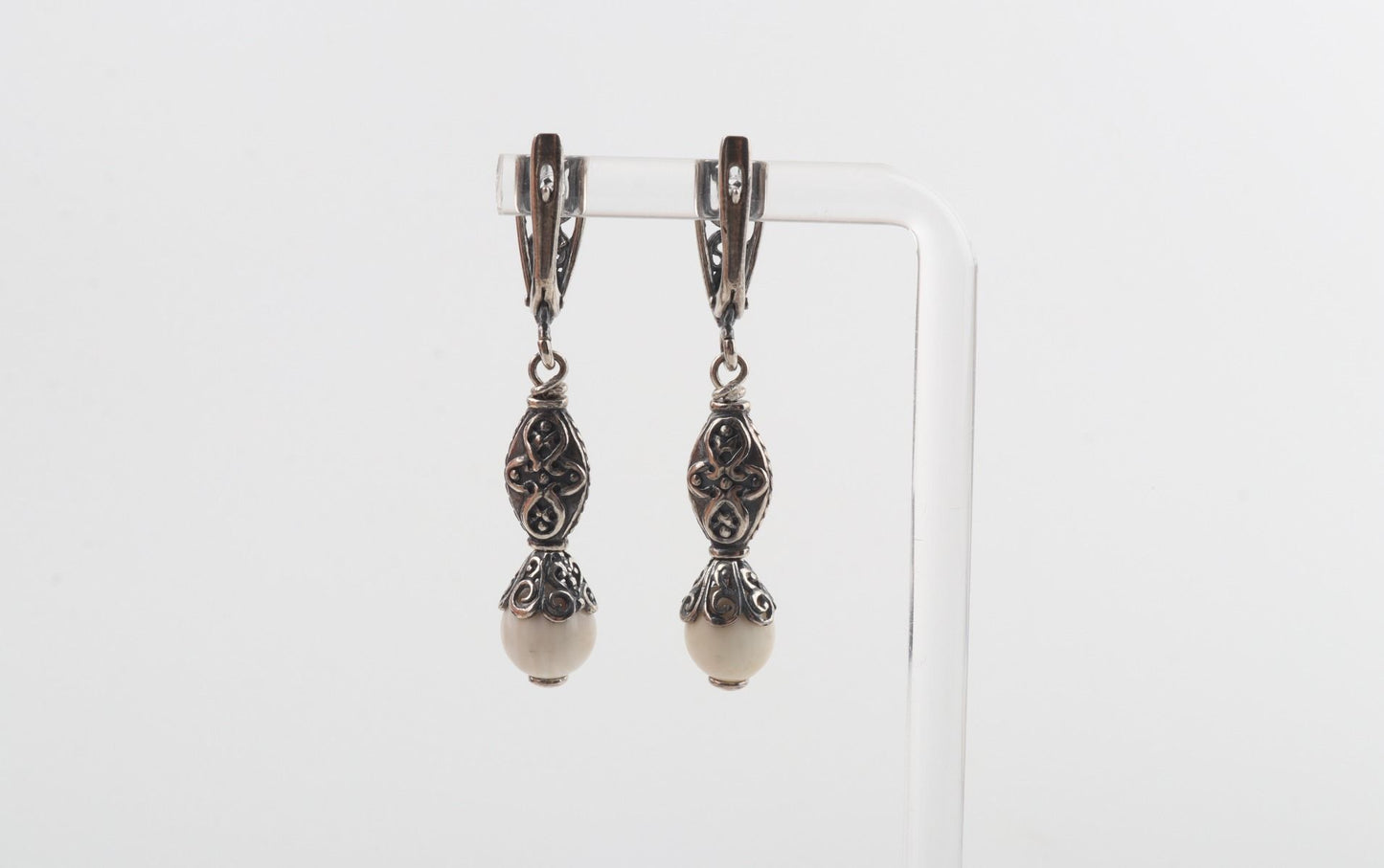In these earrings, each blackened sterling silver leverback base is complemented by two mini mammoth ivory pearls (Mammuthus primigenius). Chic and unusual statement for both day and night.