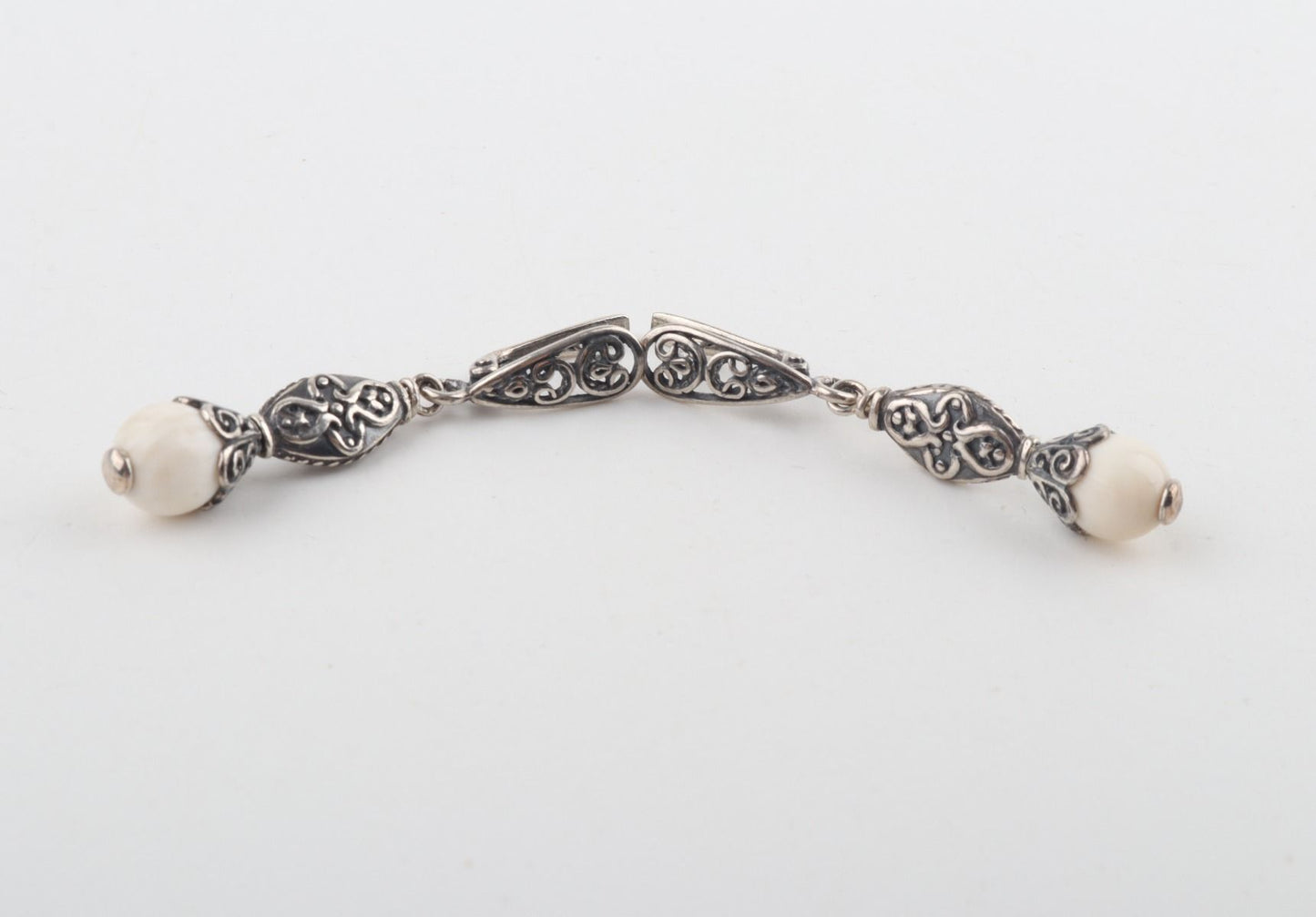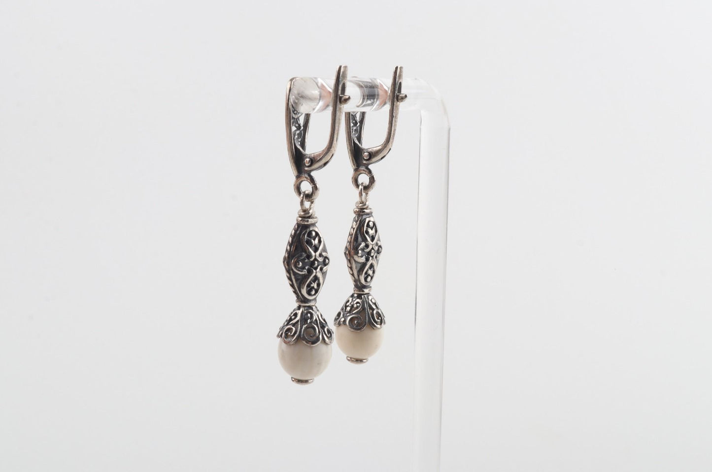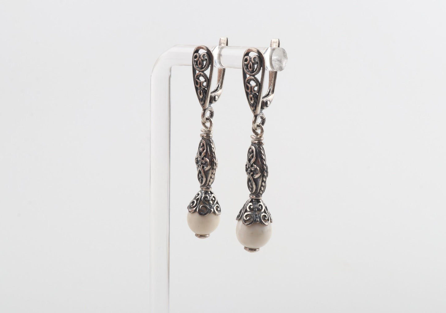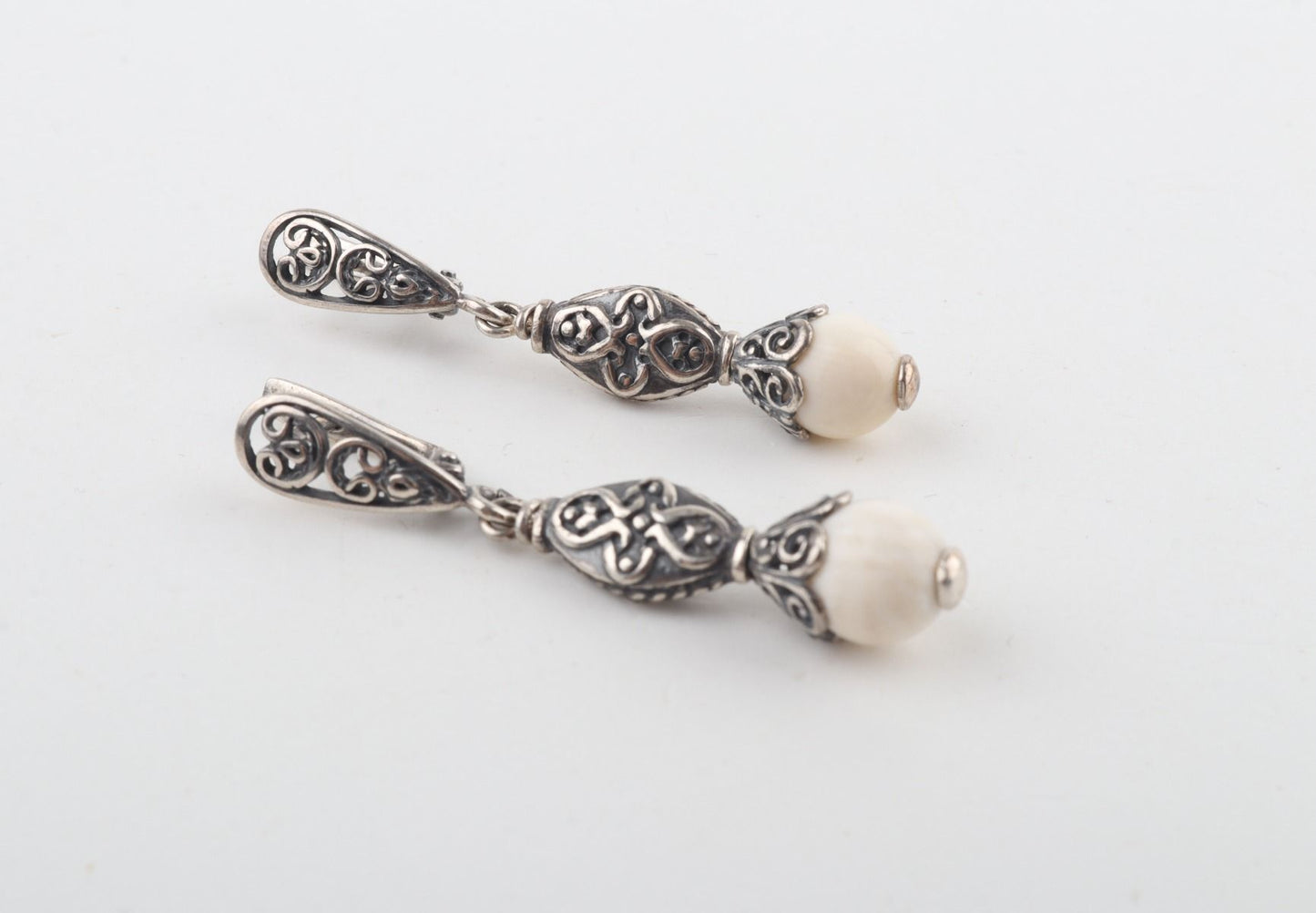 In these earrings, each blackened sterling silver leverback base is complemented by two mini mammoth ivory pearls (Mammuthus primigenius). Chic and unusual statement for both day and night.
