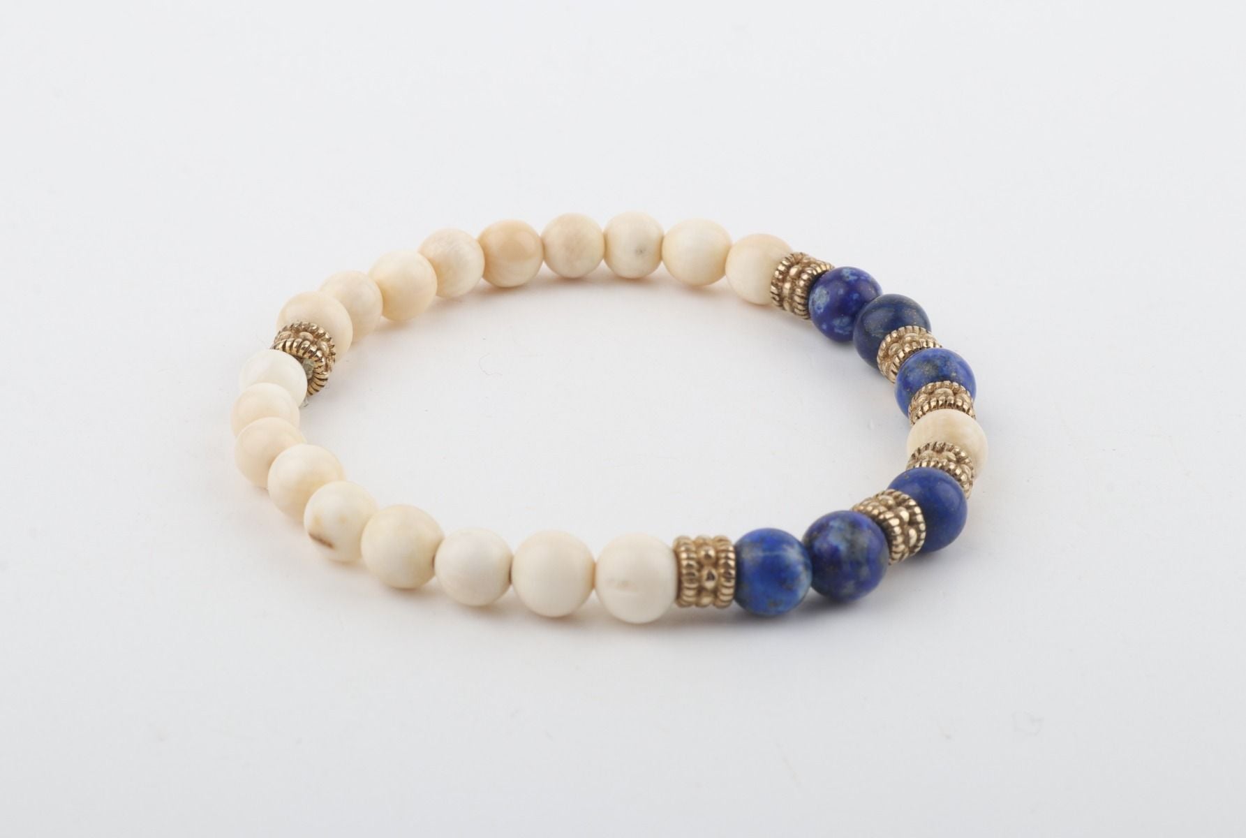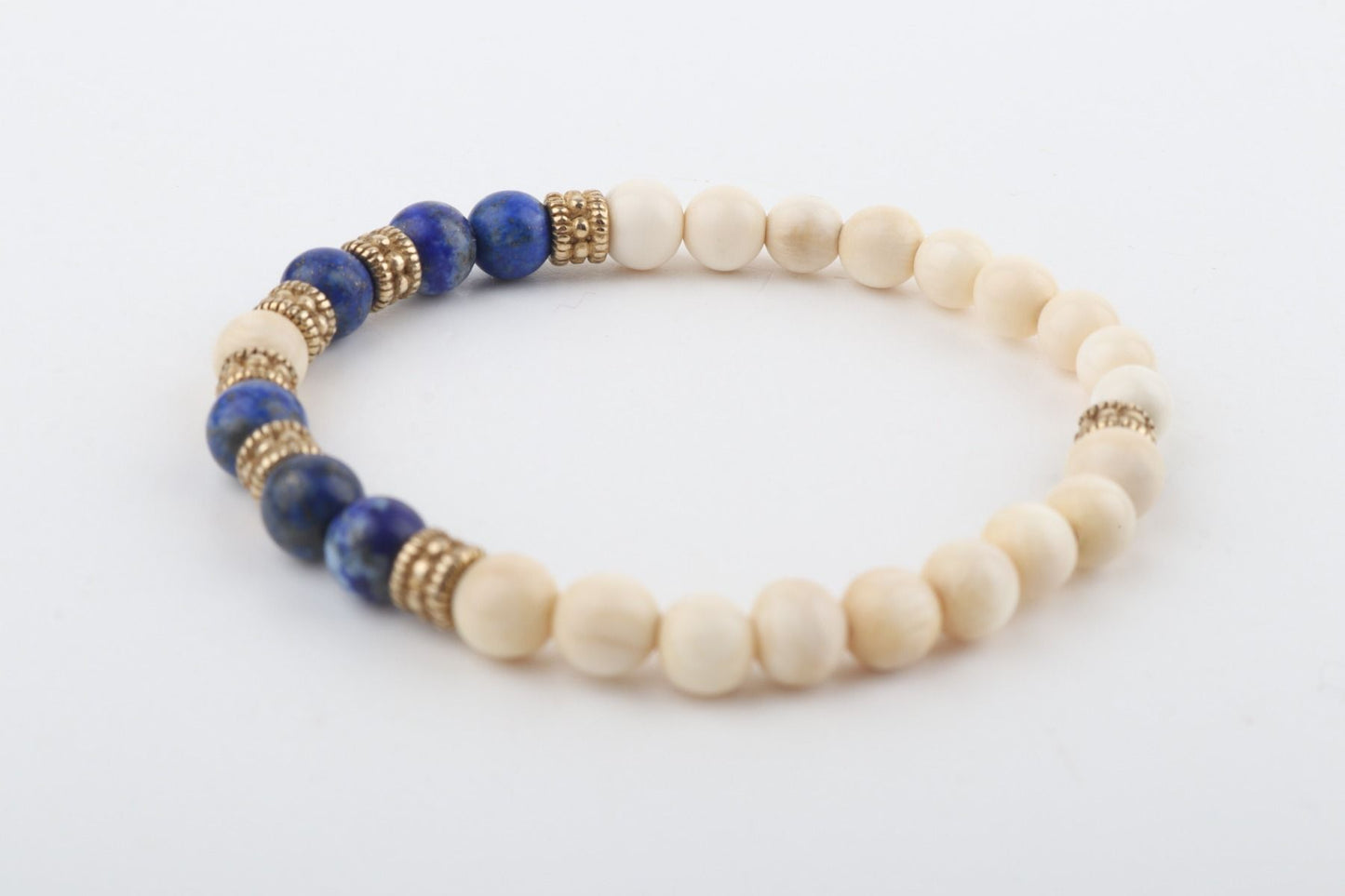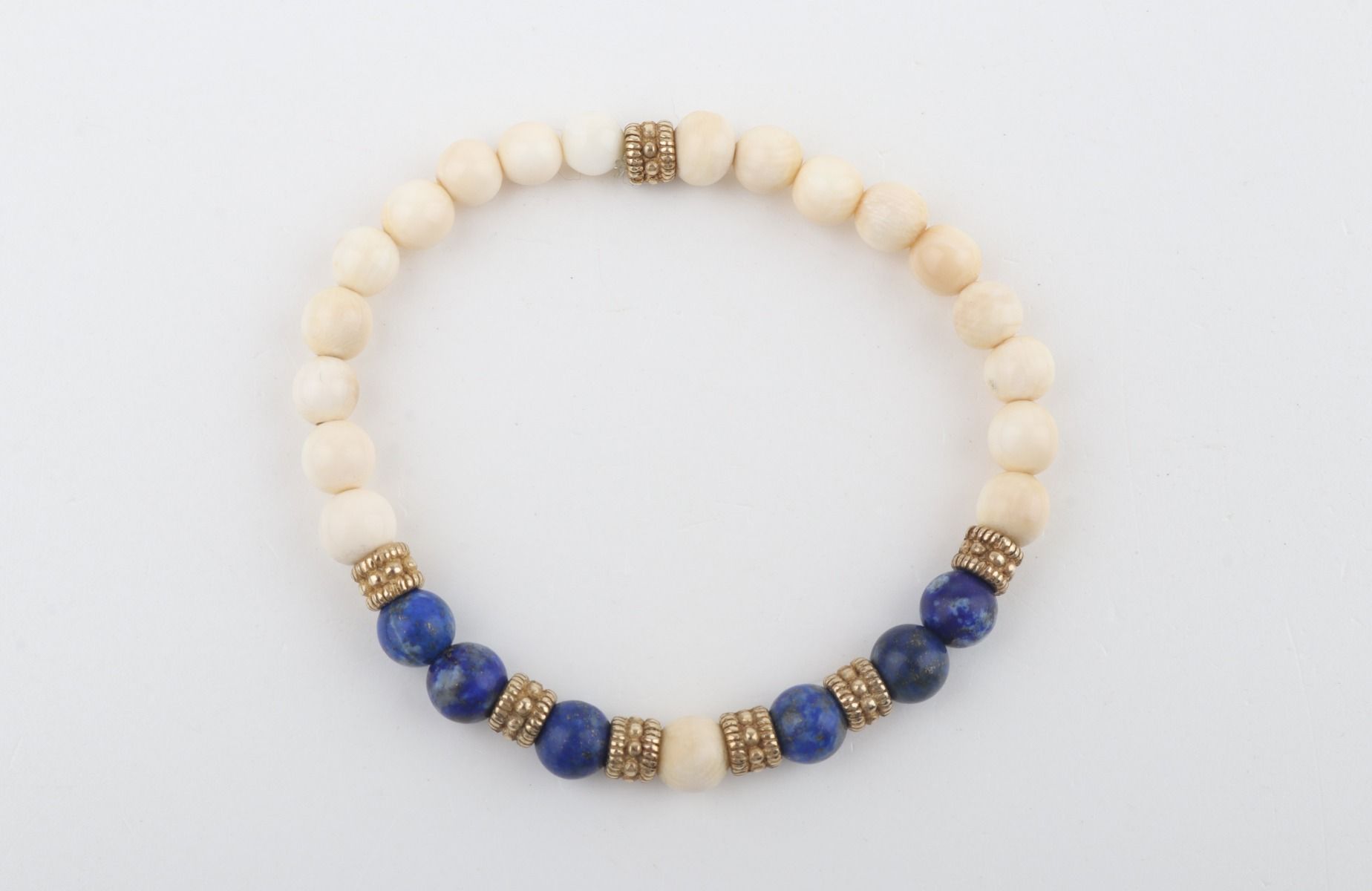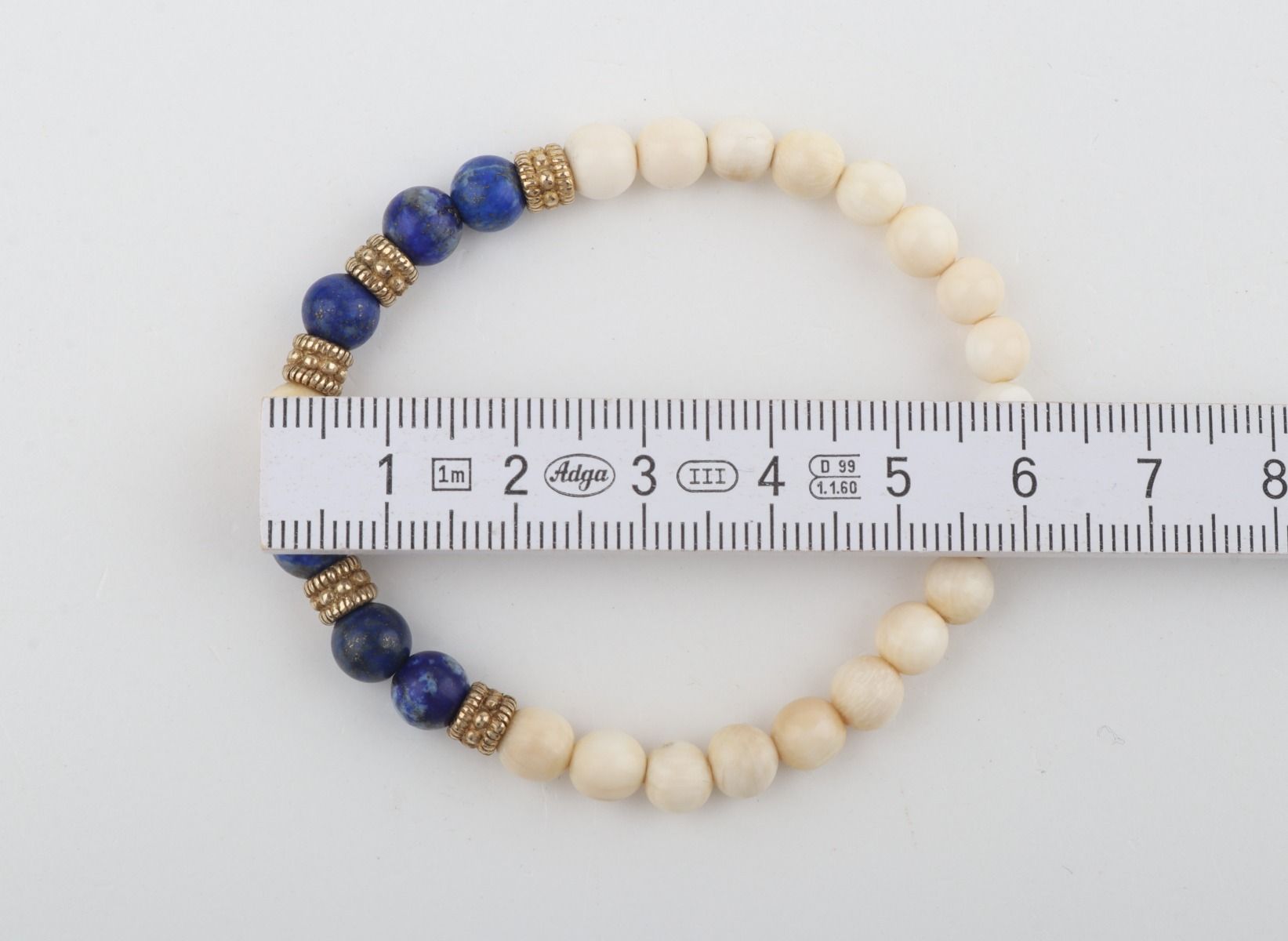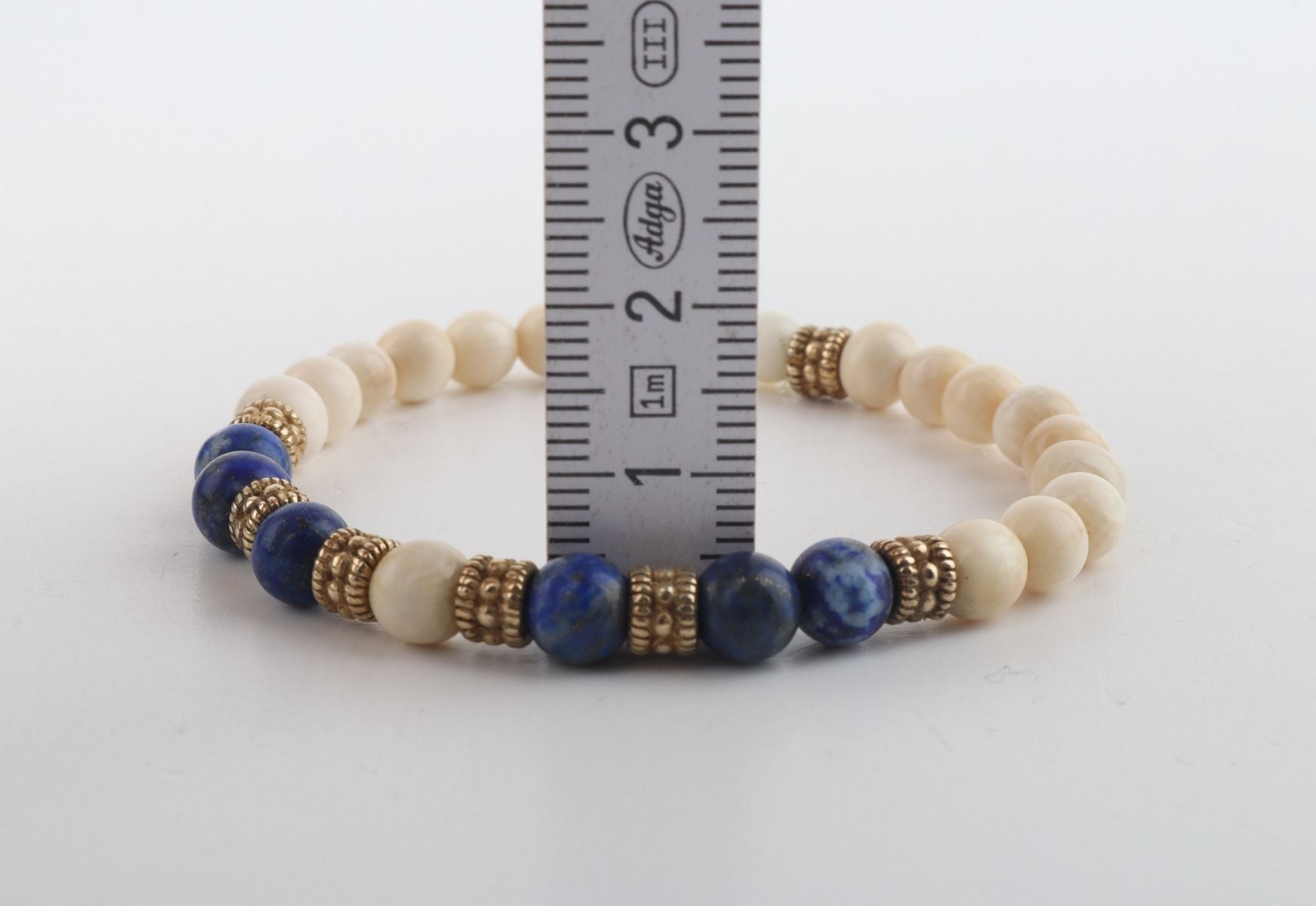 The bracelet features 5 mm mammoth ivory pearls (Mammuthus primigenius), each over 10,000 years old and hailing from the Pleistocene geological epoch. These pearls are beautifully mixed with 4 mm lapis lazuli, symbolizing strength, courage, royalty, wisdom, intellect, and trust. The luxurious 24K gold-plated sterling silver elements add a touch of glamour and sophistication to this already stunning design.