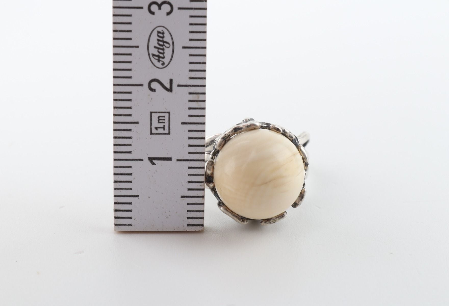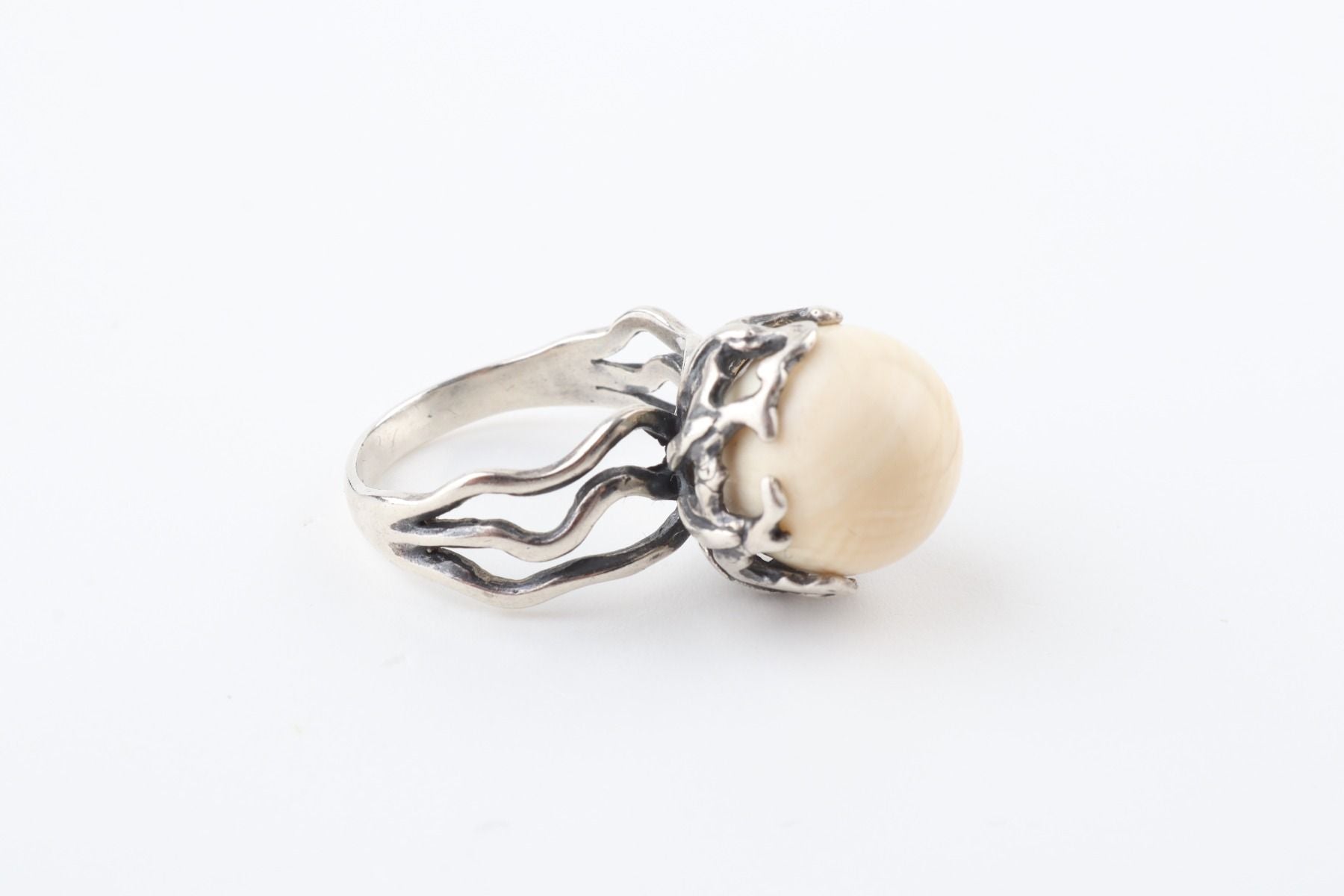 This exquisite ring features a piece of mammoth ivory sourced from the prehistoric woolly mammoth (Mammuthus primigenius), set in a sterling silver band designed as an elegant peony blossom. The ivory is expertly carved into a smooth, polished bead that highlights its unique characteristics, making each ring a unique piece.
