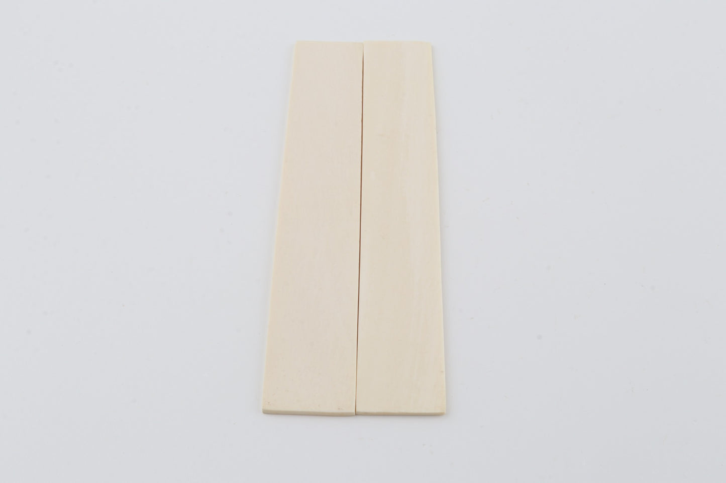 This is a pre-cut pair of natural woolly mammoth ivory scales (Mammuthus primigenius). These scales are in an immaculate condition. The ivory is dry and without cracks. Consistent width and thickness with reserves on both ends. The undersides are flat. The colour of the ivory is white.