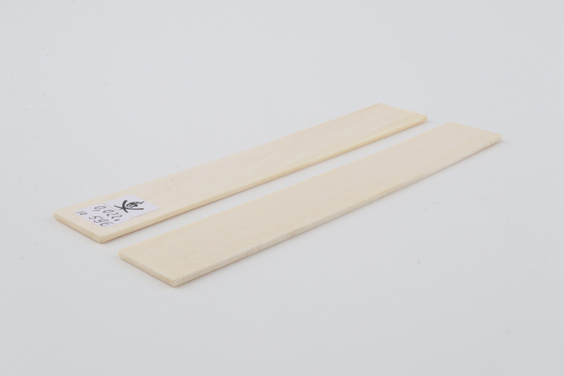 This is a pre-cut pair of natural woolly mammoth ivory scales (Mammuthus primigenius). These scales are in an immaculate condition. The ivory is dry and without cracks. Consistent width and thickness with reserves on both ends. The undersides are flat. The colour of the ivory is white.