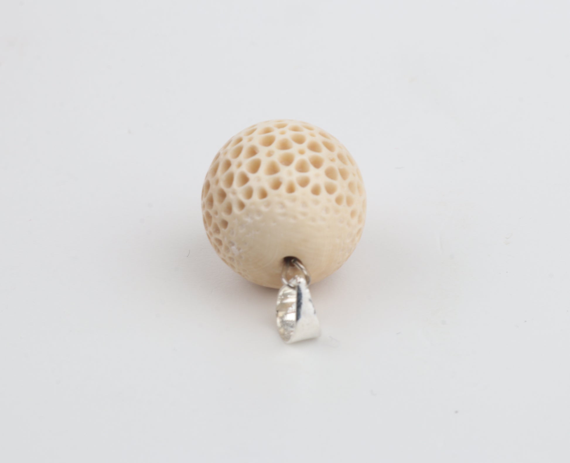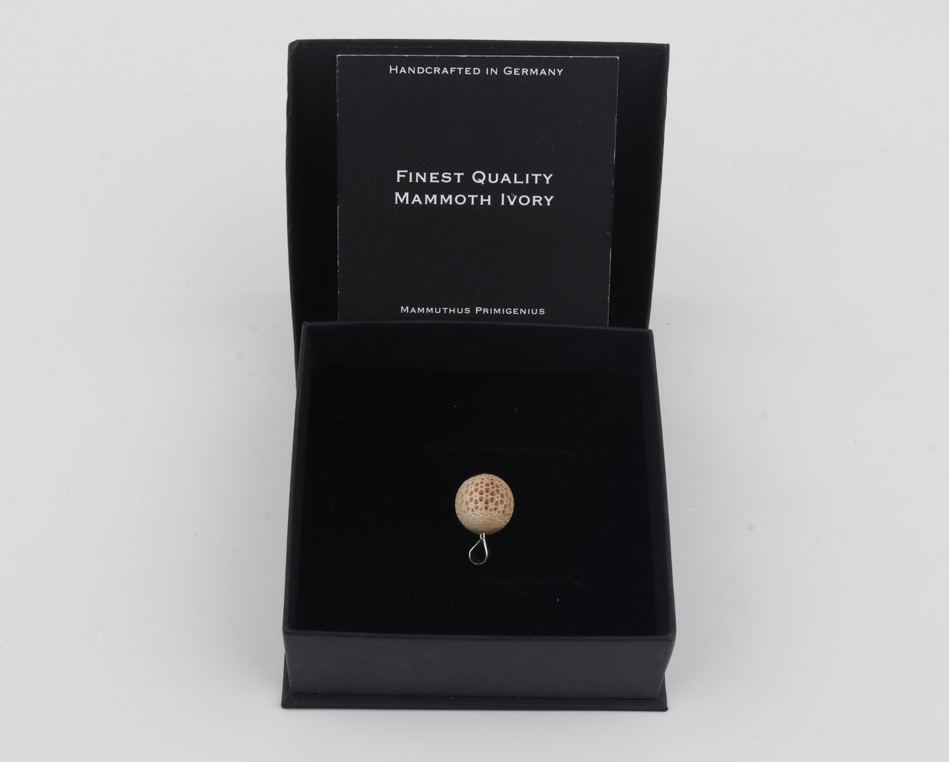 This pendant is carved from mammoth ivory (Mammuthus primigenius) to reveal the characteristic cellular structure of this rare prehistoric material. The intricate carving highlights the natural patterning formed over thousands of years, giving the piece a warm, organic appearance that cannot be replicated.