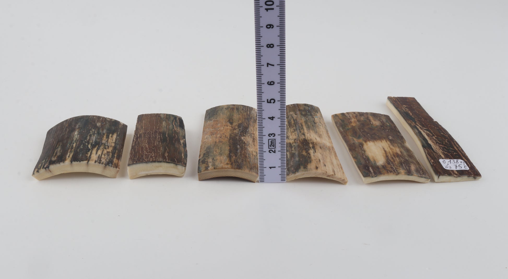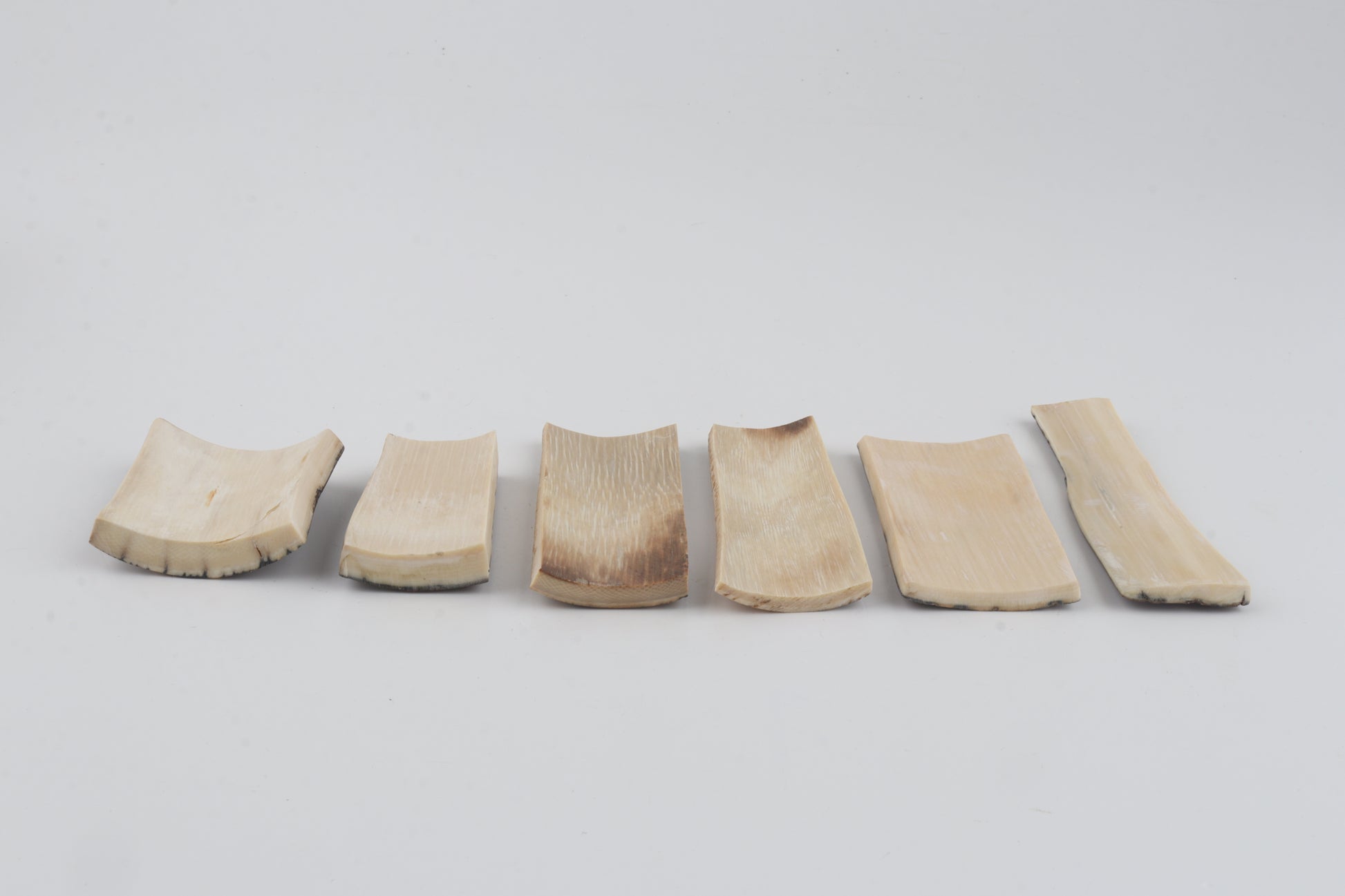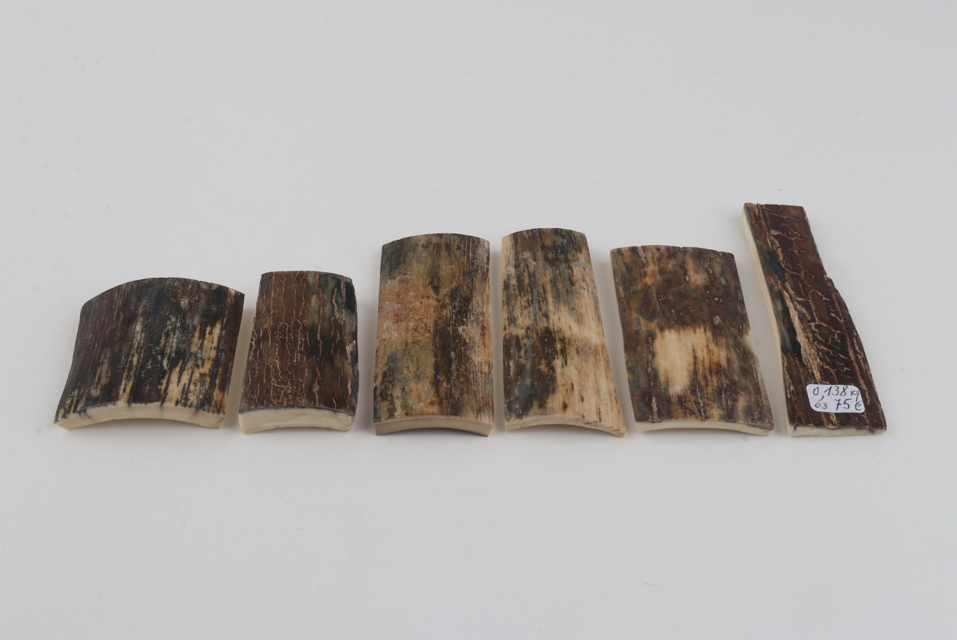 This lot consists of 6 Siberian woolly mammoth bark pieces (Mammuthus primigenius). Each piece was hand-selected to form a matching lot. Please carefully look at the pictures for precise dimensions. The colour of the bark is a mix of brown and blue.
