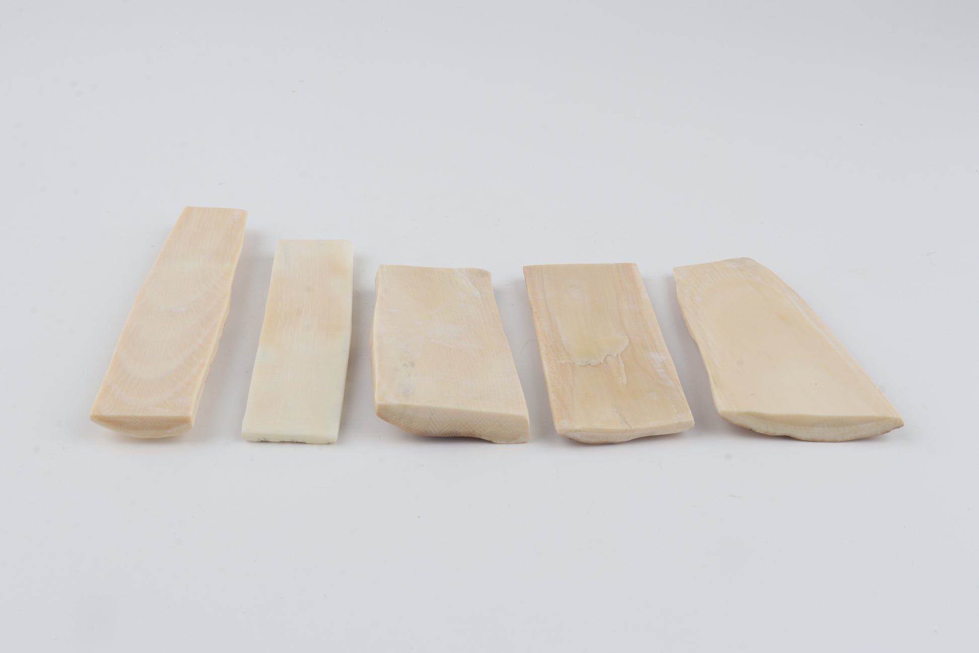 This lot consists of 5 Siberian woolly mammoth bark pieces (Mammuthus primigenius). Each piece was hand-selected to form a matching lot. Please carefully look at the pictures for precise dimensions. The colour of the bark is a mix of ivory and creme.