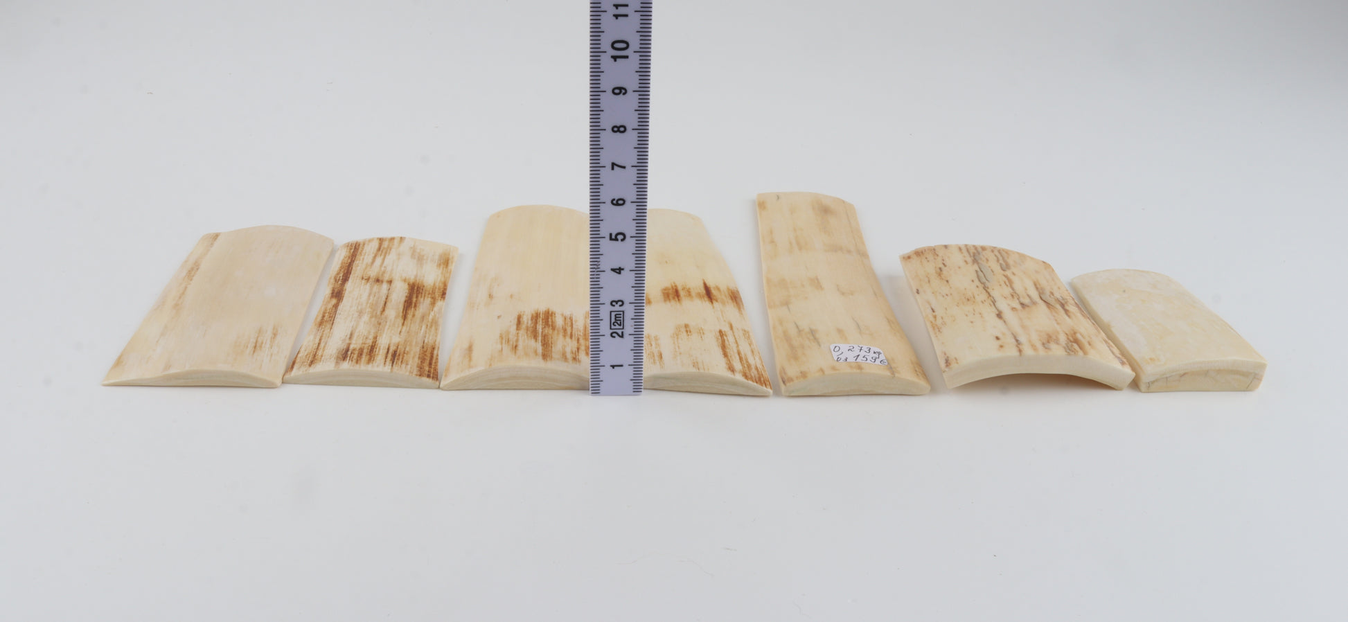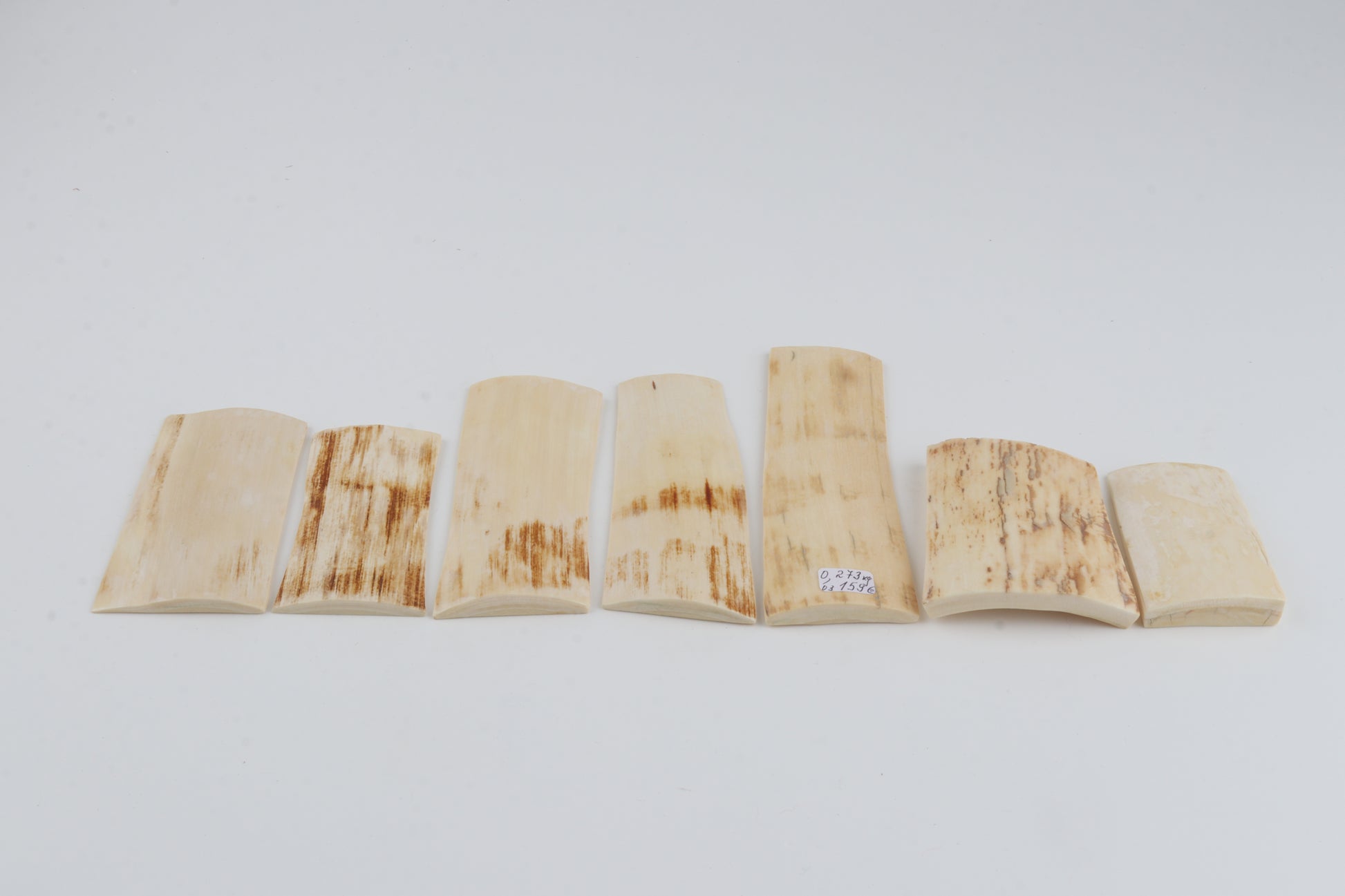 This lot consists of 7 Siberian woolly mammoth bark pieces (Mammuthus primigenius). Each piece was hand-selected to form a matching lot. Please carefully look at the pictures for precise dimensions. The colour of the bark is a mix of orange and ivory.