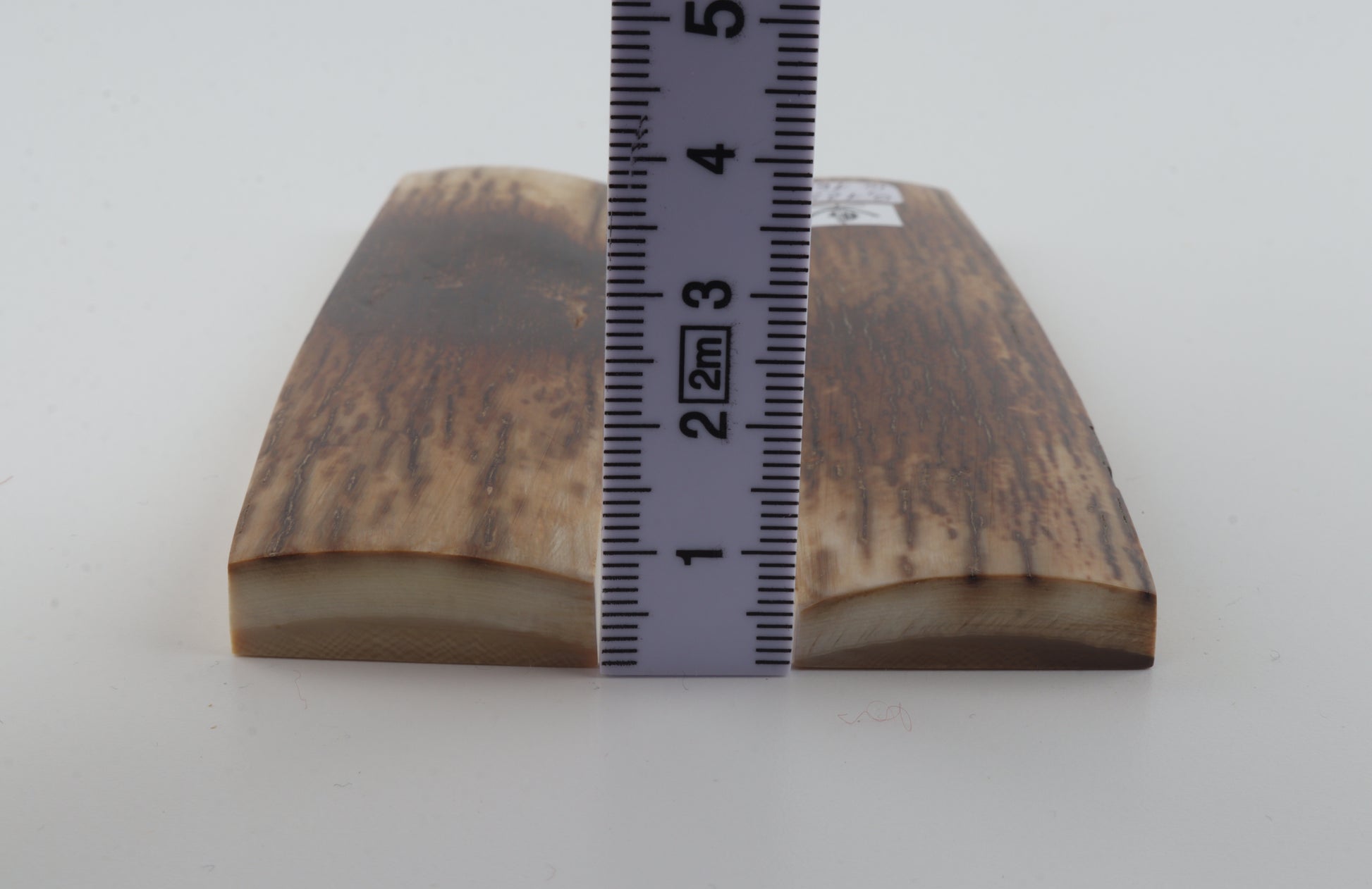 This is a pre-cut pair of natural woolly mammoth bark scales (Mammuthus primigenius) in top-quality condition. They feature consistent width and thickness with reserves on both ends, and the undersides are flat. The bark displays a mix of brown and orange tones.