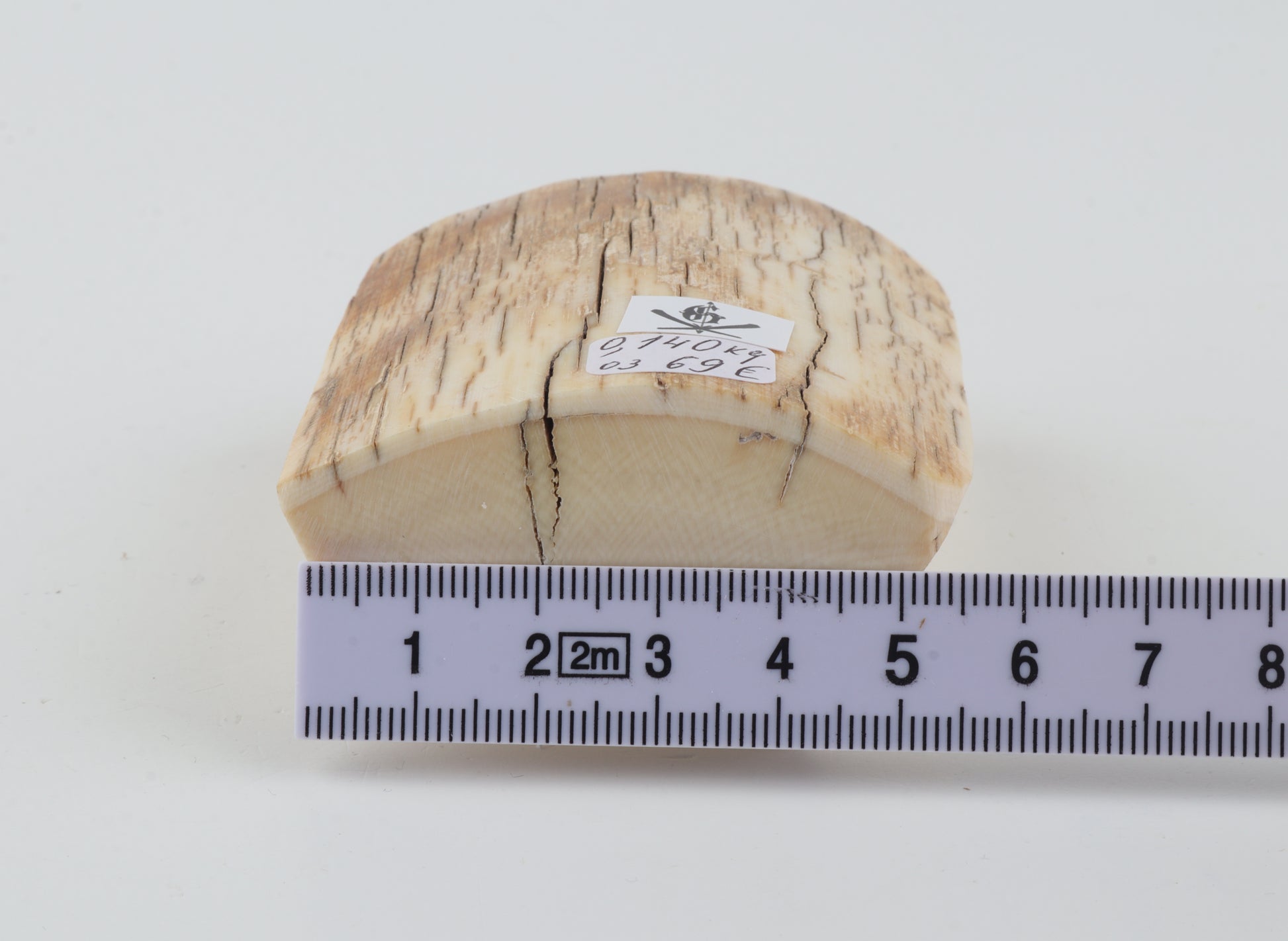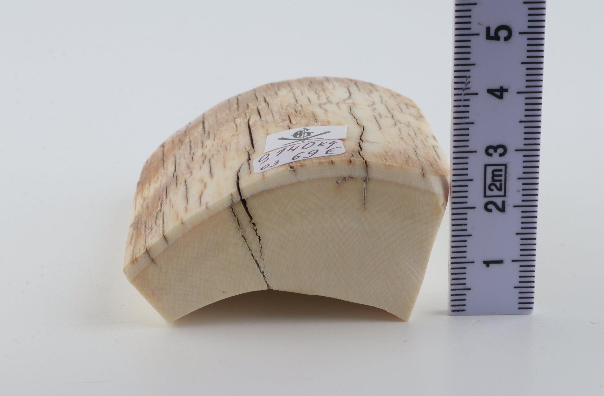 This is a premium-quality piece of Siberian woolly mammoth ivory (Mammuthus primigenius). The ivory is naturally dense and solid, despite some cracks. Tapered thickness: One cross-cut section is slightly thicker than the other. Consistent width with reserves on both ends. Please carefully look at the pictures for precise dimensions. The piece displays its original, natural ivory tone. The color of the outer layer of bark is white-orange.