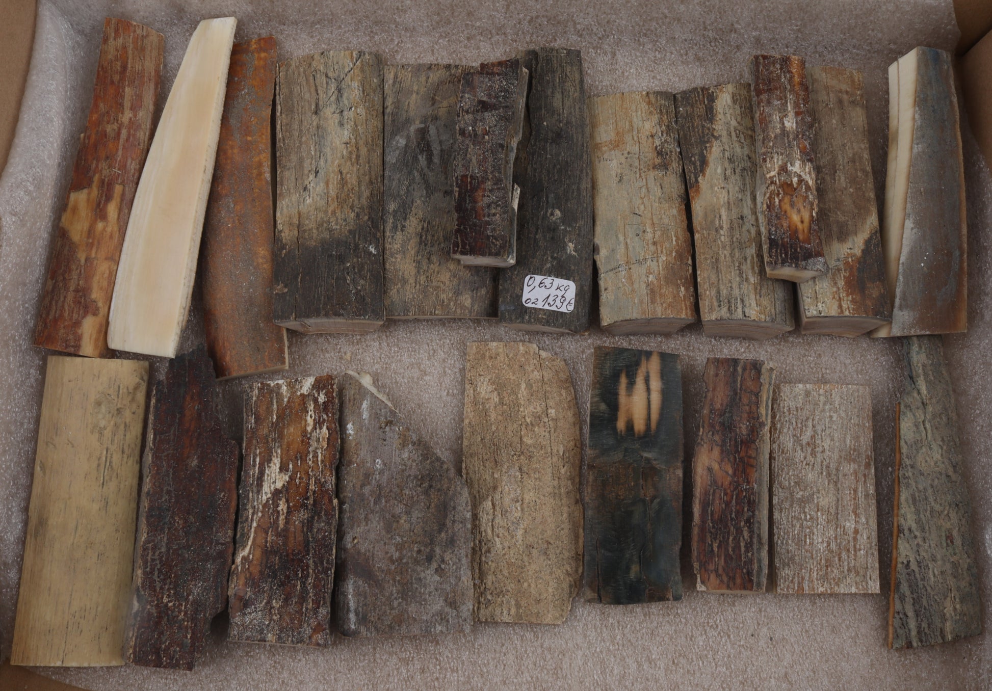 This lot consists of 21 raw Siberian woolly mammoth bark pieces (Mammuthus primigenius). Each piece was hand-selected to form a matching lot. Please carefully look at the pictures for precise dimensions and colors.