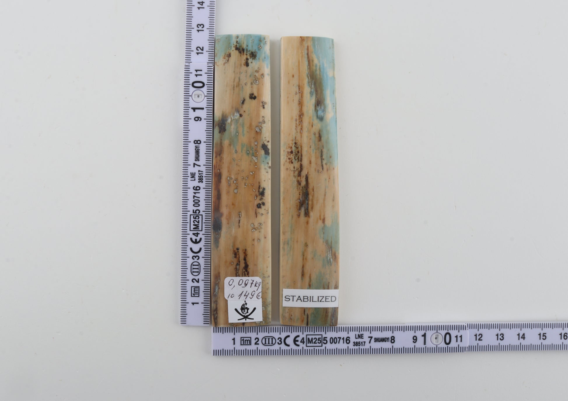 This is a pre-cut pair of stabilized woolly mammoth bark scales (Mammuthus primigenius). These scales can be cut, drilled, sanded, polished etc. to achieve the desired results. Consistent width and thickness with reserves on both ends. The undersides are flat. The colour of the bark is beige-blue.