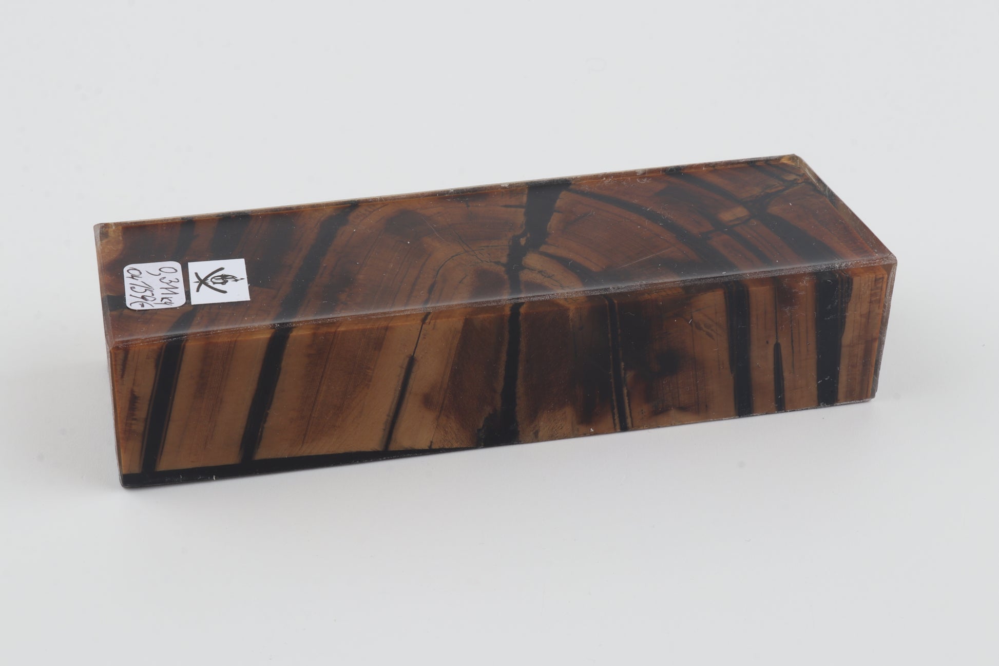 This is a cross-cut stabilized woolly mammoth ivory block (Mammuthus primigenius). This block can be precision-cut, drilled, sanded, polished etc. to achieve the desired results. Consistent width and thickness with reserves on both ends. The colour of the ivory is brown-brown.
