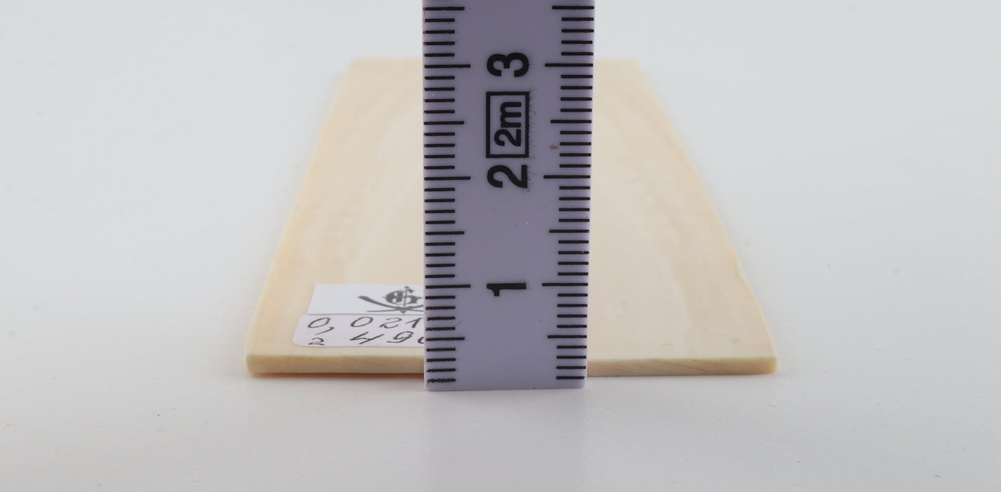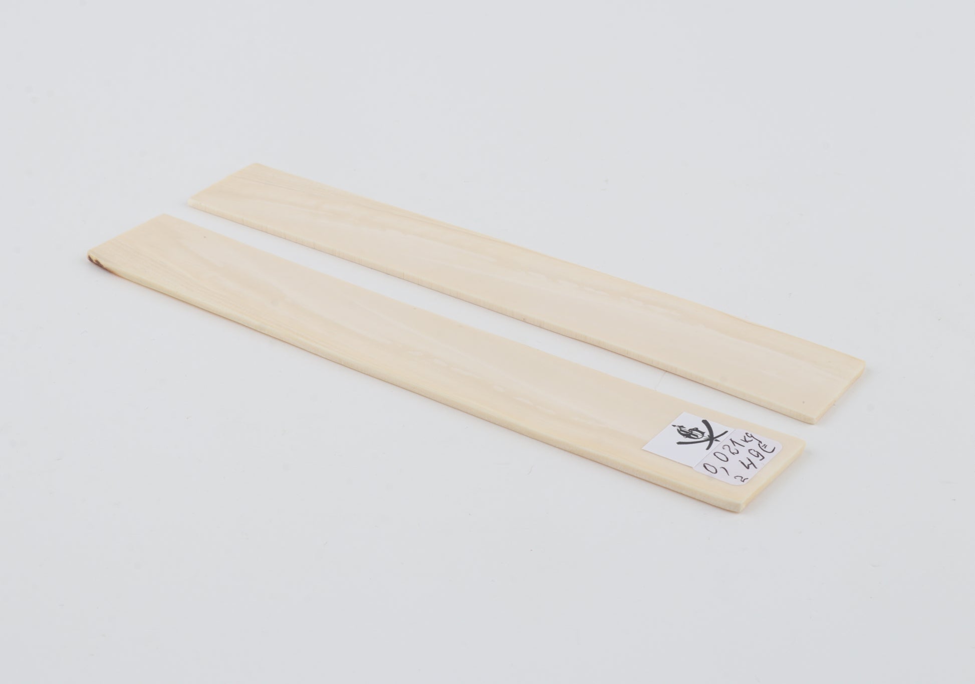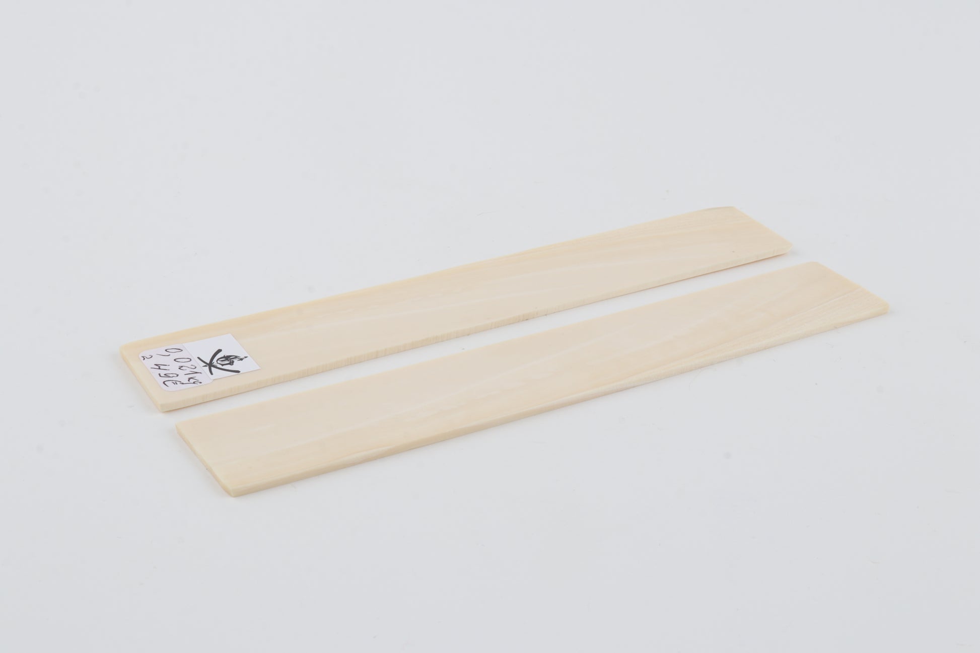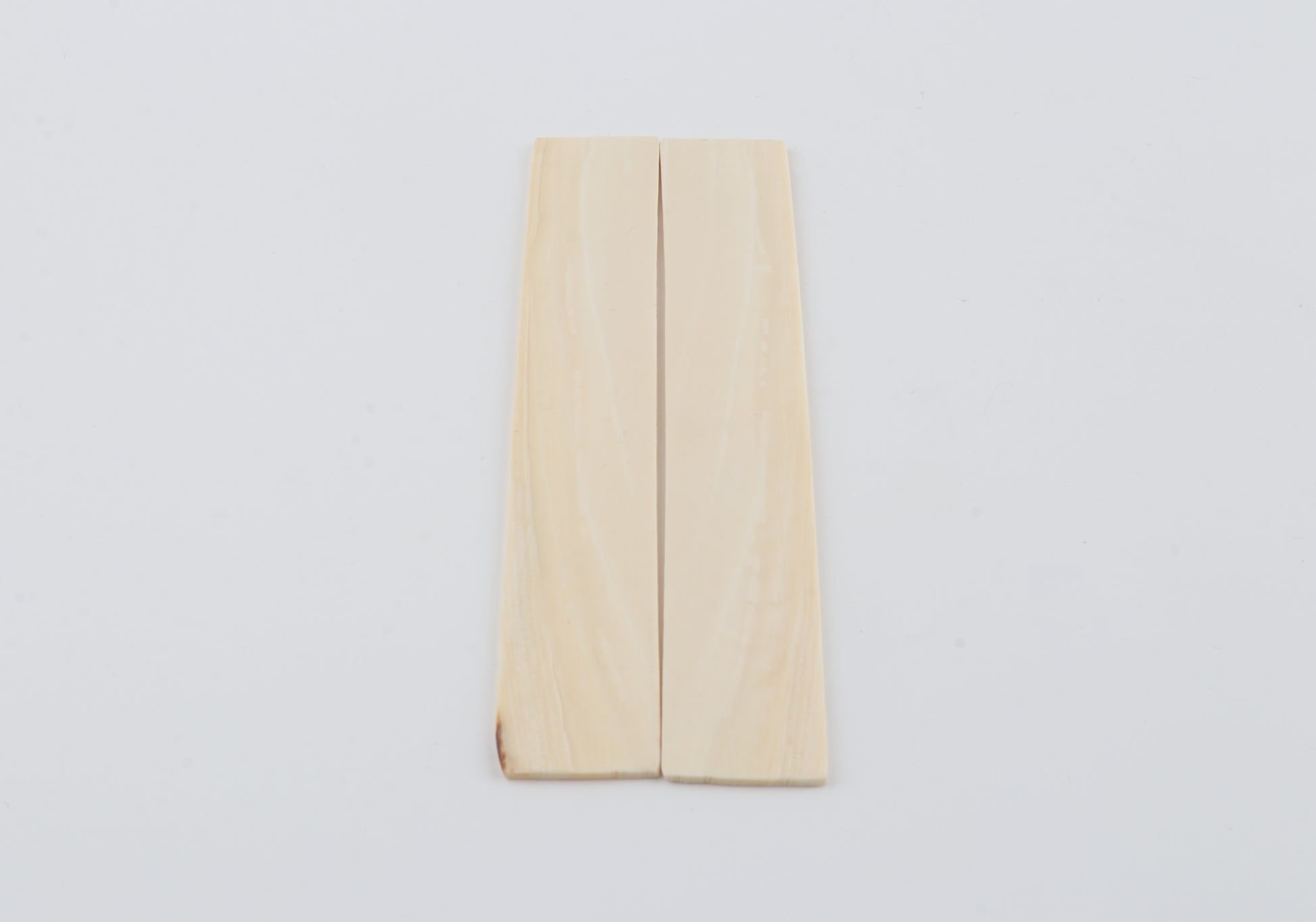 This is a pre-cut pair of natural woolly mammoth ivory scales (Mammuthus primigenius). These scales are in an immaculate condition. The ivory is dry and without cracks. Consistent width and thickness with reserves on both ends. The undersides are flat. These pieces display the typical ivory tone.