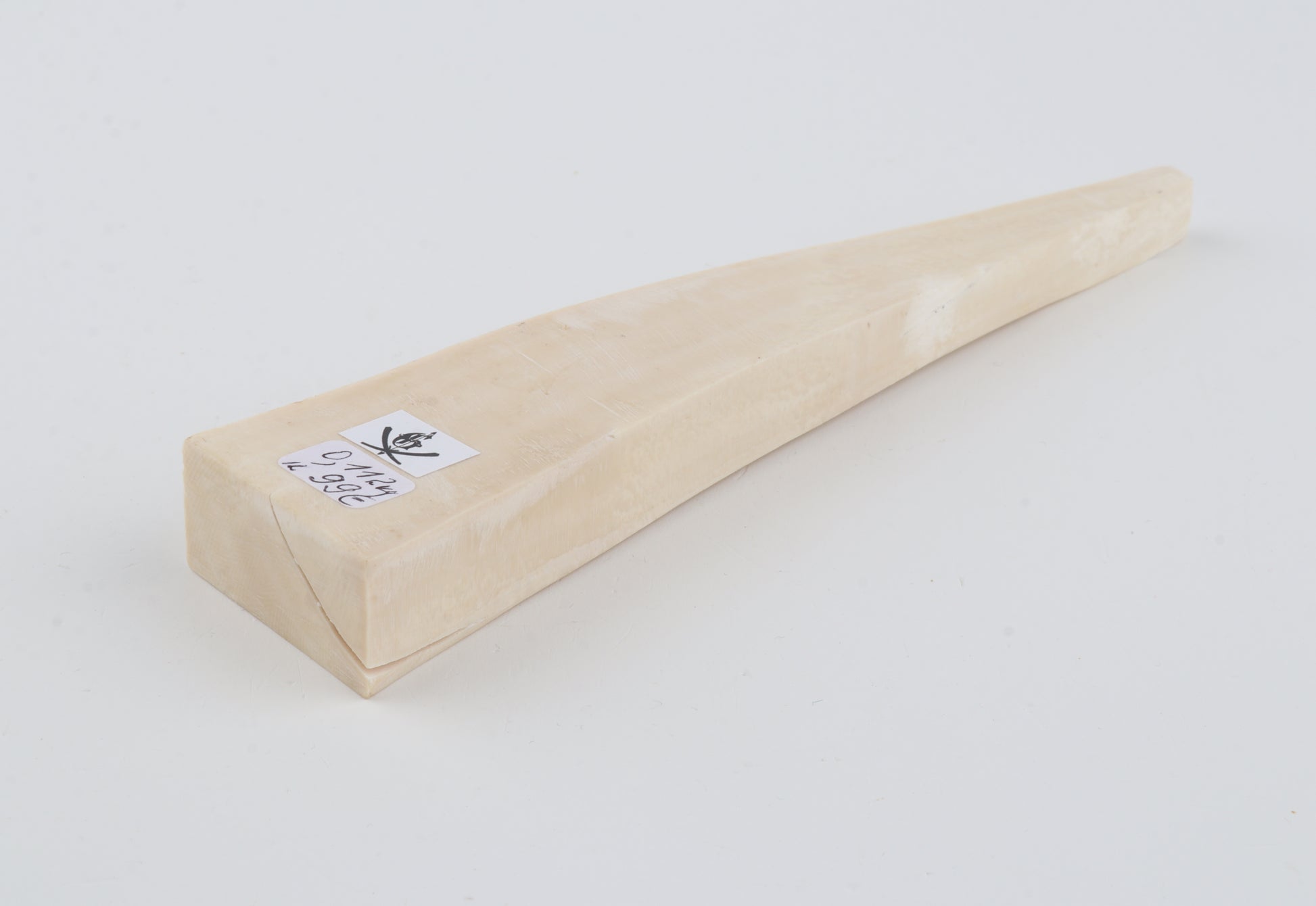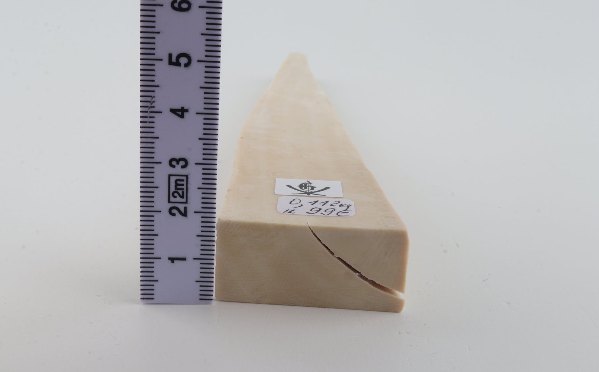 This is a premium-quality piece of Siberian woolly mammoth ivory (Mammuthus primigenius). The ivory is naturally dense and solid, despite some small cracks. One cross-cut section is significantly larger than the other. Reserves on both ends. Please carefully look at the pictures for precise dimensions. The piece displays its original, natural ivory tone.