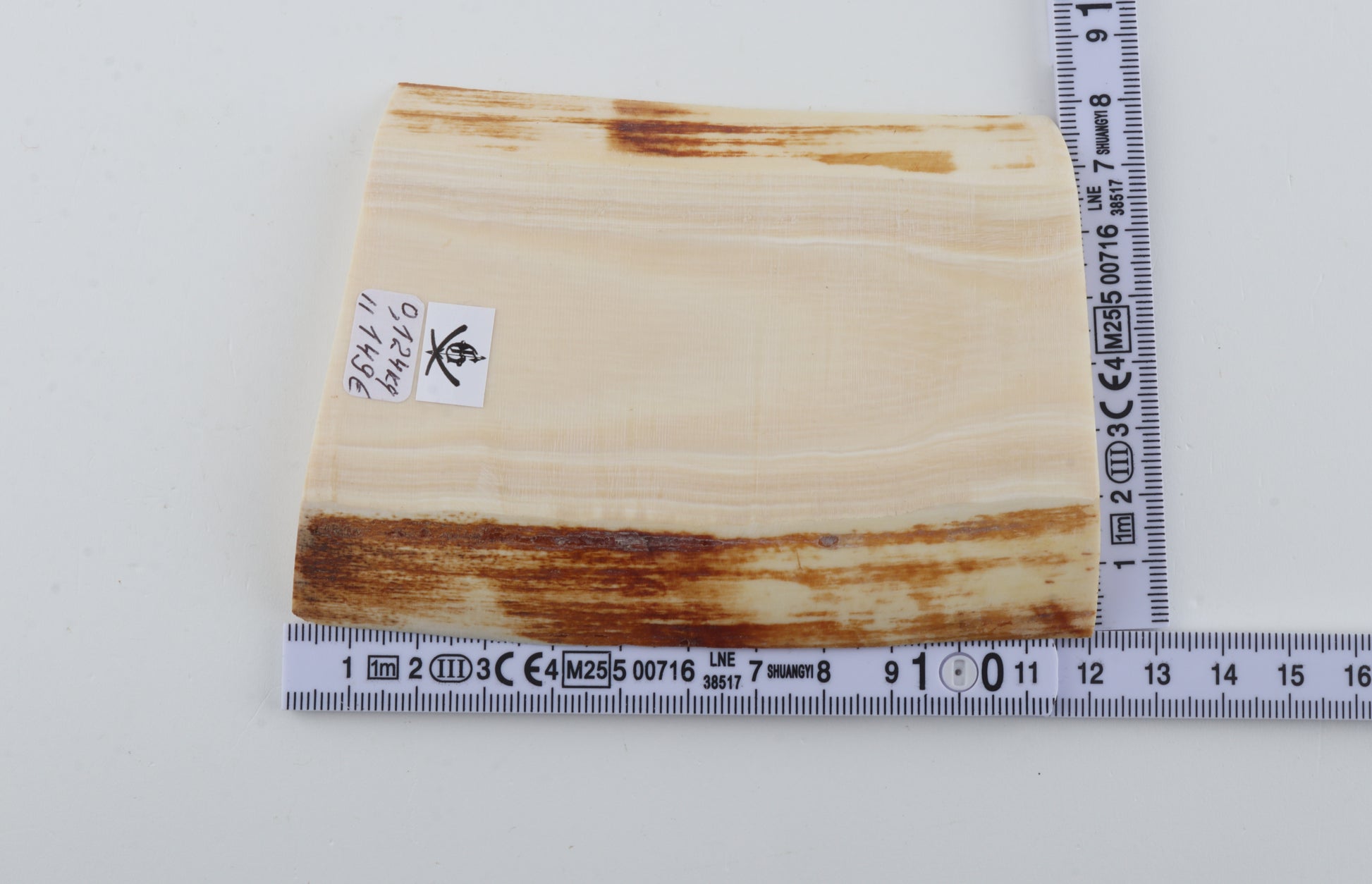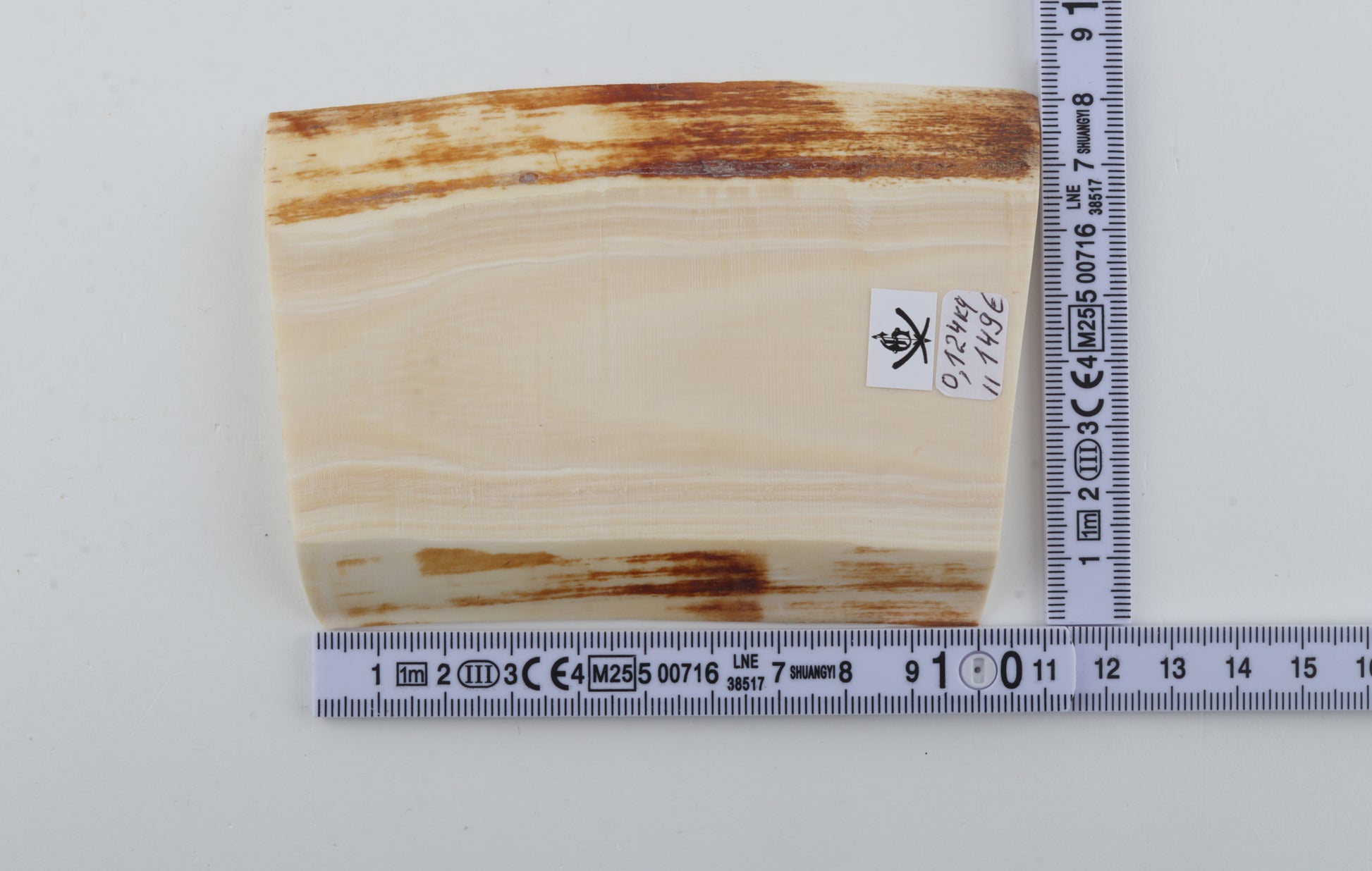 This is a top-quality piece of Siberian woolly mammoth ivory (Mammuthus primigenius). The ivory is rock-solid, completely dry and without cracks. One cross-cut section is slightly wider than the other. Consistent thickness with reserves on both ends. The colour of the ivory is white. The colour of the outer layer of bark is brown-orange.