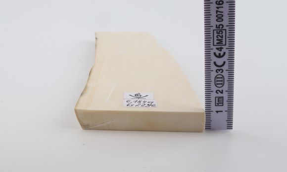 This is a top-quality piece of Siberian woolly mammoth ivory (Mammuthus primigenius). The ivory is rock-solid and completely dry. There is a small crack on the thicker (and wider) cross-cut section. Reserves on both ends. Please carefully look at the pictures for precise dimensions. The colour of the ivory is white. The colour of the outer layer of bark is brown.