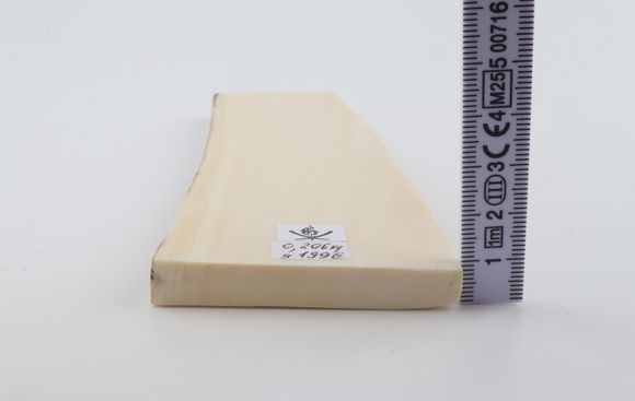 This is a top-quality piece of Siberian woolly mammoth ivory (Mammuthus primigenius). The ivory is rock-solid and completely dry. There is one tiny crack on the side. One cross-cut section is slightly thicker and narrower than the other. Reserves on both ends. Please carefully look at the pictures for precise dimensions. The colour of the ivory is white. The colour of the outer layer of bark is brown.
