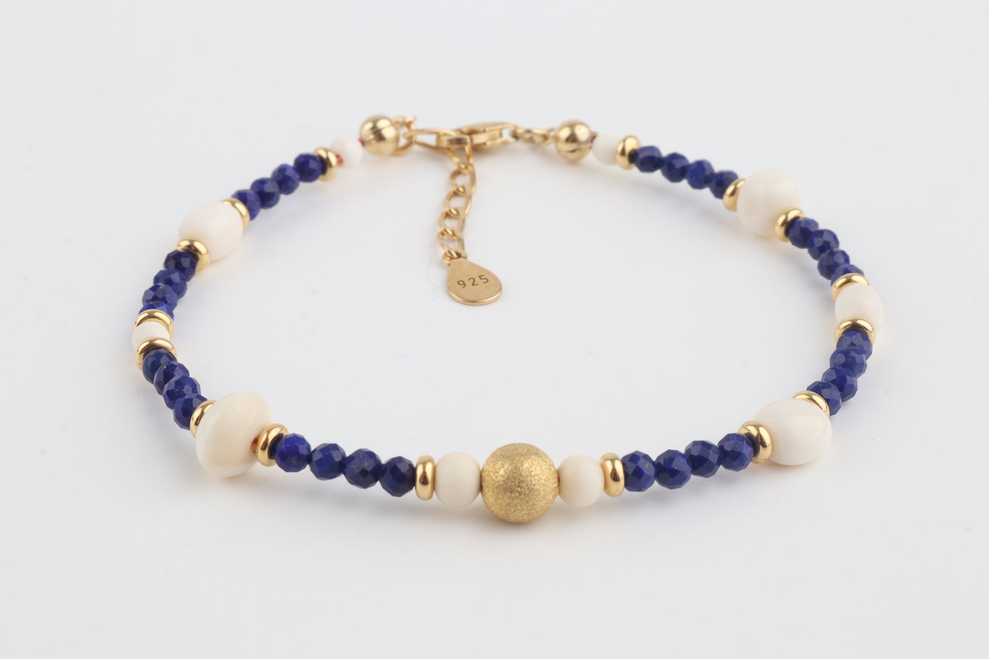 This bracelet combines the soft warmth of mammoth ivory beads (Mammuthus primigenius) with the deep, royal blue tones of lapis lazuli, accented by gold-plated sterling silver spacers. The minimalist composition celebrates balance and contrast. This chic accessory is suitable for both everyday wear and elegant occasions.