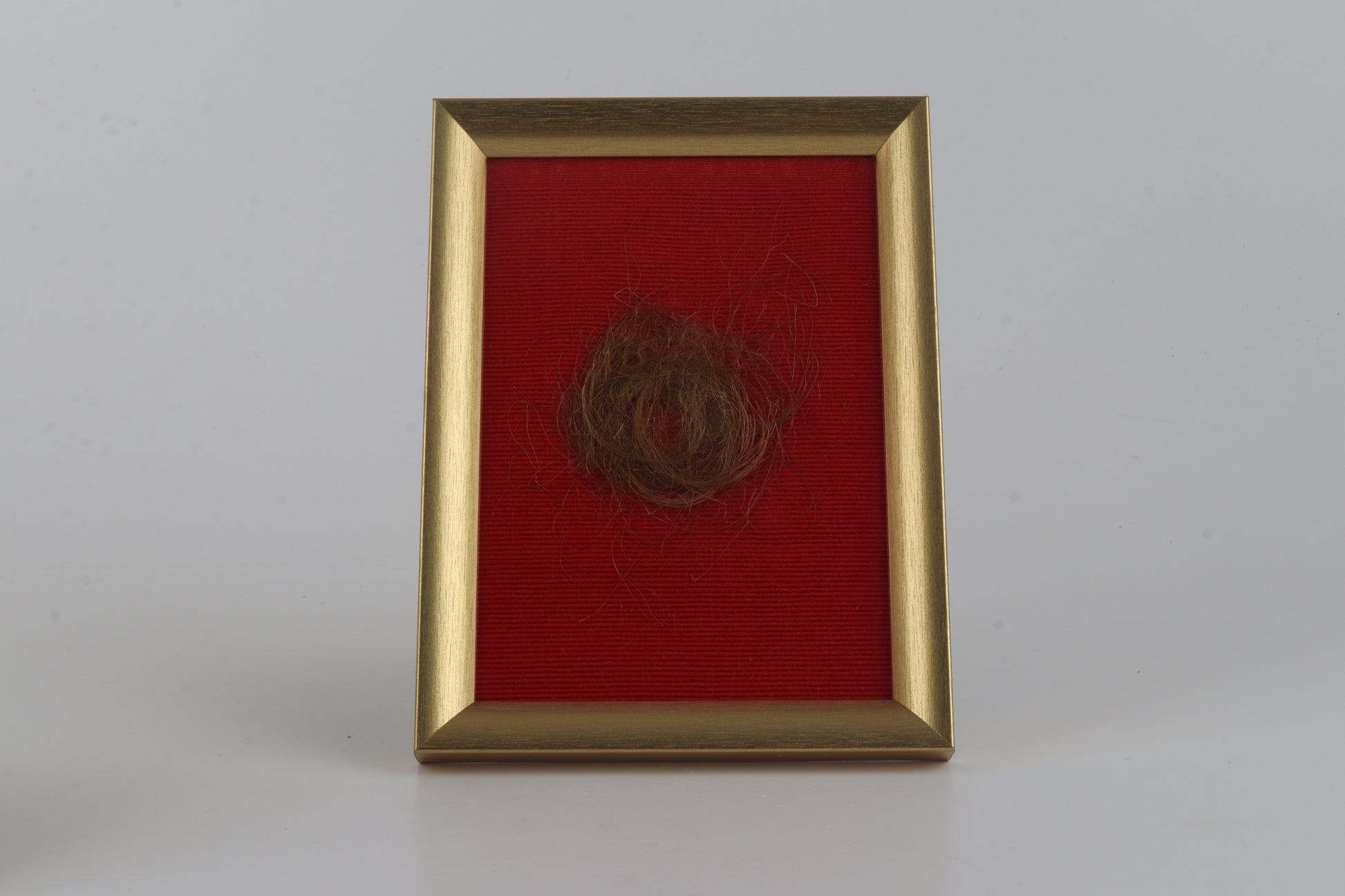 This is authentic hair of a woolly mammoth (Mammuthus primigenius) set in a picture frame against red background.