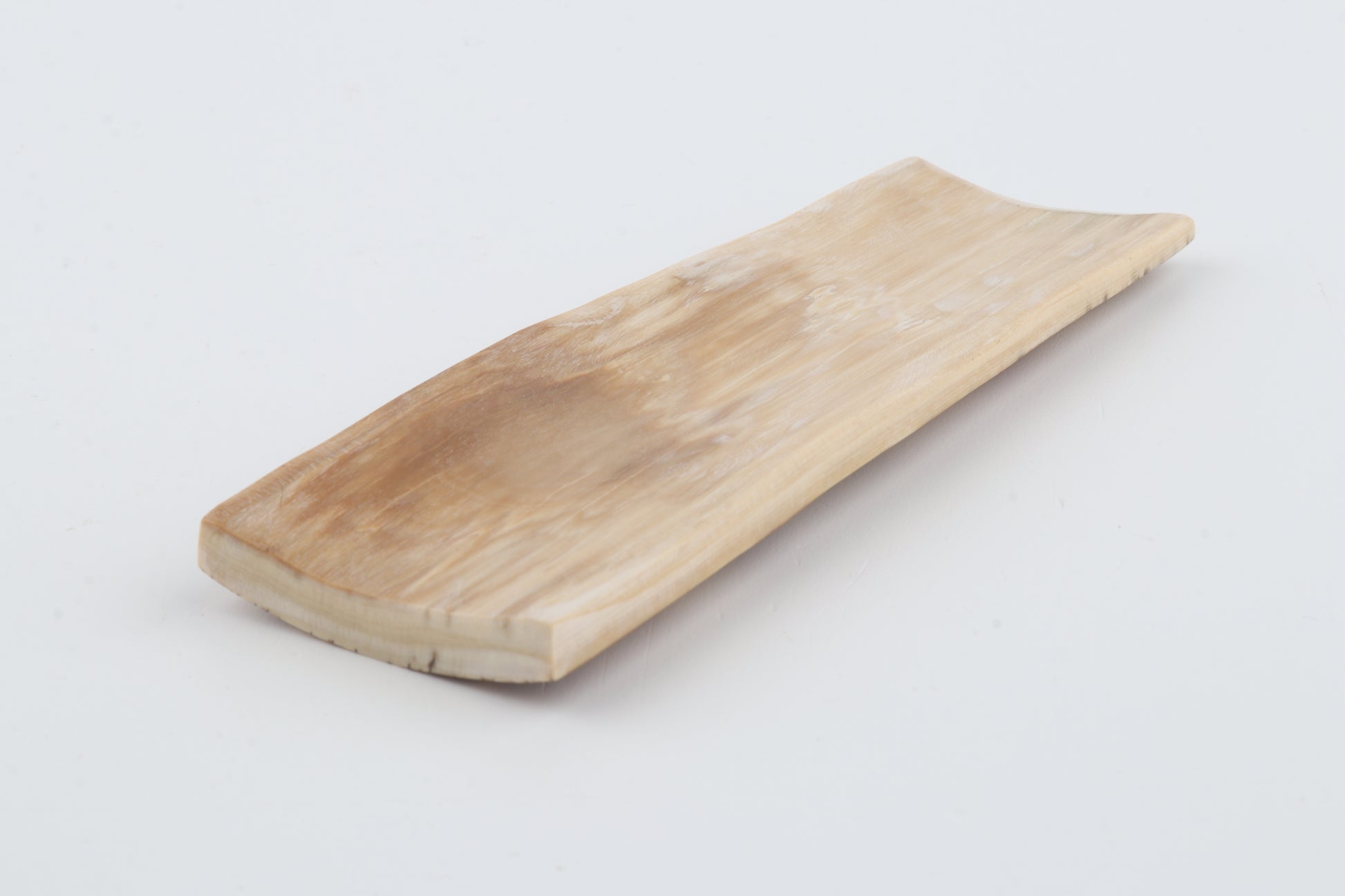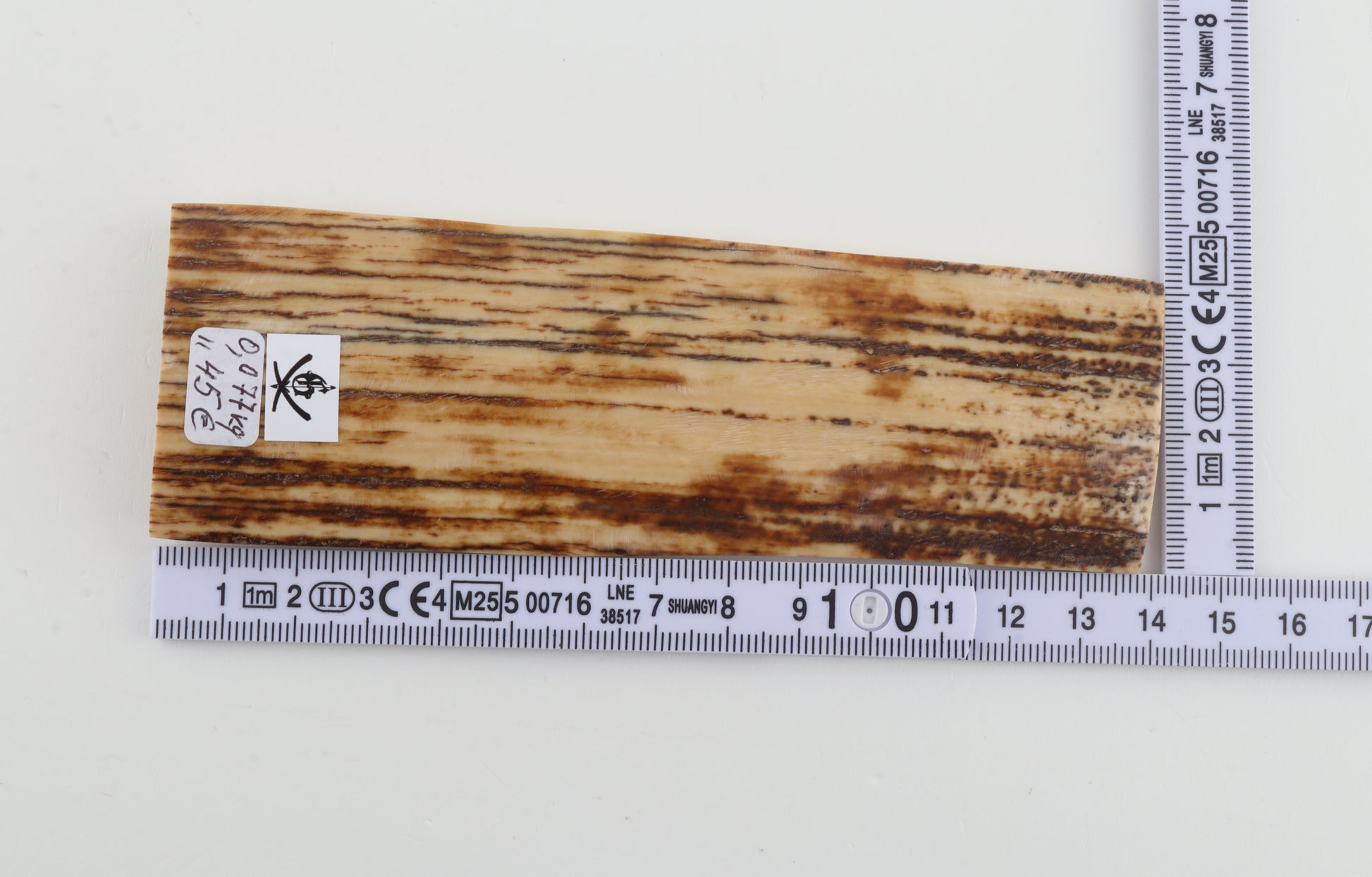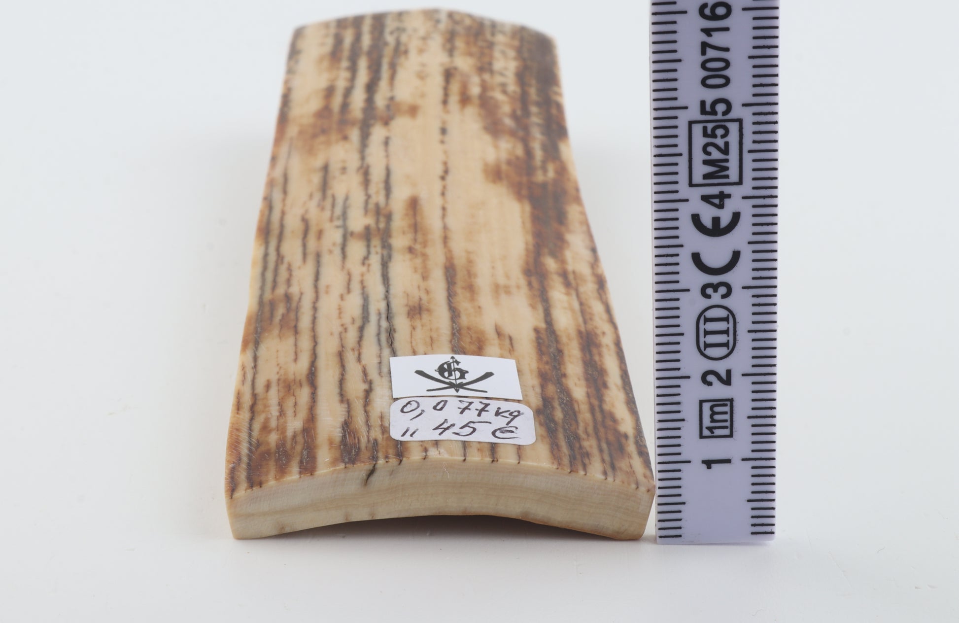 This is a premium-quality piece of Siberian woolly mammoth bark (Mammuthus primigenius). The ivory is naturally dense and solid, without cracks. Tapered width and thickness with usable reserves on both ends. One cross-cut section is slightly thicker and wider than the other. Reserves on both ends. Please carefully look at the pictures for precise dimensions. The natural colour of the bark is light beige to honey-colored, with medium to dark brown streaks running lengthwise.