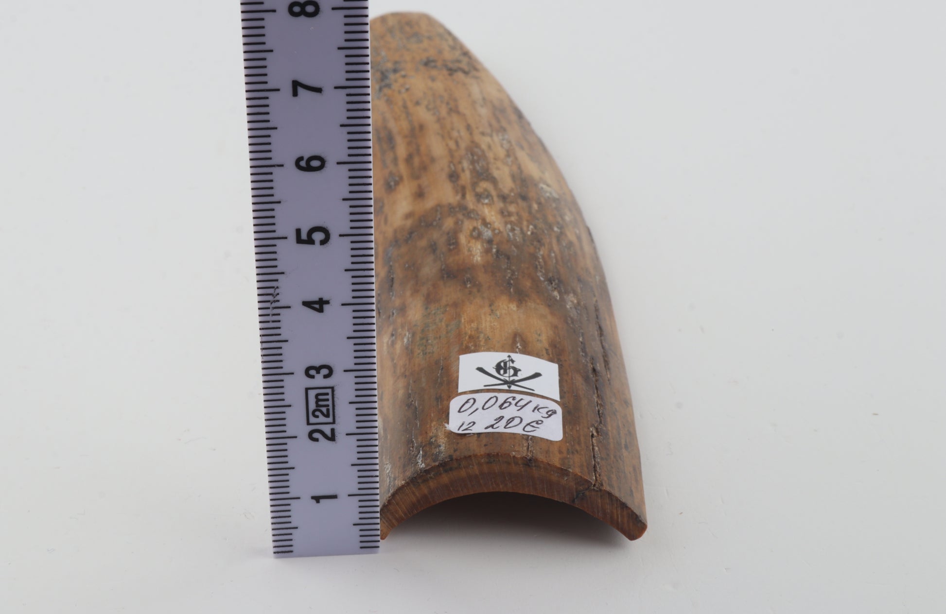 This is a premium-quality piece of Siberian woolly mammoth bark (Mammuthus primigenius). The ivory is naturally dense and solid, despite some small cracks. Tapered width and thickness with reserves on both ends: One cross-cut section is thicker and wider than the other. One side was cut at an angle - please carefully look at the pictures for precise dimensions. The natural colour of the bark is beige.