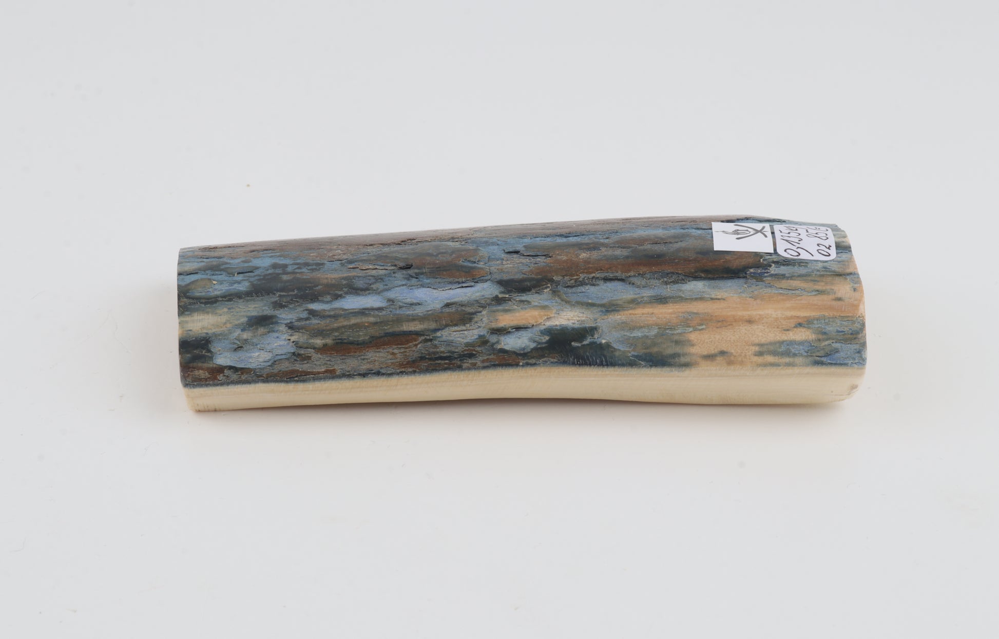 This is a premium-quality piece of Siberian woolly mammoth bark (Mammuthus primigenius). The ivory is naturally dense and solid, despite one small, non-penetrating crack on the underside. Tapered width and thickness with reserves on both ends: One cross-cut section is thicker and wider than the other. Please carefully look at the pictures for precise dimensions. The natural colour of the bark is blue-brown.