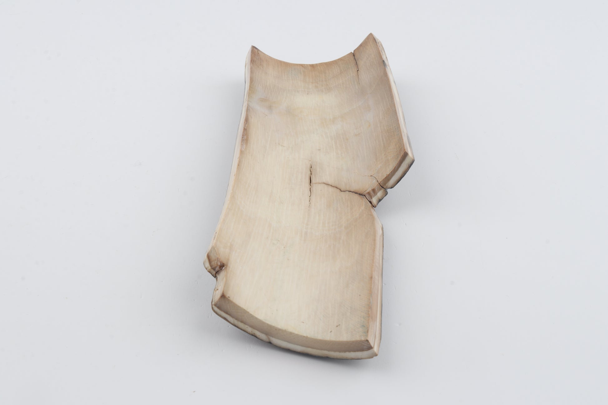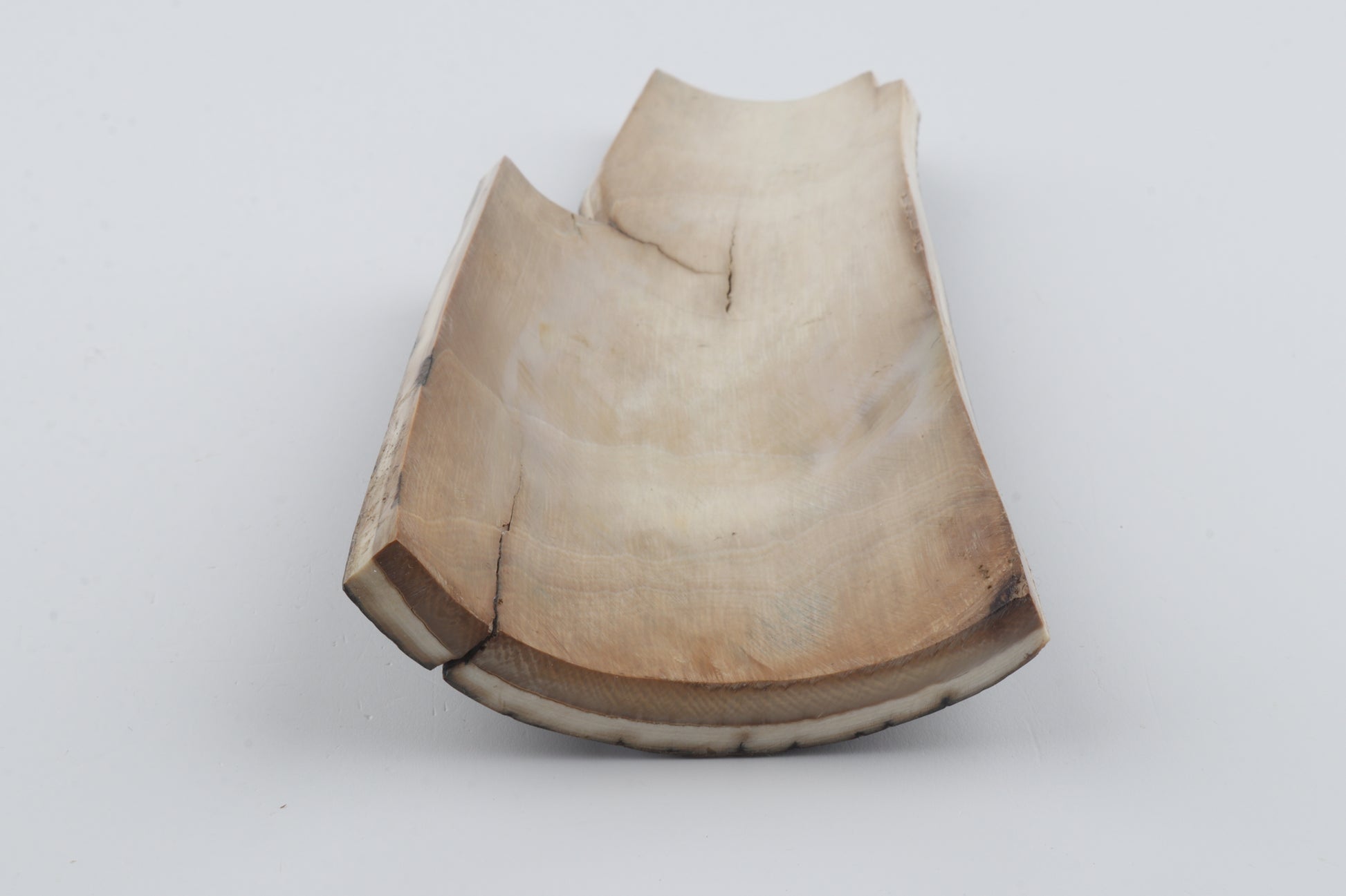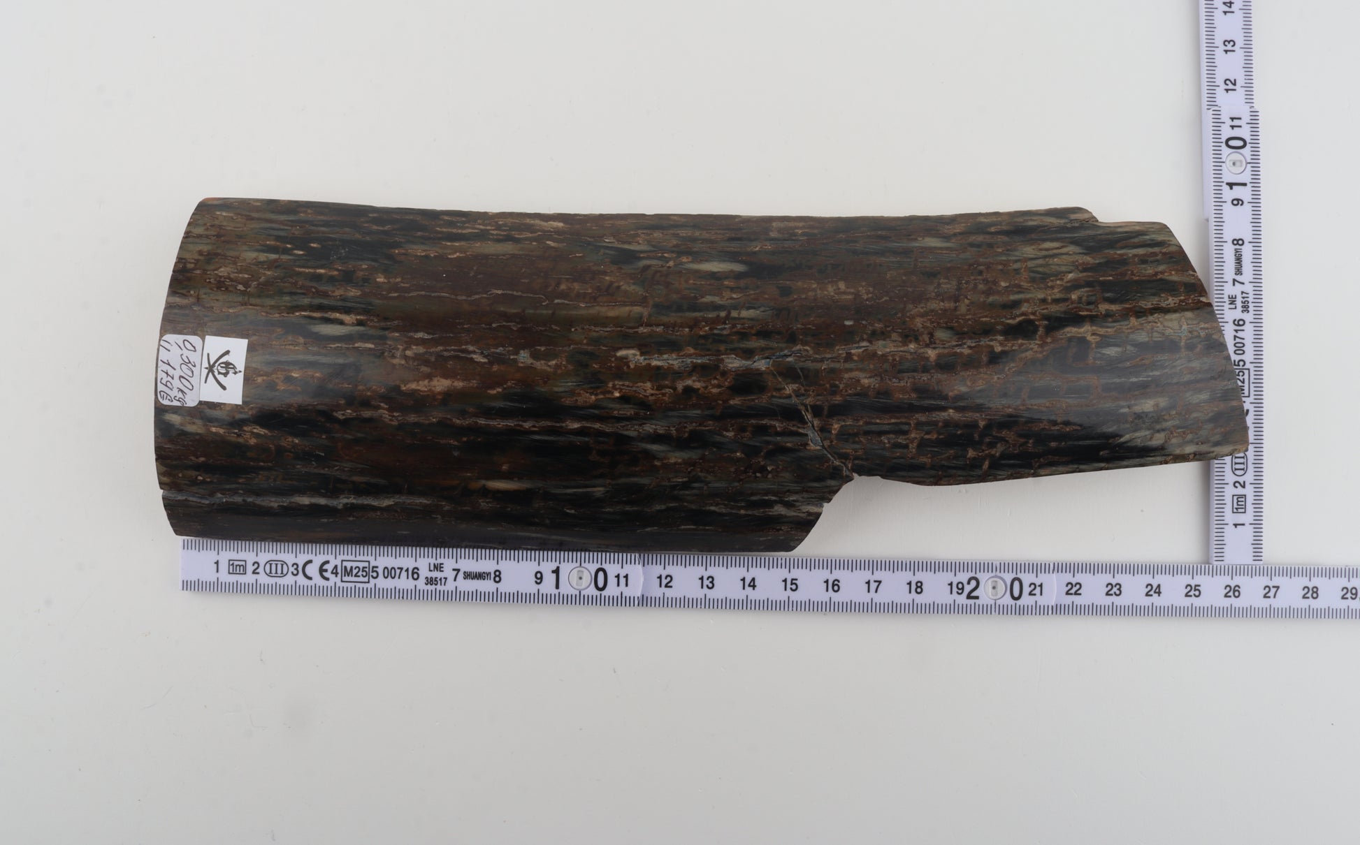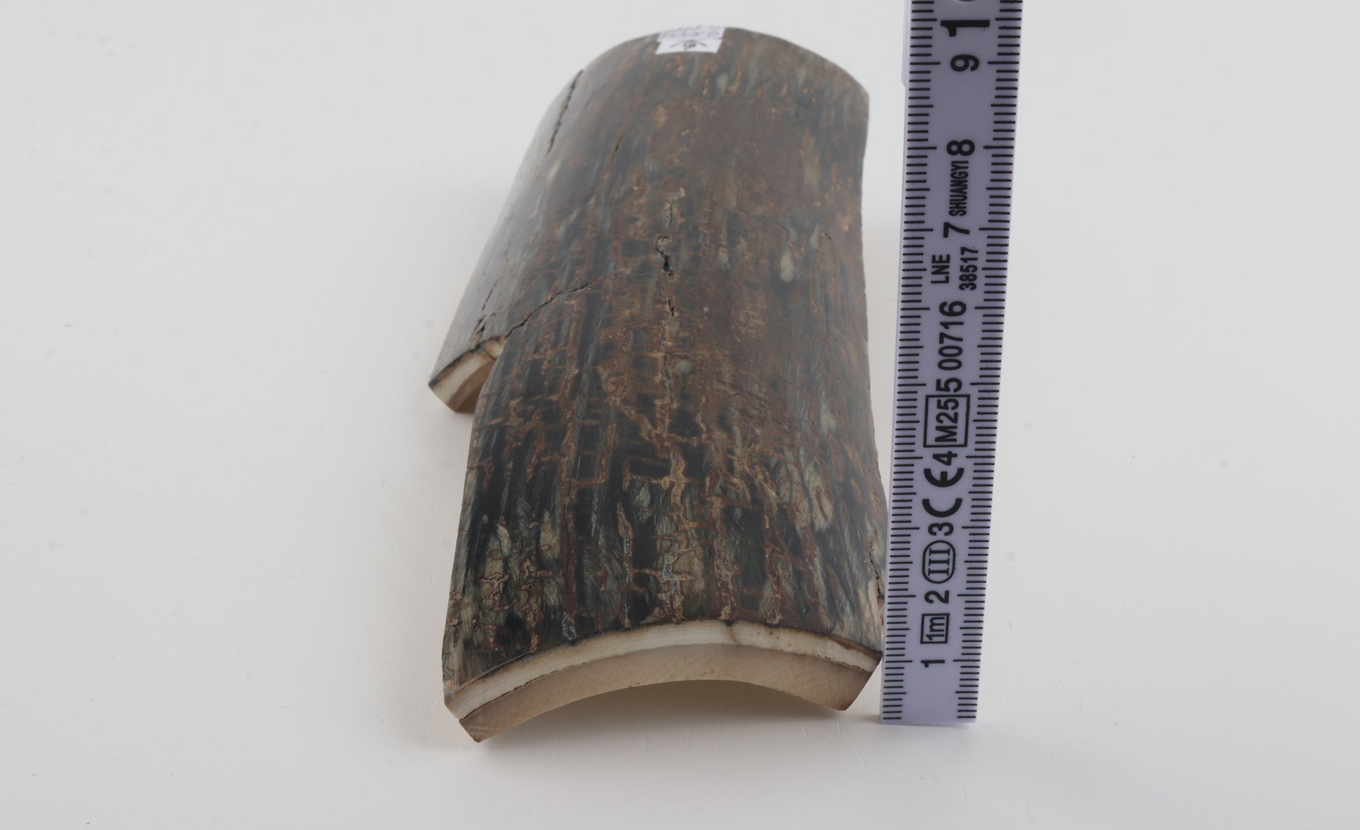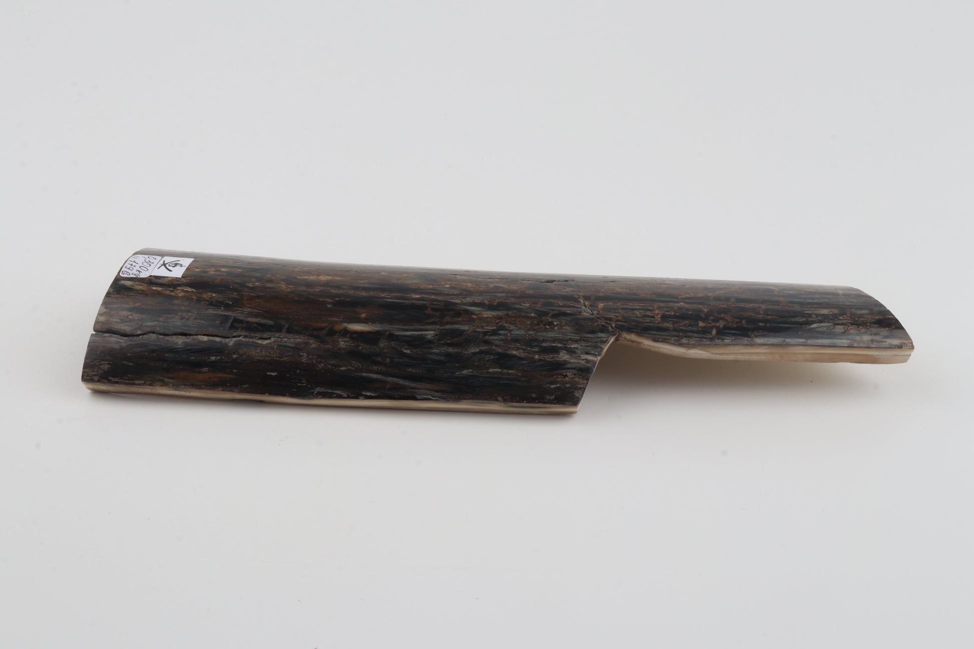 This is a premium-quality piece of Siberian woolly mammoth bark (Mammuthus primigenius). The ivory is naturally dense and solid, despite some small cracks. Tapered width and thickness with usable reserves on both ends: One cross-cut section is thicker and wider than the other. This piece was cut at an angle - please carefully look at the pictures for precise dimensions. The natural colour of the bark is dark brown overall, with streaks of black and greyish tones.