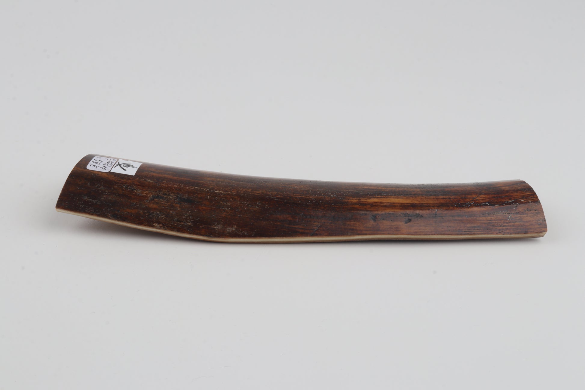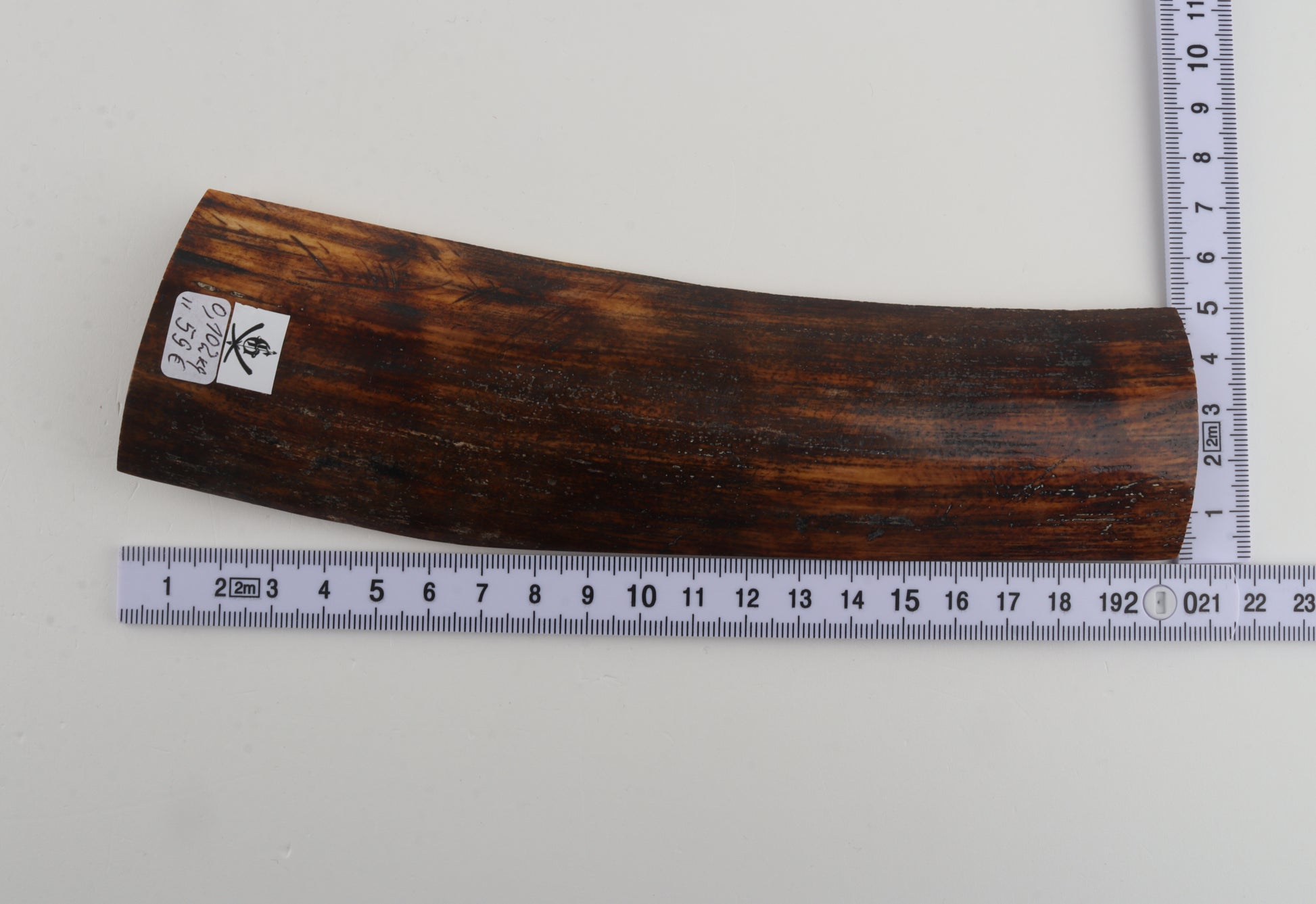 This is a premium-quality piece of Siberian woolly mammoth bark (Mammuthus primigenius). The ivory is naturally dense and solid, without cracks. Tapered width and thickness with reserves on both ends: One cross-cut section is thicker and wider than the other. Please carefully look at the pictures for precise dimensions. The natural colour of the bark is brown.