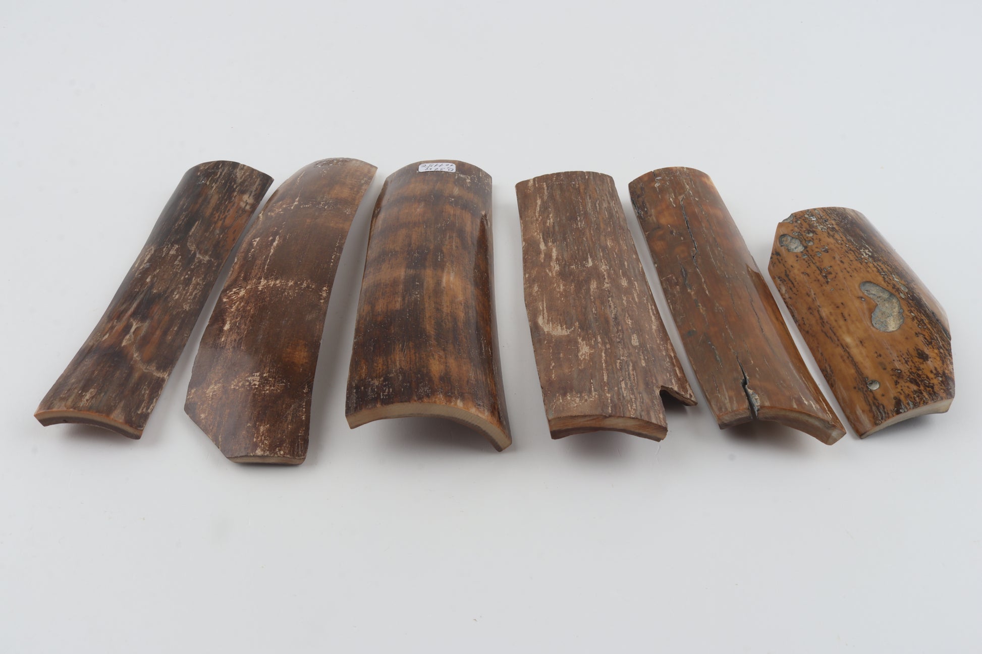 This lot consists of 6 natural Siberian woolly mammoth bark pieces (Mammuthus primigenius). Each piece was hand-selected to form a matching lot. Please carefully look at the pictures for precise dimensions. The colour of the bark is brown.