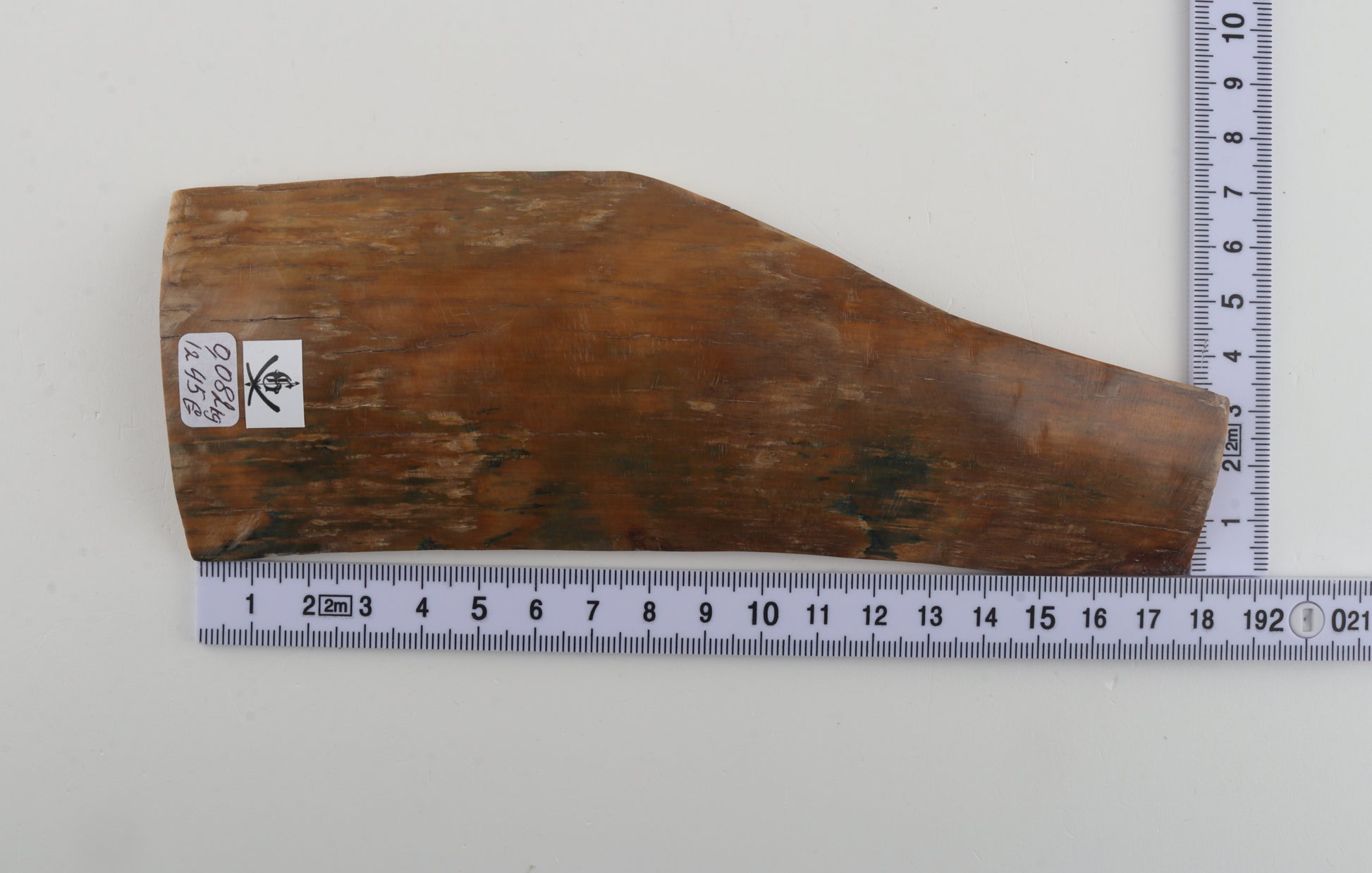 This is a premium-quality piece of Siberian woolly mammoth bark (Mammuthus primigenius). The ivory is naturally dense and solid, despite some small, non-penetrating cracks. Tapered width: One cross-cut section is wider than the other, because one side was cut at an angle. Consistent thickness with reserves on both ends. Please carefully look at the pictures for precise dimensions. The natural colour of the bark is caramel-blue.